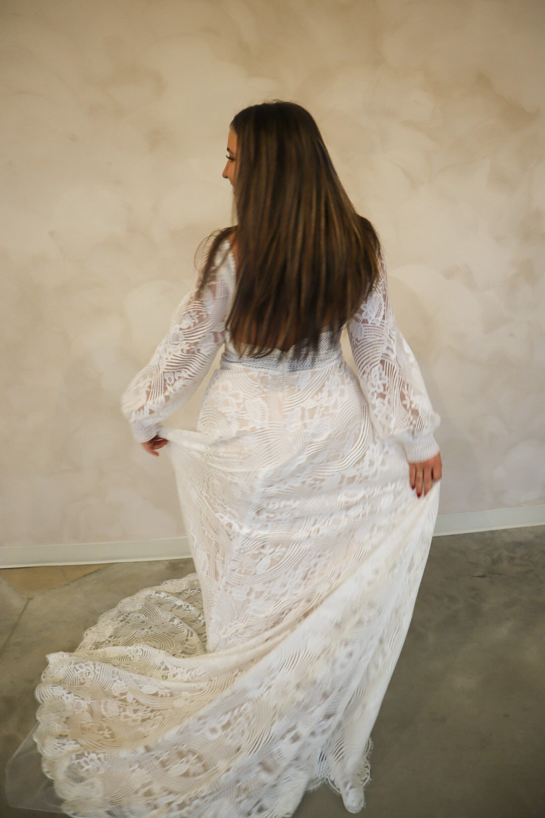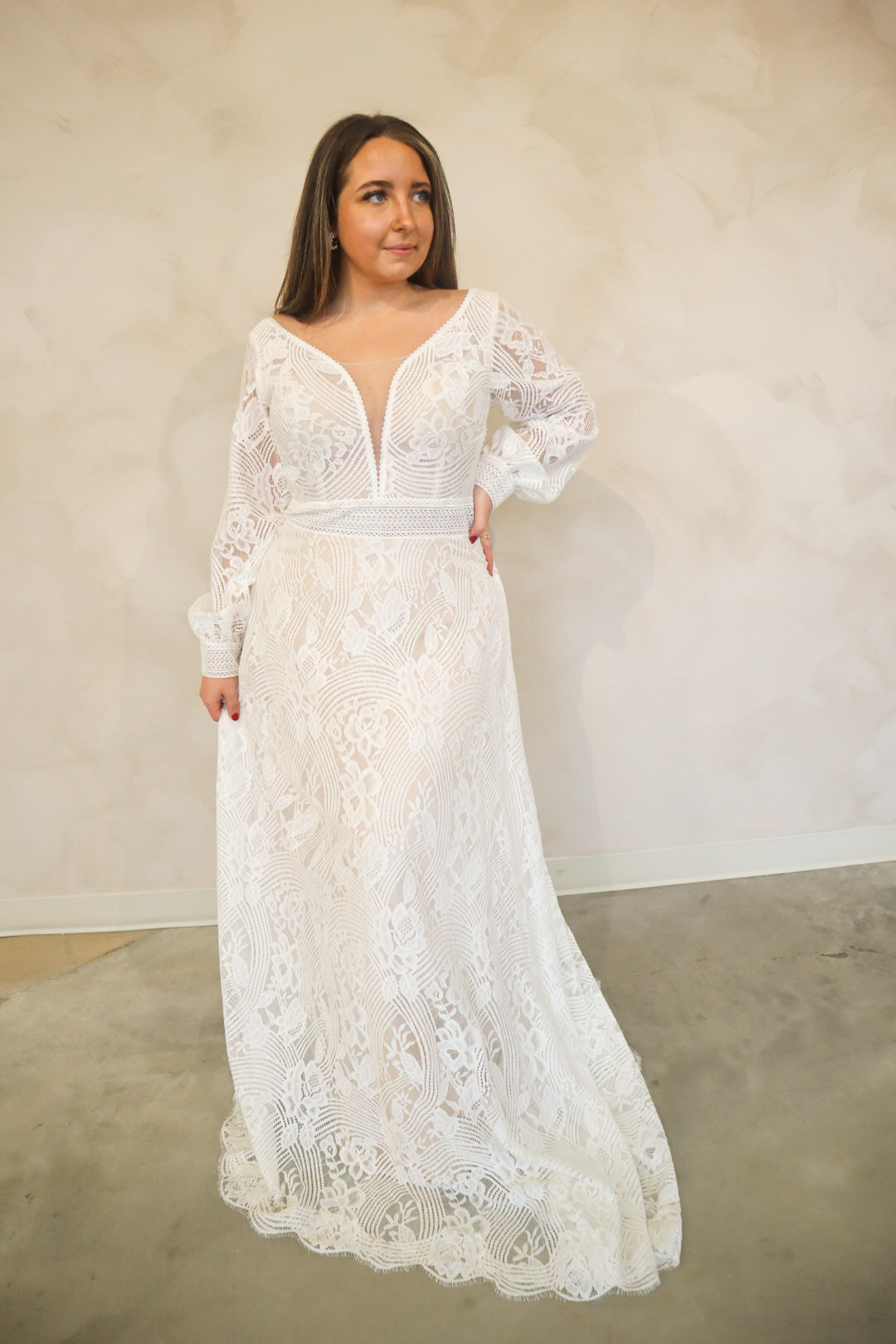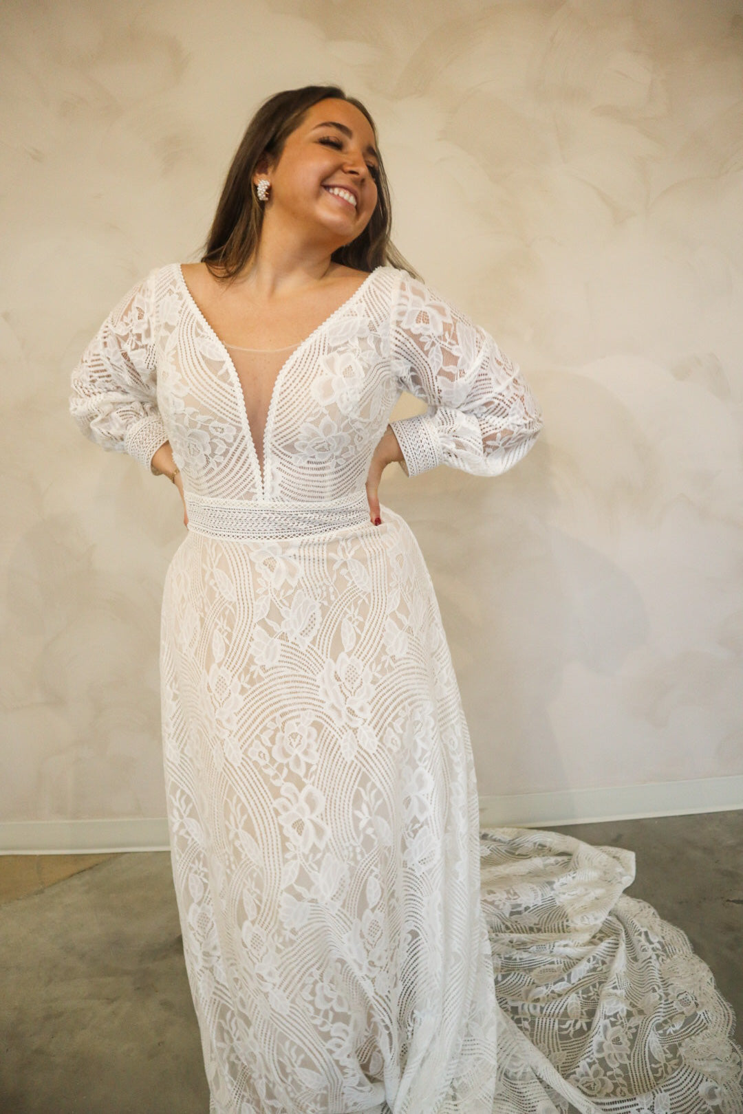 Introducing "Cece," a boho-inspired wedding gown adorned with intricate lace from top to bottom. This enchanting dress showcases a deep V-neckline and long bishop sleeves, embodying effortless elegance and free-spirited charm. Complete with a small train, "Cece" promises to captivate with its romantic allure, perfect for the bride embracing a bohemian aesthetic on her special day.