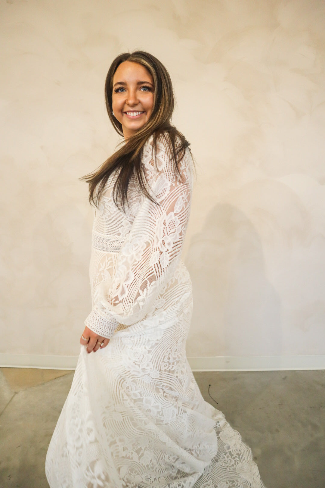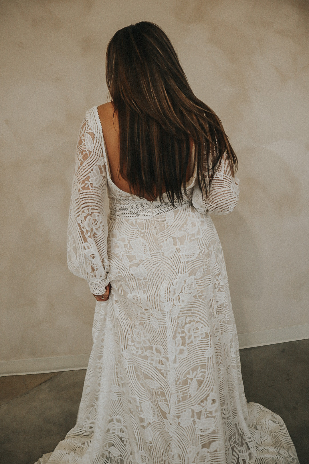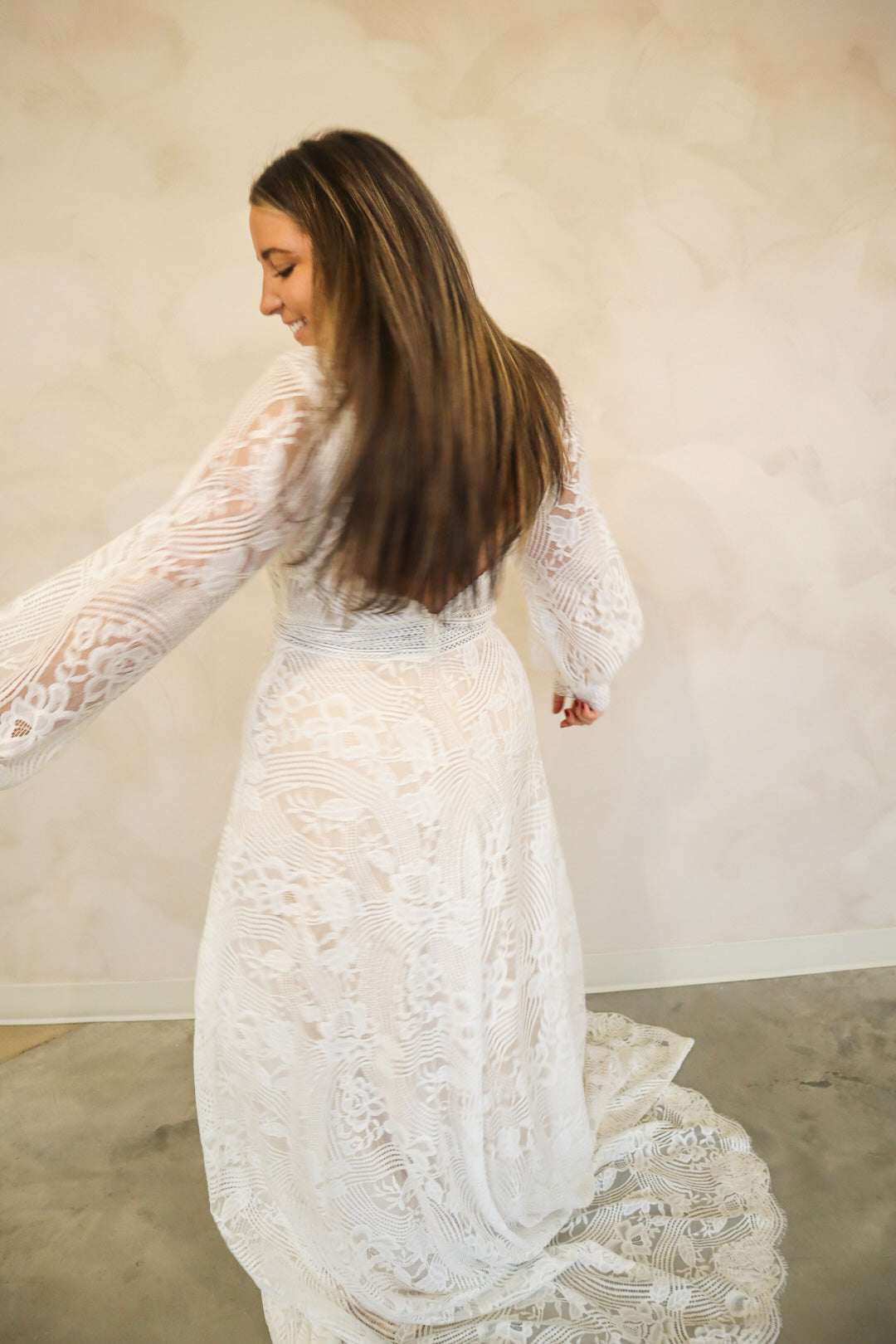 Introducing "Cece," a boho-inspired wedding gown adorned with intricate lace from top to bottom. This enchanting dress showcases a deep V-neckline and long bishop sleeves, embodying effortless elegance and free-spirited charm. Complete with a small train, "Cece" promises to captivate with its romantic allure, perfect for the bride embracing a bohemian aesthetic on her special day.