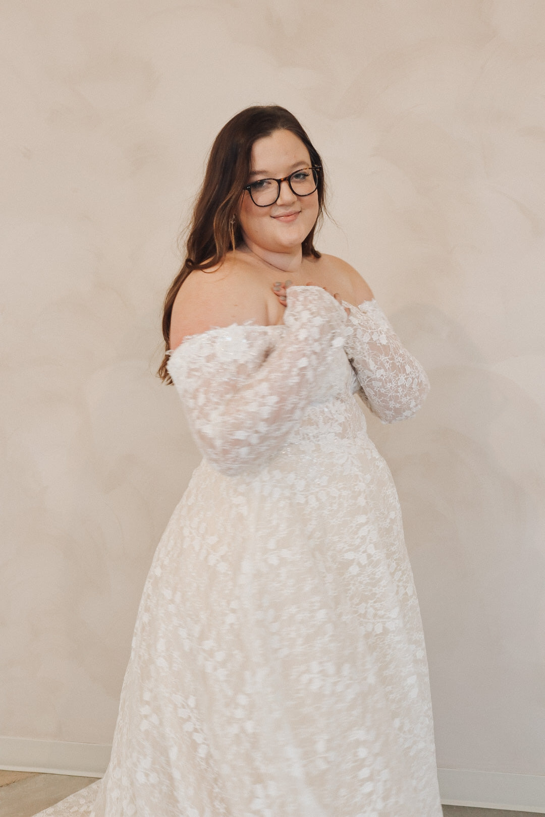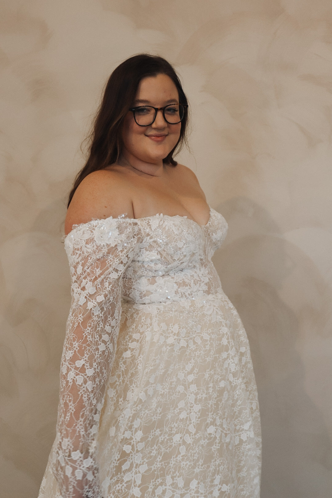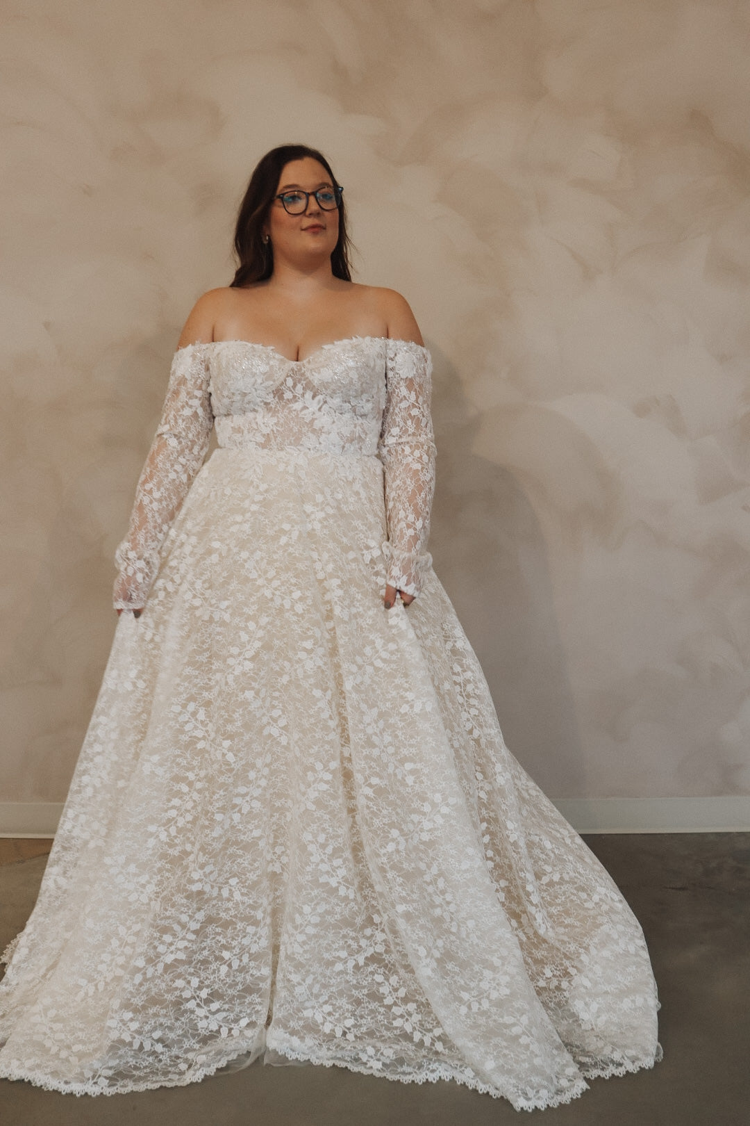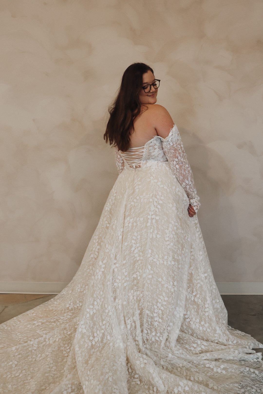 Introducing "Cleo"- This dress is a stunning fusion of classic elegance and modern romance. The off-the-shoulder neckline adds a soft, feminine touch, while the long lace sleeves create a vintage-inspired vibe that feels both timeless and on-trend. The intricate lace detailing throughout the dress gives it texture and depth, with a beautiful, flowing A-line skirt that offers a flattering silhouette. The lace continues down to the train, creating a romantic and dramatic finish. Ideal for a bride who wants a sophisticated yet ethereal look, this gown will make you feel elegant and graceful on your special day.