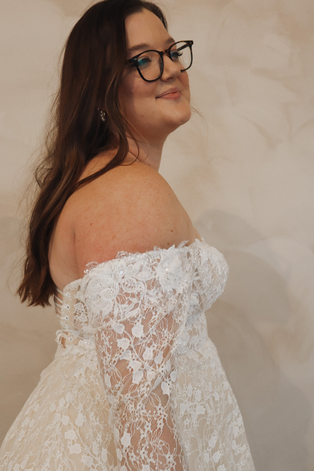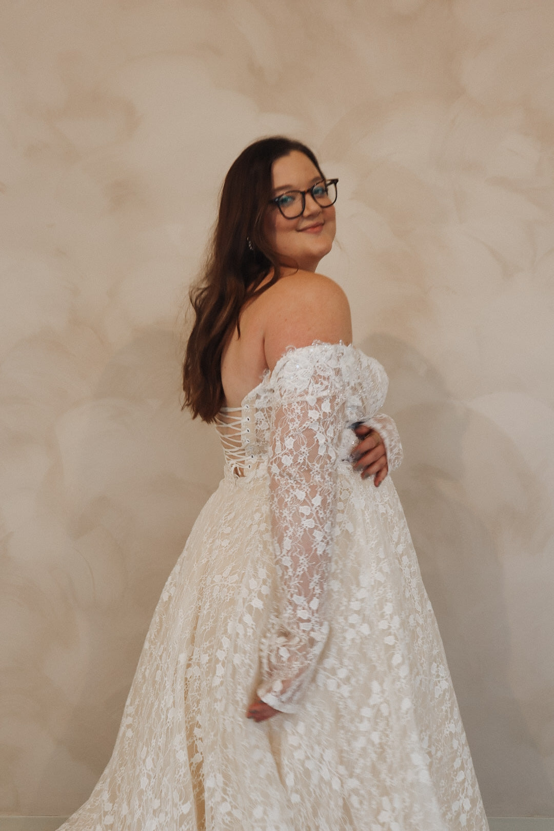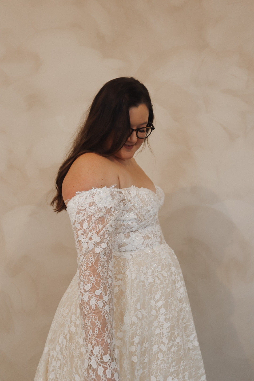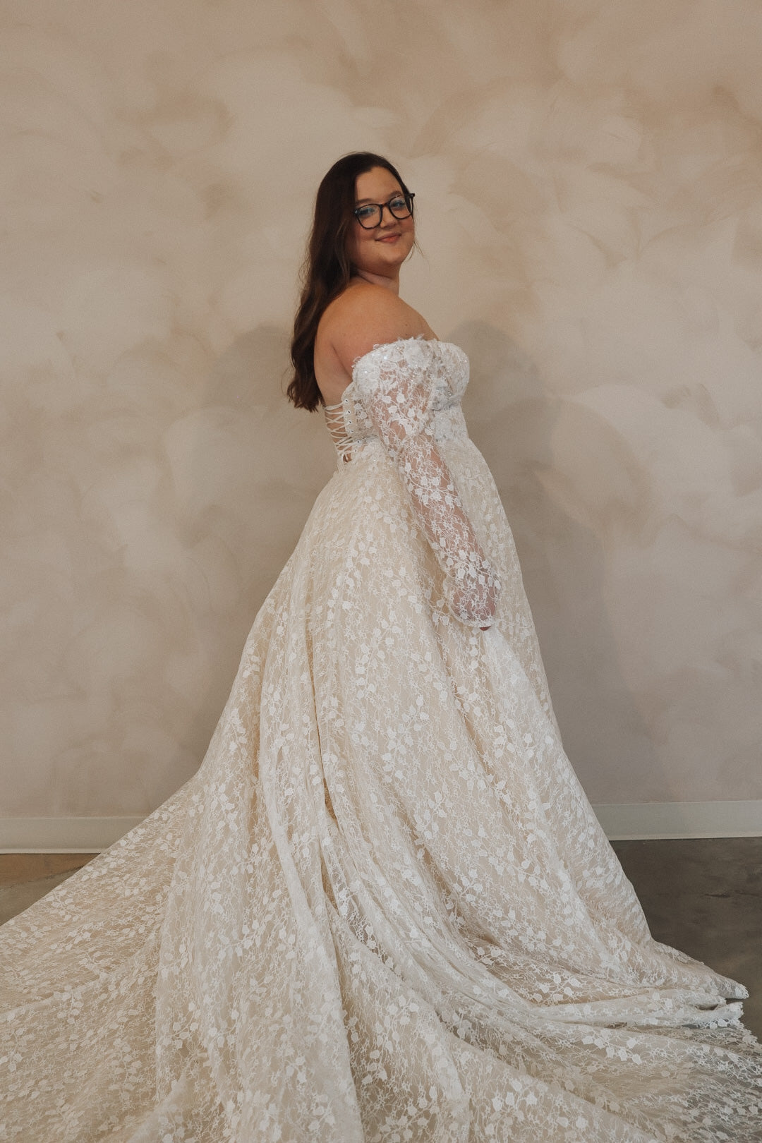 Introducing "Cleo"- This dress is a stunning fusion of classic elegance and modern romance. The off-the-shoulder neckline adds a soft, feminine touch, while the long lace sleeves create a vintage-inspired vibe that feels both timeless and on-trend. The intricate lace detailing throughout the dress gives it texture and depth, with a beautiful, flowing A-line skirt that offers a flattering silhouette. The lace continues down to the train, creating a romantic and dramatic finish. Ideal for a bride who wants a sophisticated yet ethereal look, this gown will make you feel elegant and graceful on your special day.