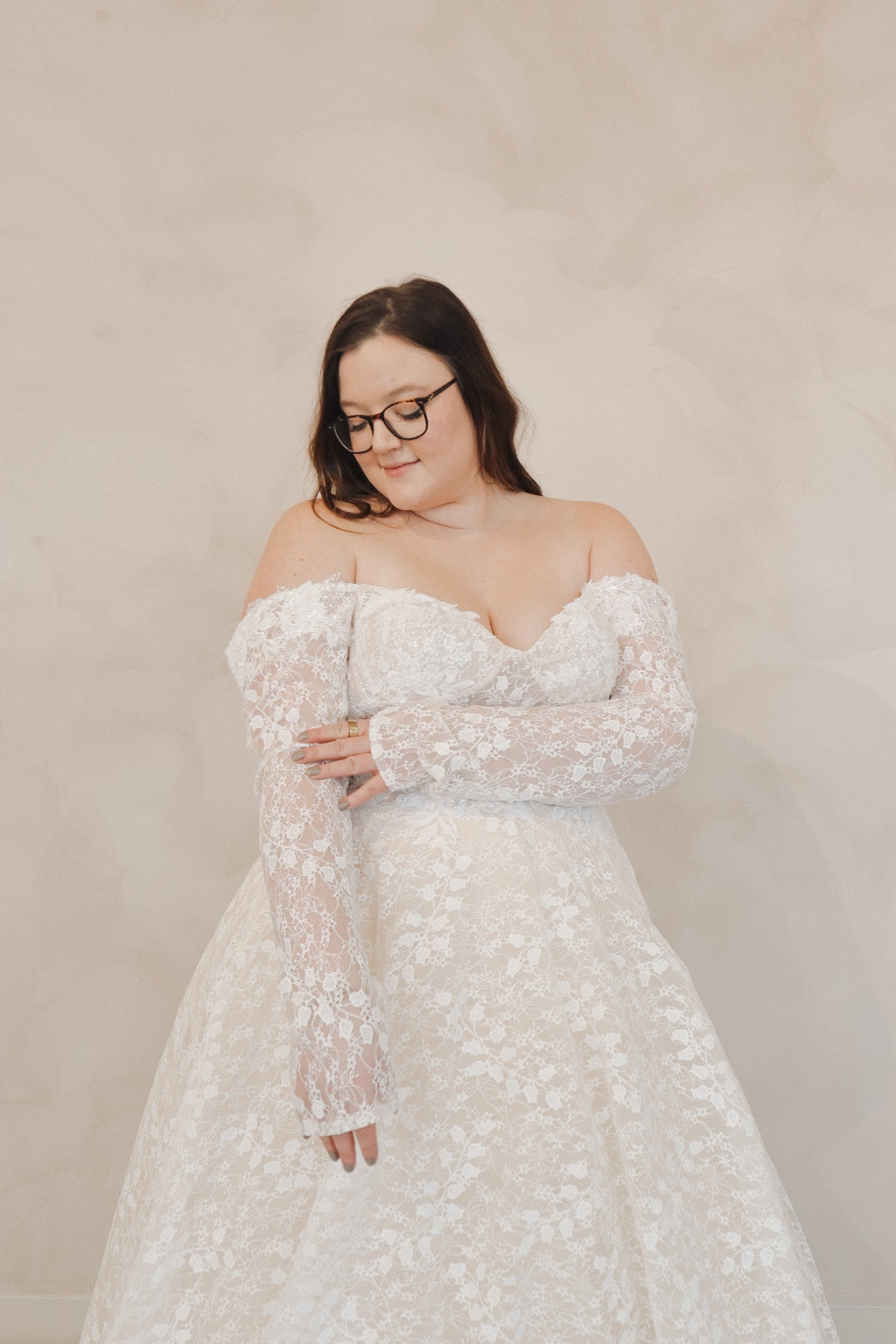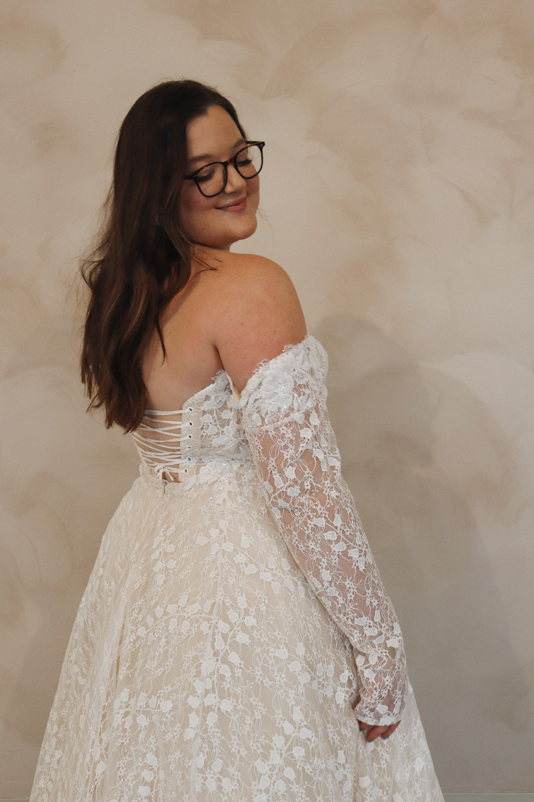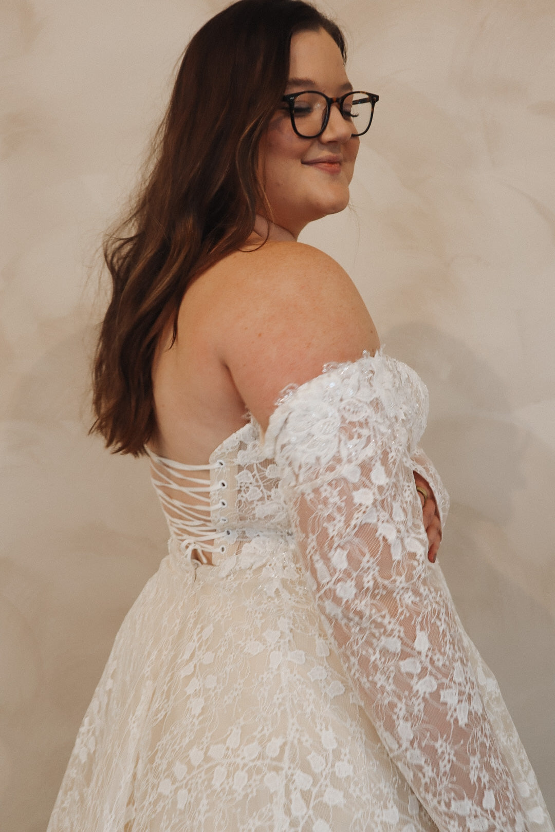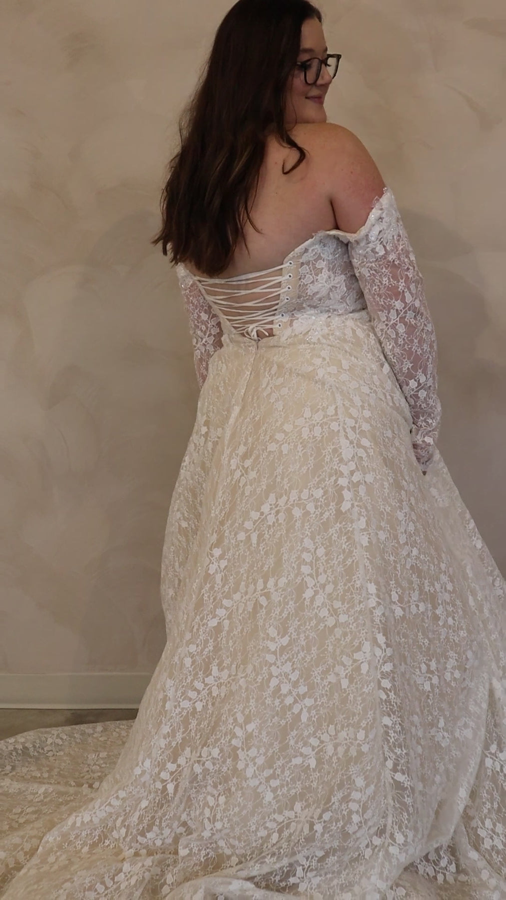 Introducing "Cleo"- This dress is a stunning fusion of classic elegance and modern romance. The off-the-shoulder neckline adds a soft, feminine touch, while the long lace sleeves create a vintage-inspired vibe that feels both timeless and on-trend. The intricate lace detailing throughout the dress gives it texture and depth, with a beautiful, flowing A-line skirt that offers a flattering silhouette. The lace continues down to the train, creating a romantic and dramatic finish. Ideal for a bride who wants a sophisticated yet ethereal look, this gown will make you feel elegant and graceful on your special day.