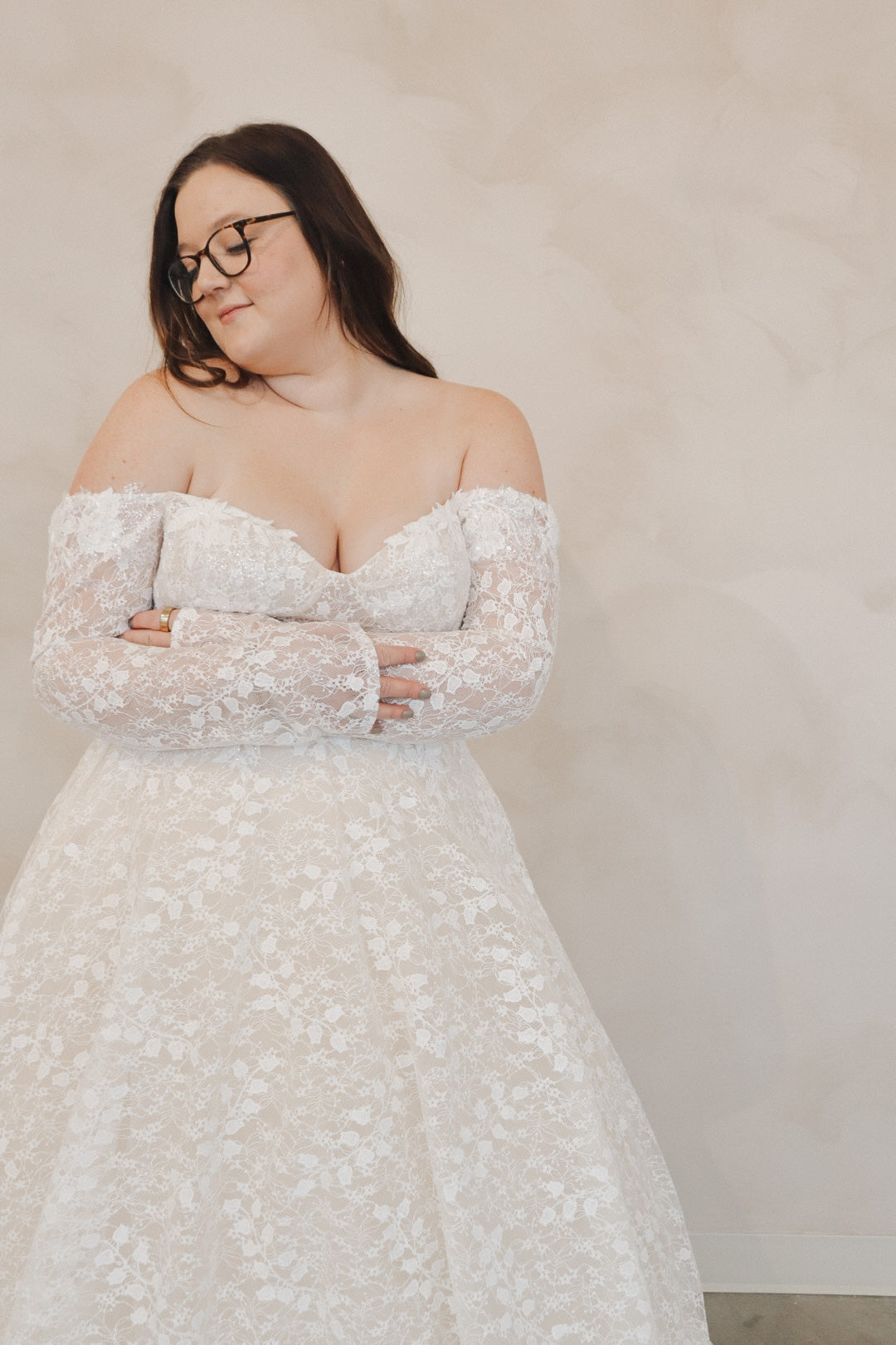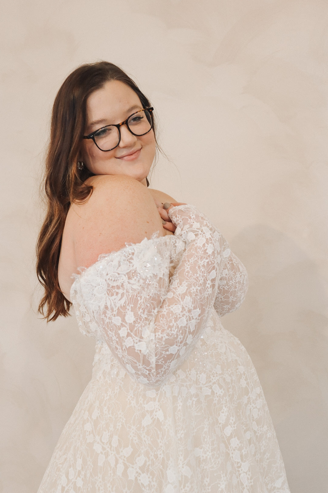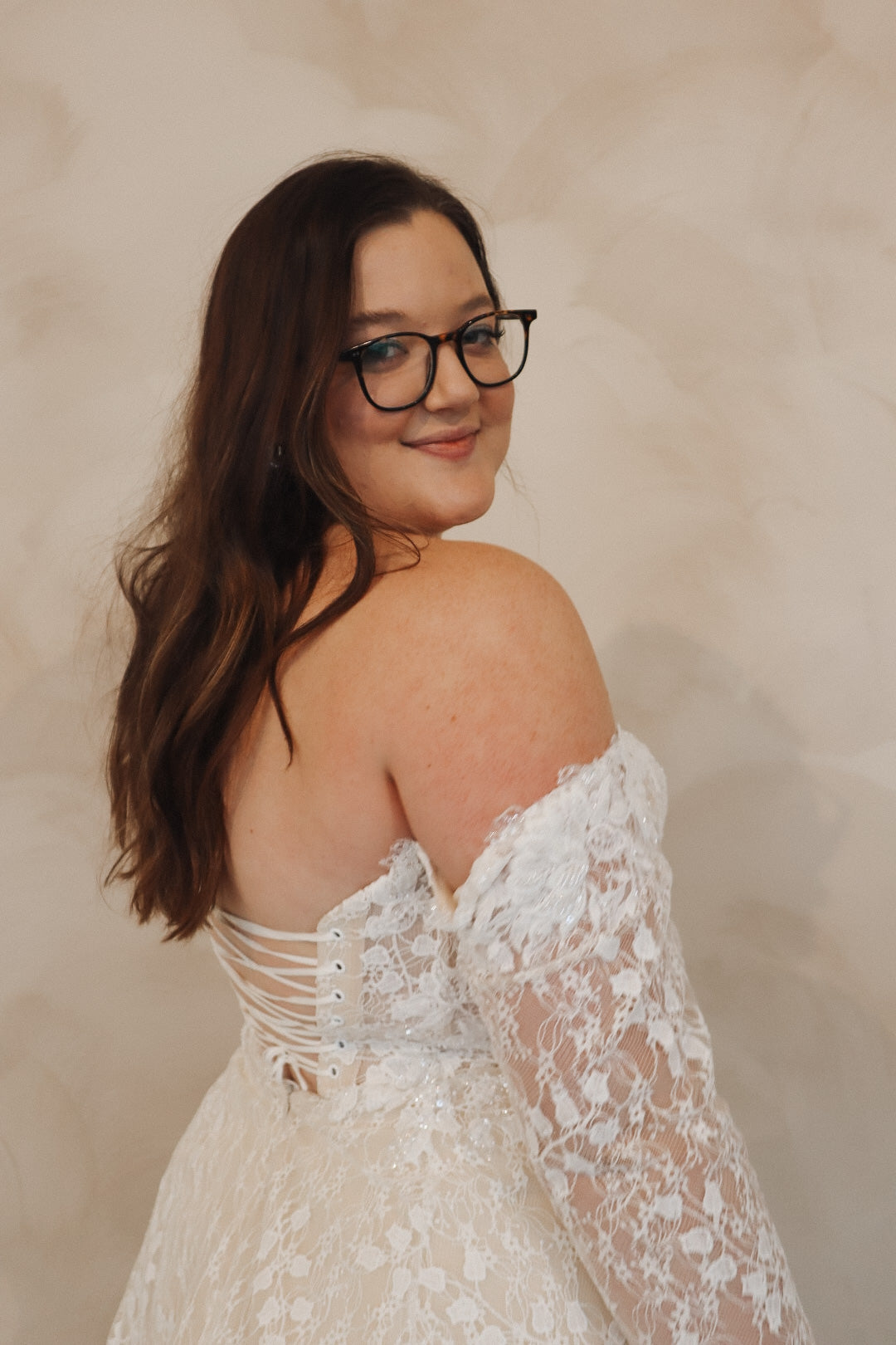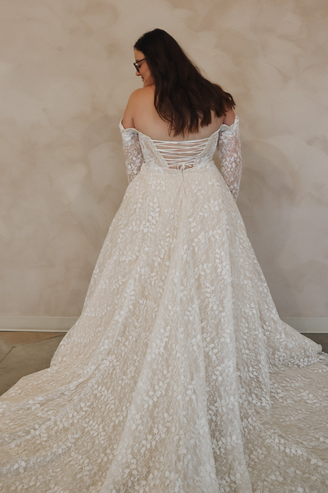 Introducing "Cleo"- This dress is a stunning fusion of classic elegance and modern romance. The off-the-shoulder neckline adds a soft, feminine touch, while the long lace sleeves create a vintage-inspired vibe that feels both timeless and on-trend. The intricate lace detailing throughout the dress gives it texture and depth, with a beautiful, flowing A-line skirt that offers a flattering silhouette. The lace continues down to the train, creating a romantic and dramatic finish. Ideal for a bride who wants a sophisticated yet ethereal look, this gown will make you feel elegant and graceful on your special day.