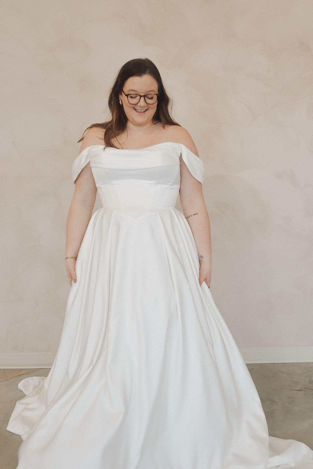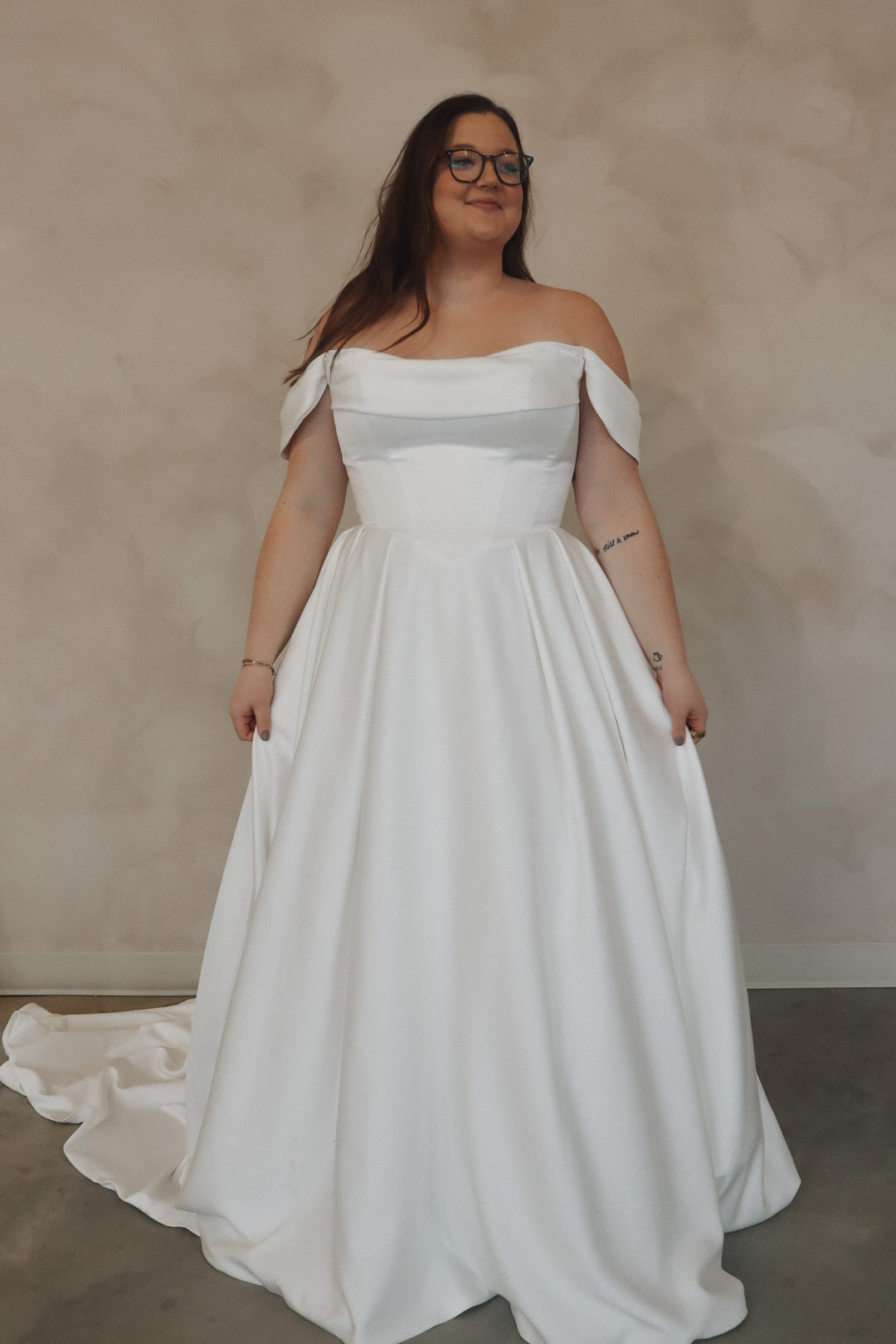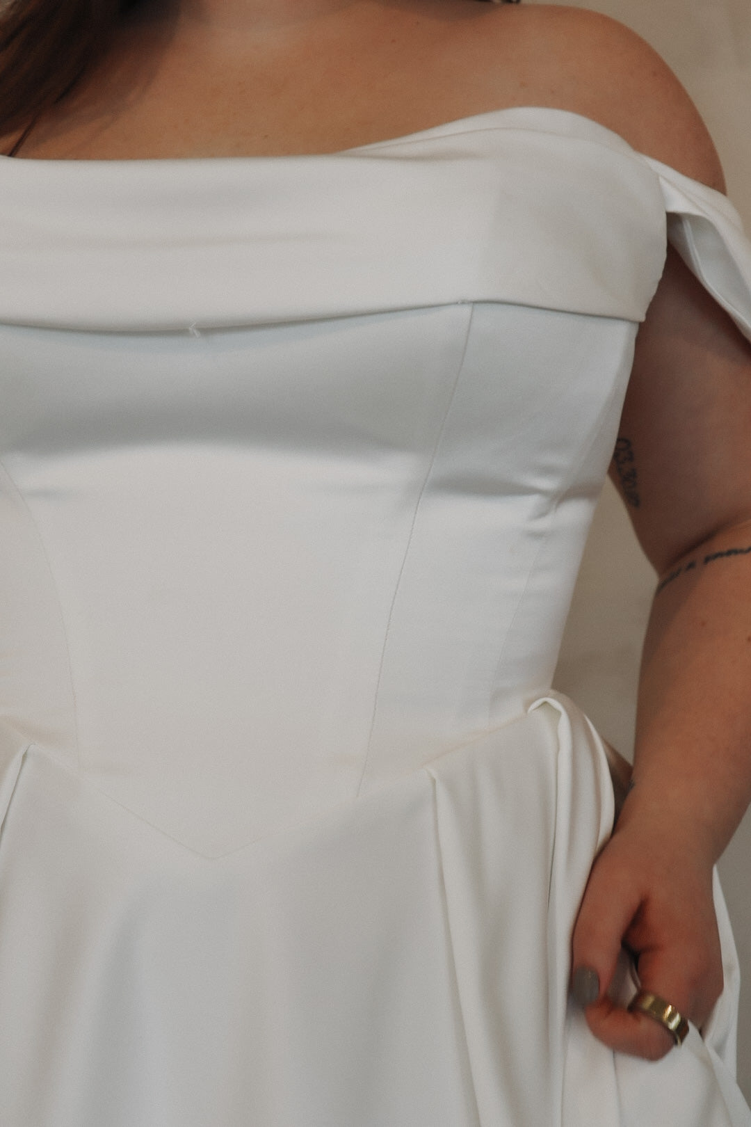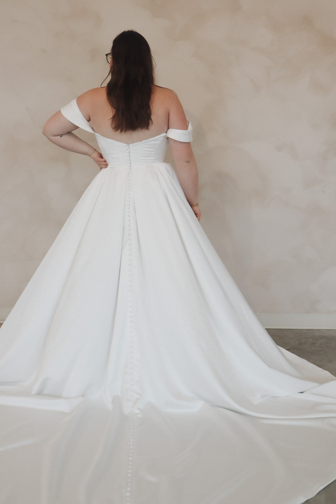 Introducing "Della"- This dress is a stunning example of bridal elegance with a touch of classic glamour. The off-the-shoulder design creates a beautifully romantic look, while the structured bodice highlights the waist and offers a timeless silhouette. The luxurious satin fabric adds a rich shine, giving the dress a sophisticated and refined feel. The full skirt flows effortlessly, creating movement and drama as you walk. Perfect for the bride who loves vintage-inspired styles with a modern twist, this gown radiates beauty and confidence on your special day.