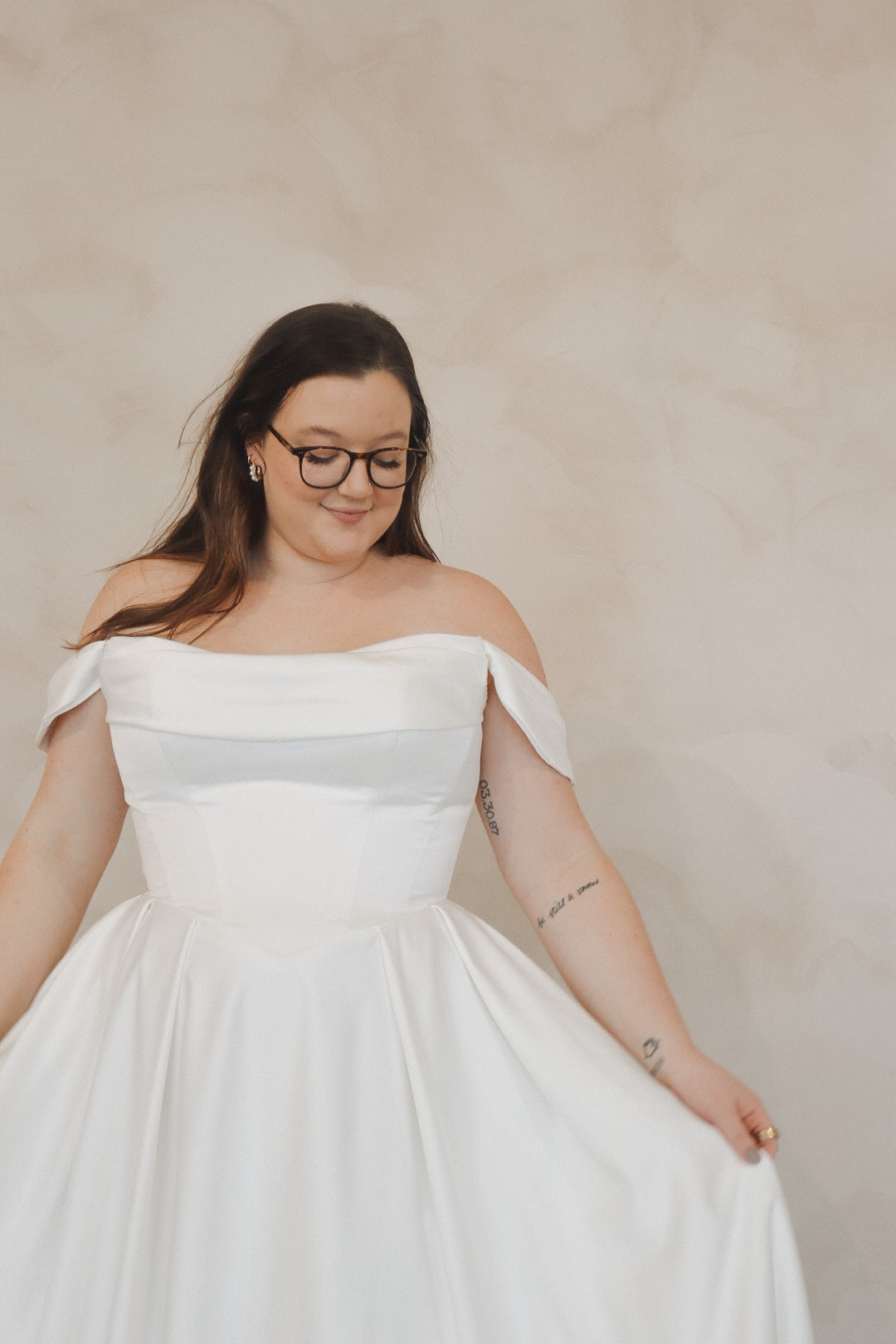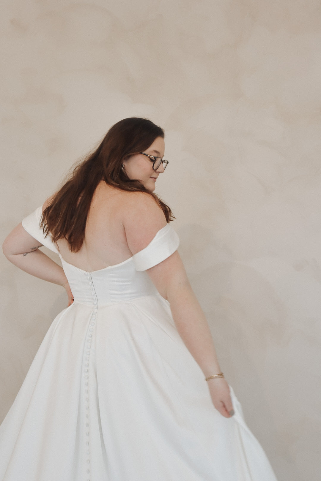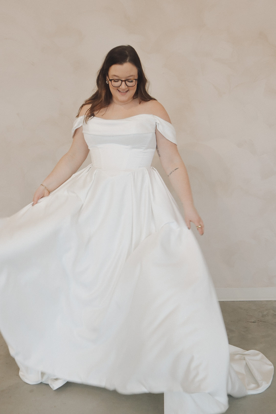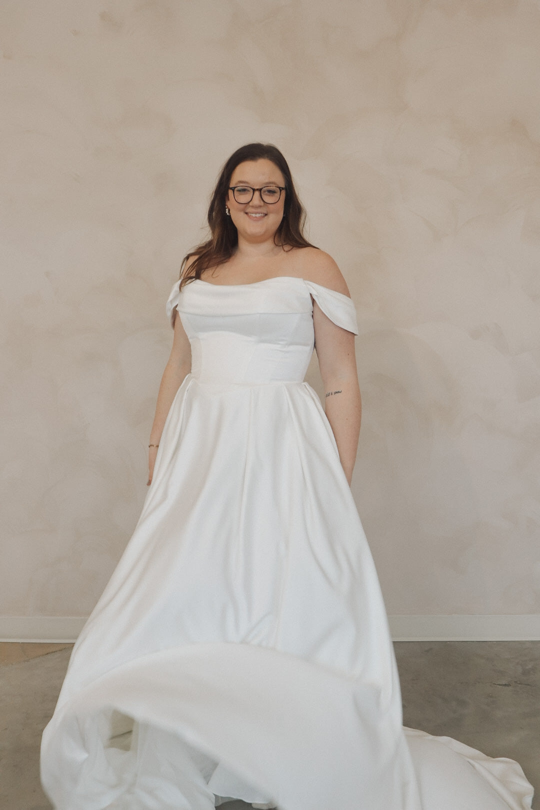 Introducing "Della"- This dress is a stunning example of bridal elegance with a touch of classic glamour. The off-the-shoulder design creates a beautifully romantic look, while the structured bodice highlights the waist and offers a timeless silhouette. The luxurious satin fabric adds a rich shine, giving the dress a sophisticated and refined feel. The full skirt flows effortlessly, creating movement and drama as you walk. Perfect for the bride who loves vintage-inspired styles with a modern twist, this gown radiates beauty and confidence on your special day.