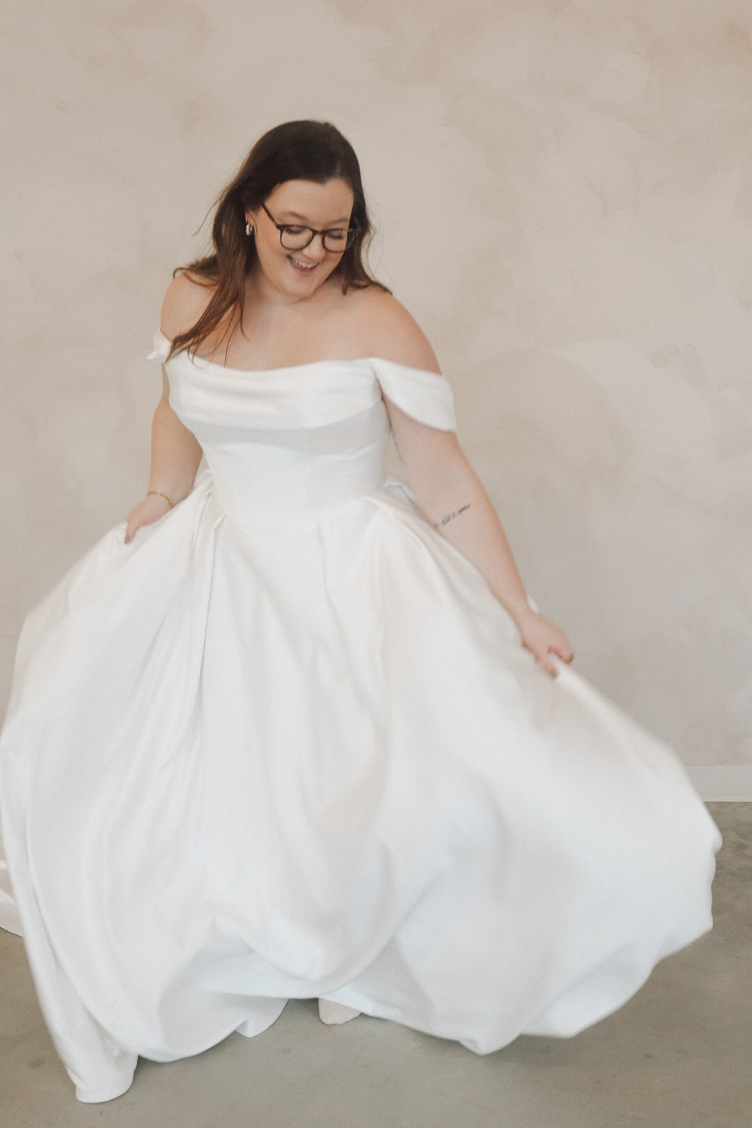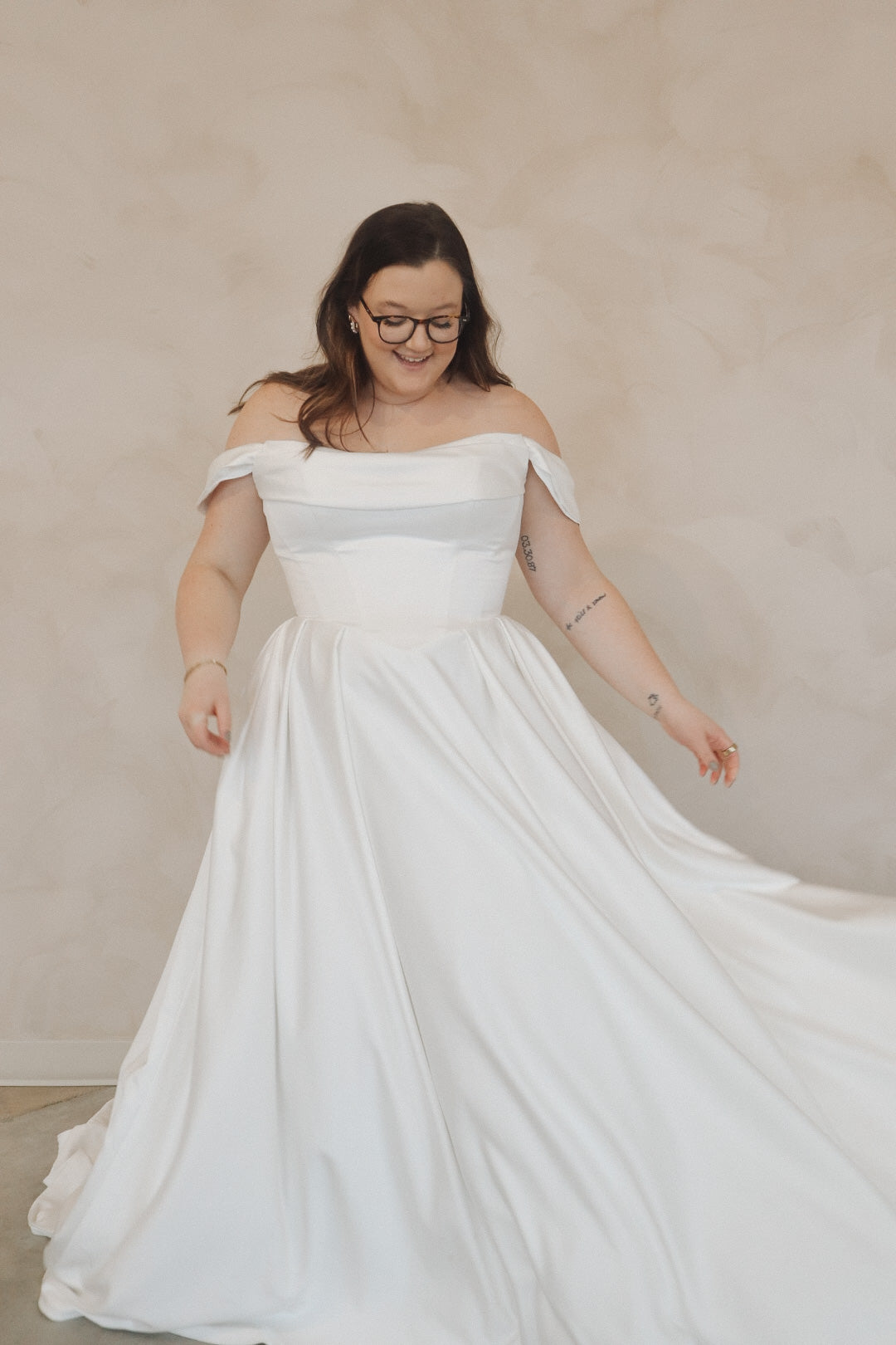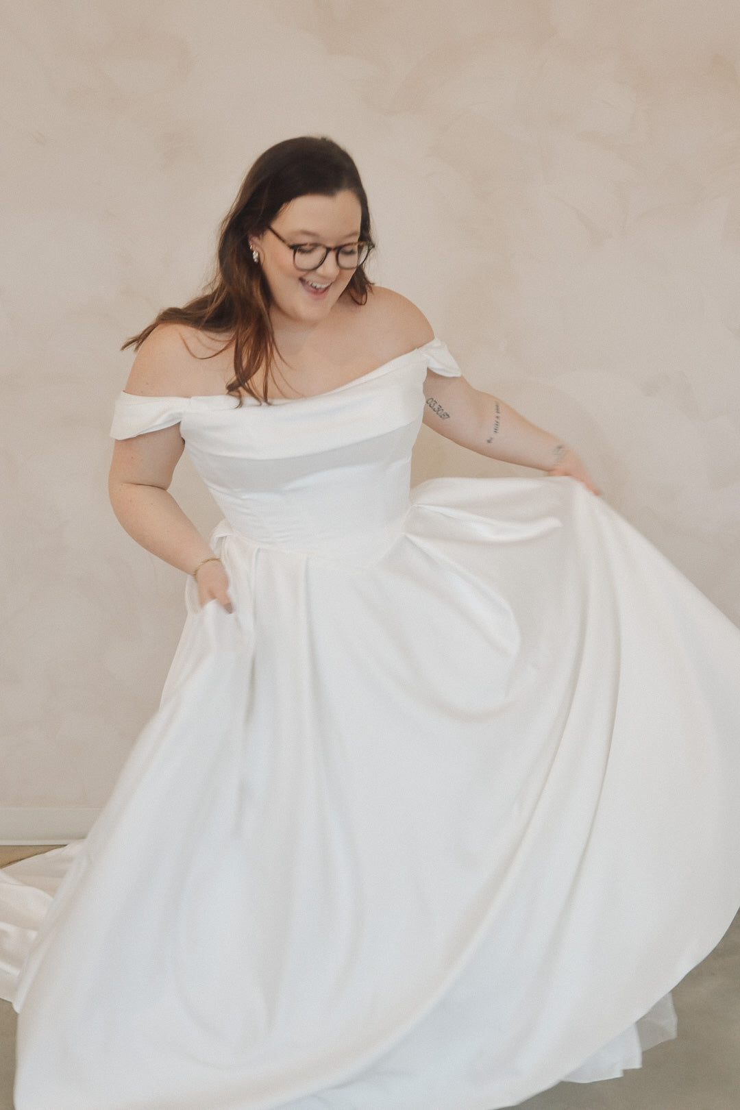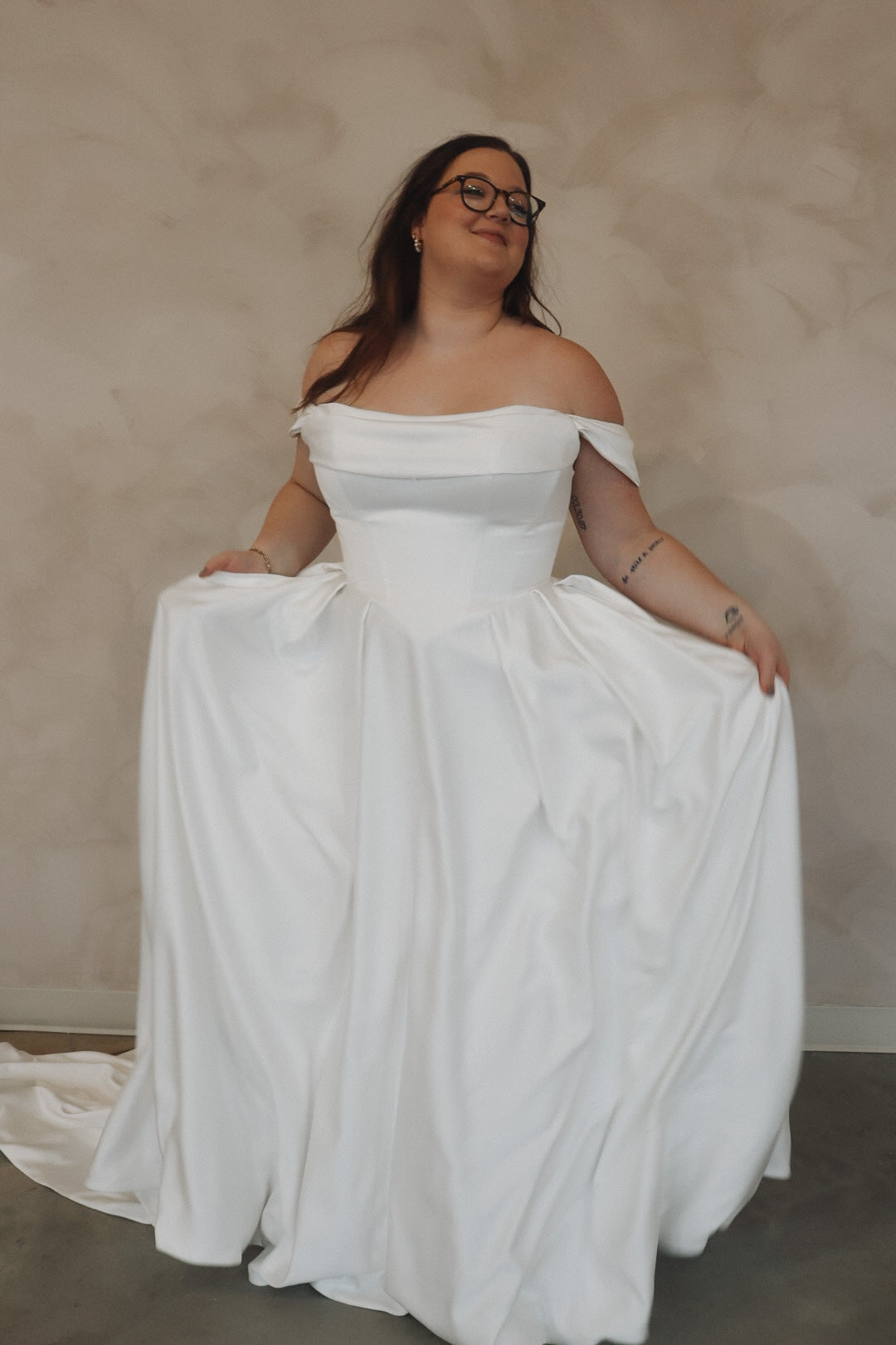 Introducing "Della"- This dress is a stunning example of bridal elegance with a touch of classic glamour. The off-the-shoulder design creates a beautifully romantic look, while the structured bodice highlights the waist and offers a timeless silhouette. The luxurious satin fabric adds a rich shine, giving the dress a sophisticated and refined feel. The full skirt flows effortlessly, creating movement and drama as you walk. Perfect for the bride who loves vintage-inspired styles with a modern twist, this gown radiates beauty and confidence on your special day.