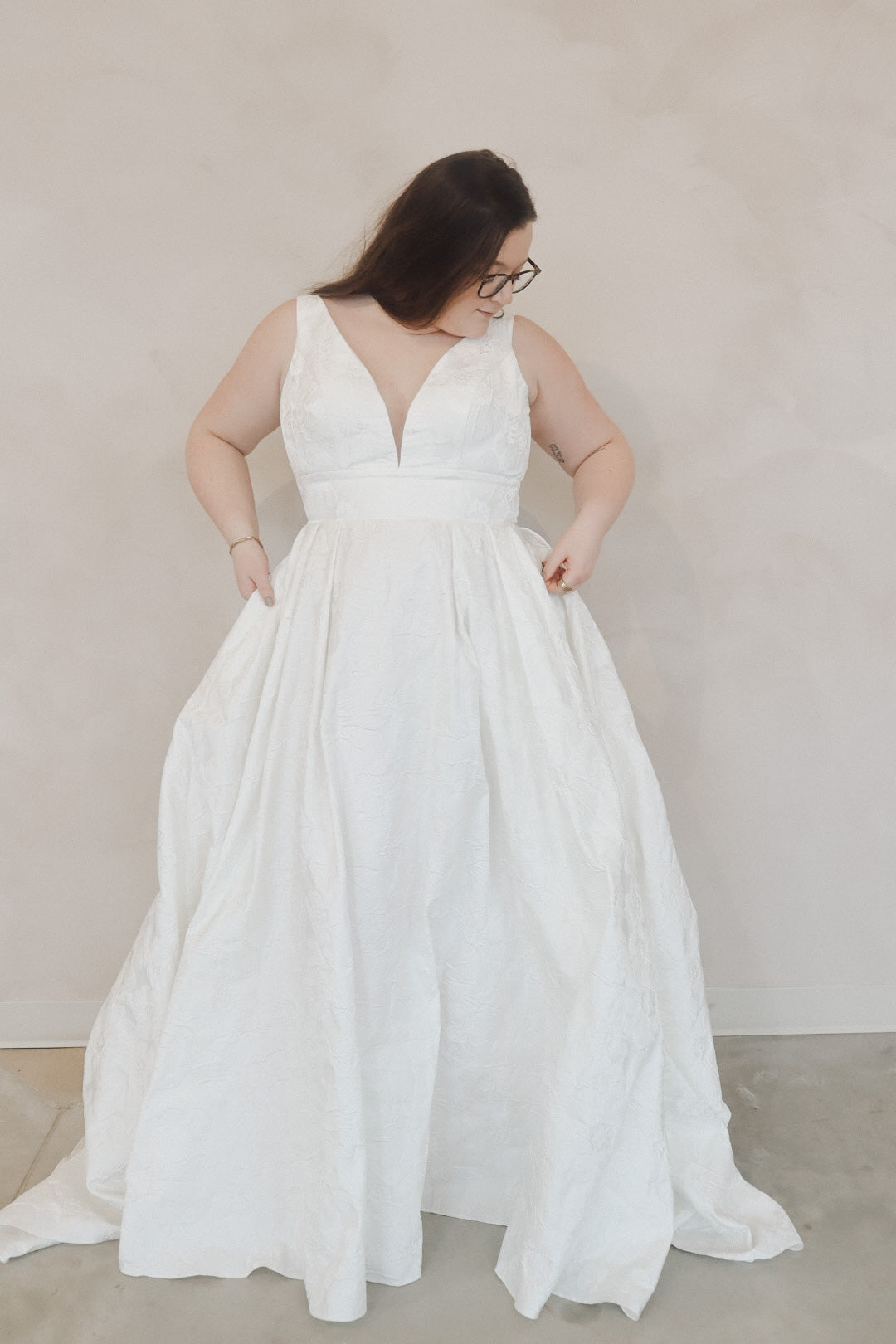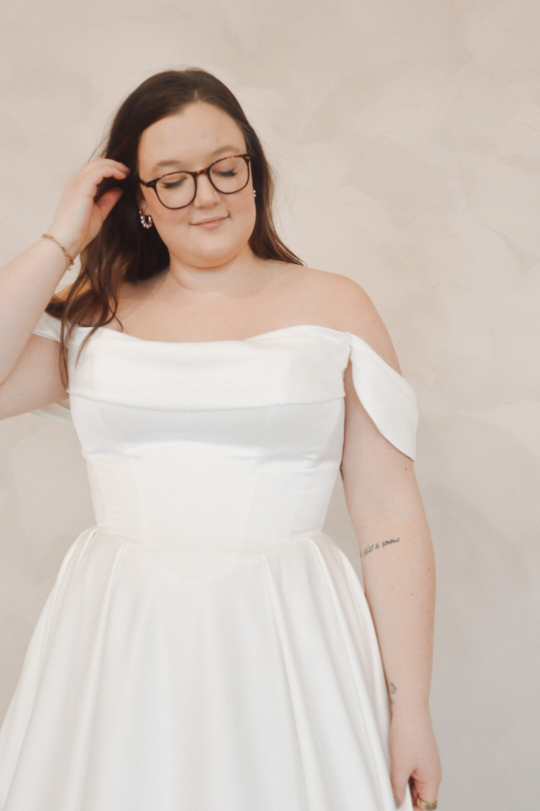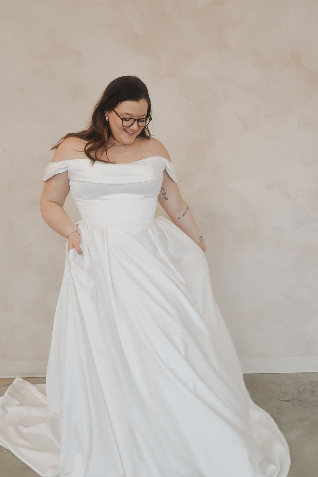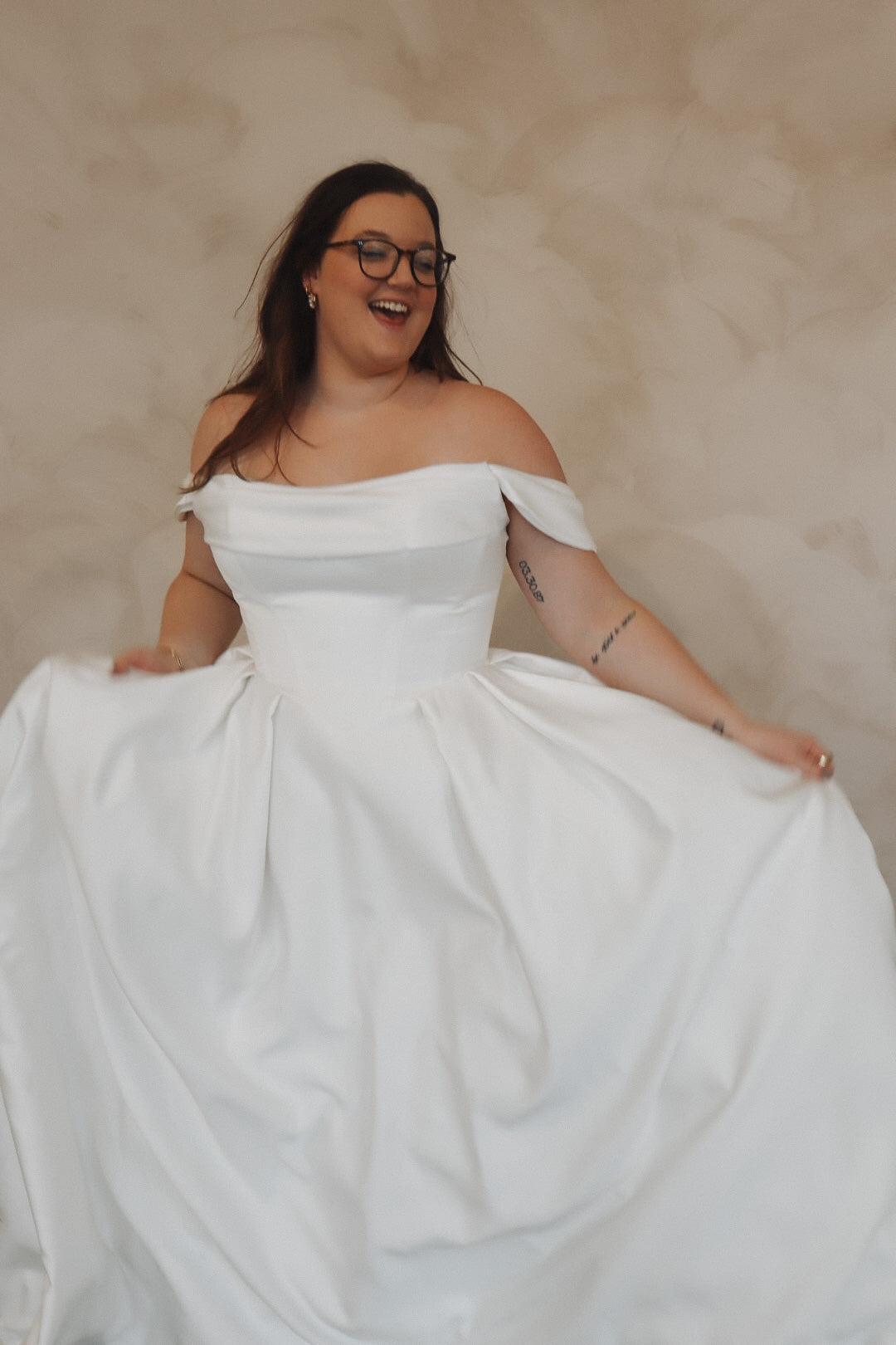 Introducing "Della"- This dress is a stunning example of bridal elegance with a touch of classic glamour. The off-the-shoulder design creates a beautifully romantic look, while the structured bodice highlights the waist and offers a timeless silhouette. The luxurious satin fabric adds a rich shine, giving the dress a sophisticated and refined feel. The full skirt flows effortlessly, creating movement and drama as you walk. Perfect for the bride who loves vintage-inspired styles with a modern twist, this gown radiates beauty and confidence on your special day.