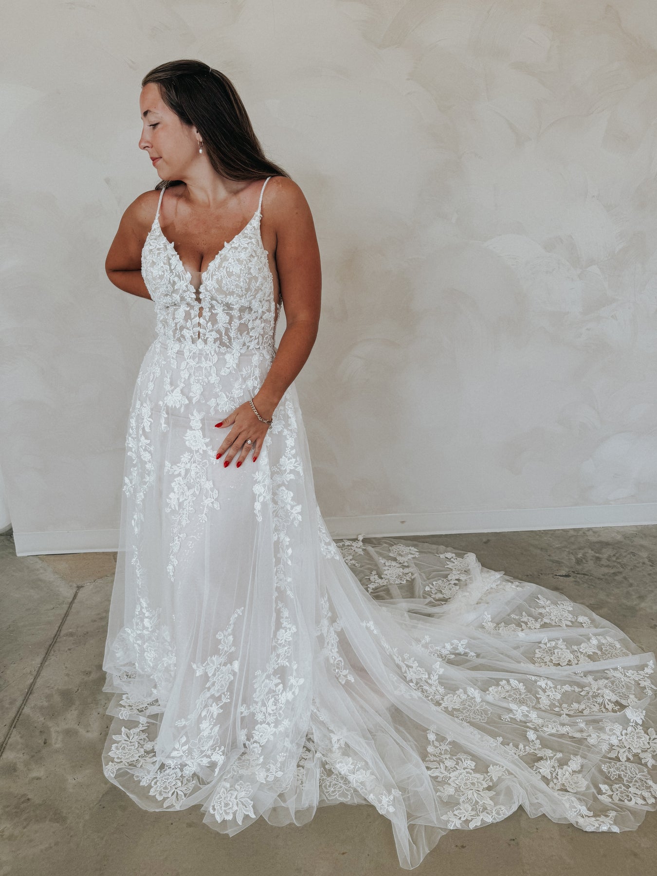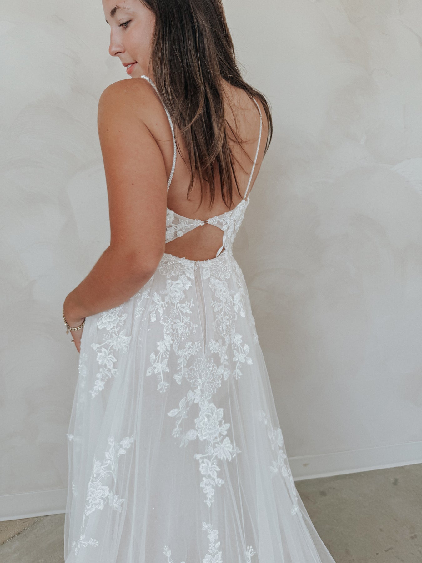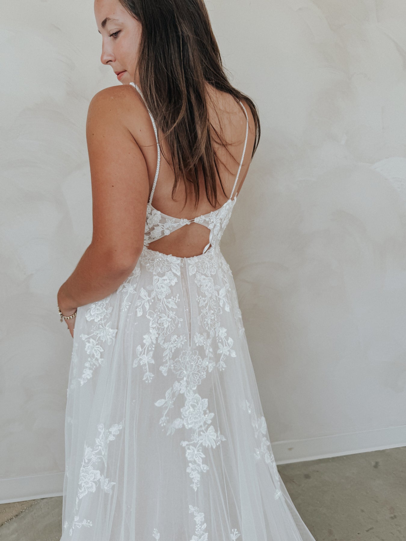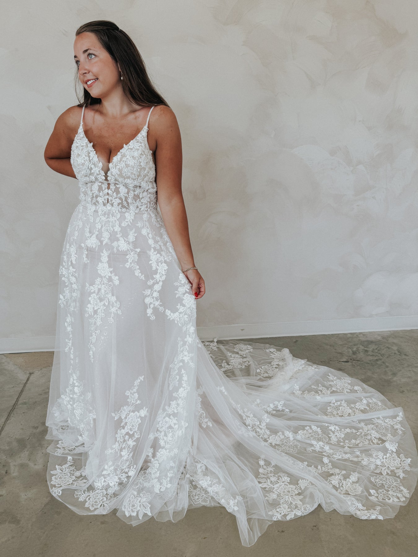 Meet “Demi” — soft, romantic, and effortlessly stunning. This gown features a flattering V-neckline and dainty spaghetti straps that lead into a sheer floral lace bodice, adorned with dimensional appliqué that shimmers subtly as you move. The lightweight silhouette hugs gently before flowing into a dreamy skirt, making Demi perfect for the bride who wants something both feminine and easy to wear. She’s delicate, detailed, and made to feel like a dream.