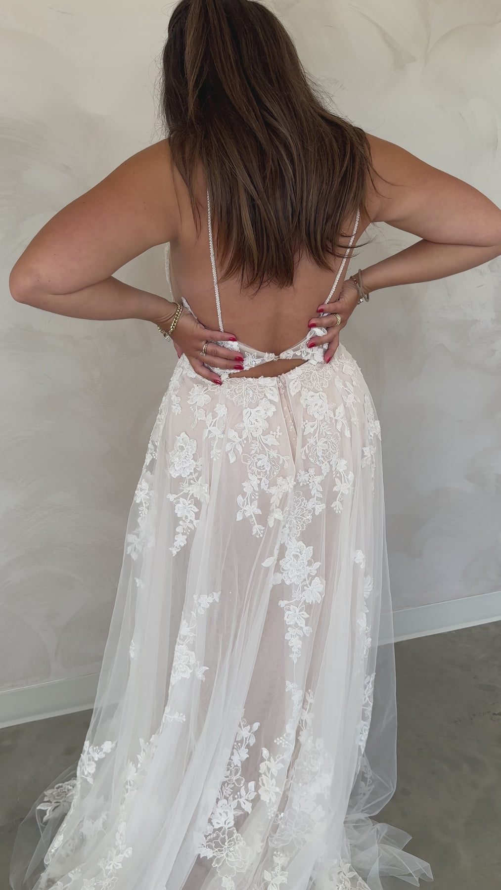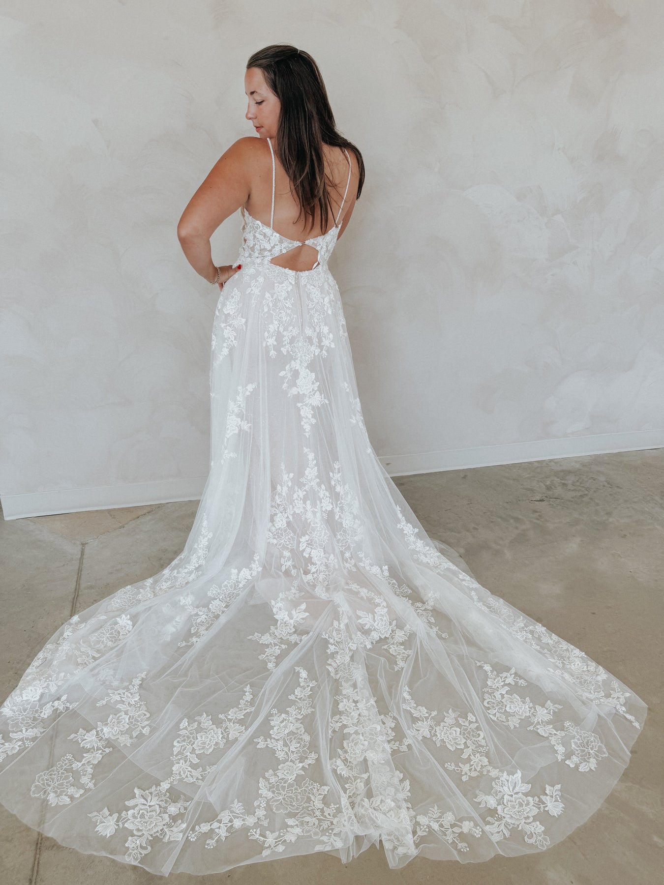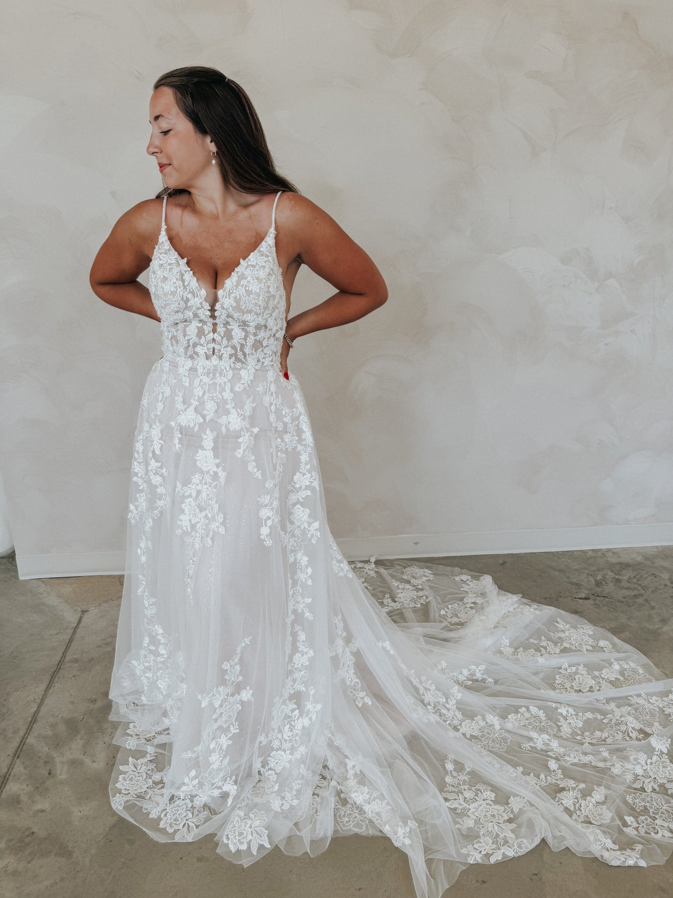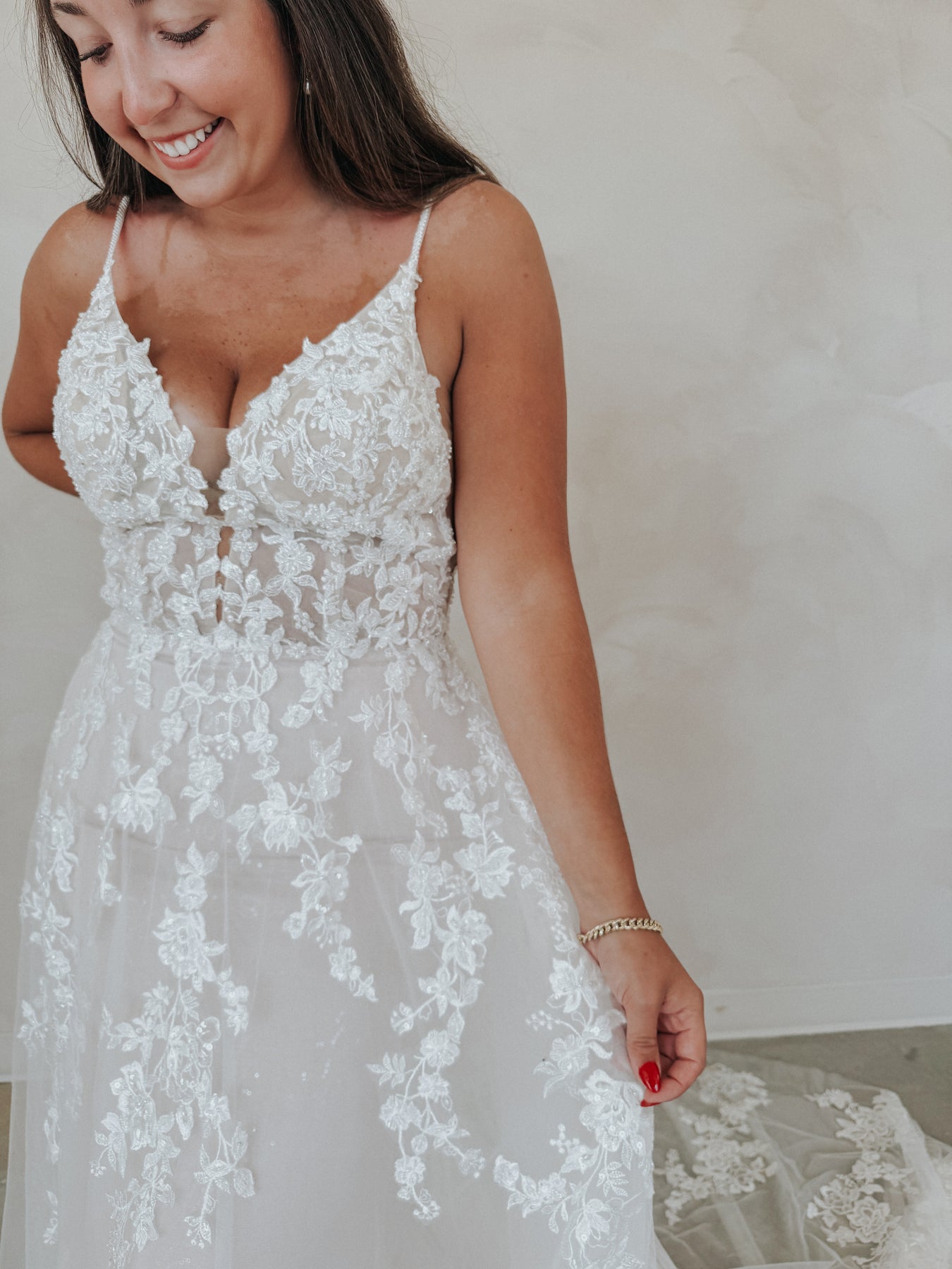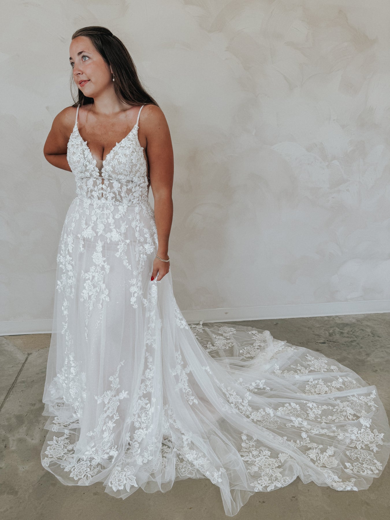 Meet “Demi” — soft, romantic, and effortlessly stunning. This gown features a flattering V-neckline and dainty spaghetti straps that lead into a sheer floral lace bodice, adorned with dimensional appliqué that shimmers subtly as you move. The lightweight silhouette hugs gently before flowing into a dreamy skirt, making Demi perfect for the bride who wants something both feminine and easy to wear. She’s delicate, detailed, and made to feel like a dream.