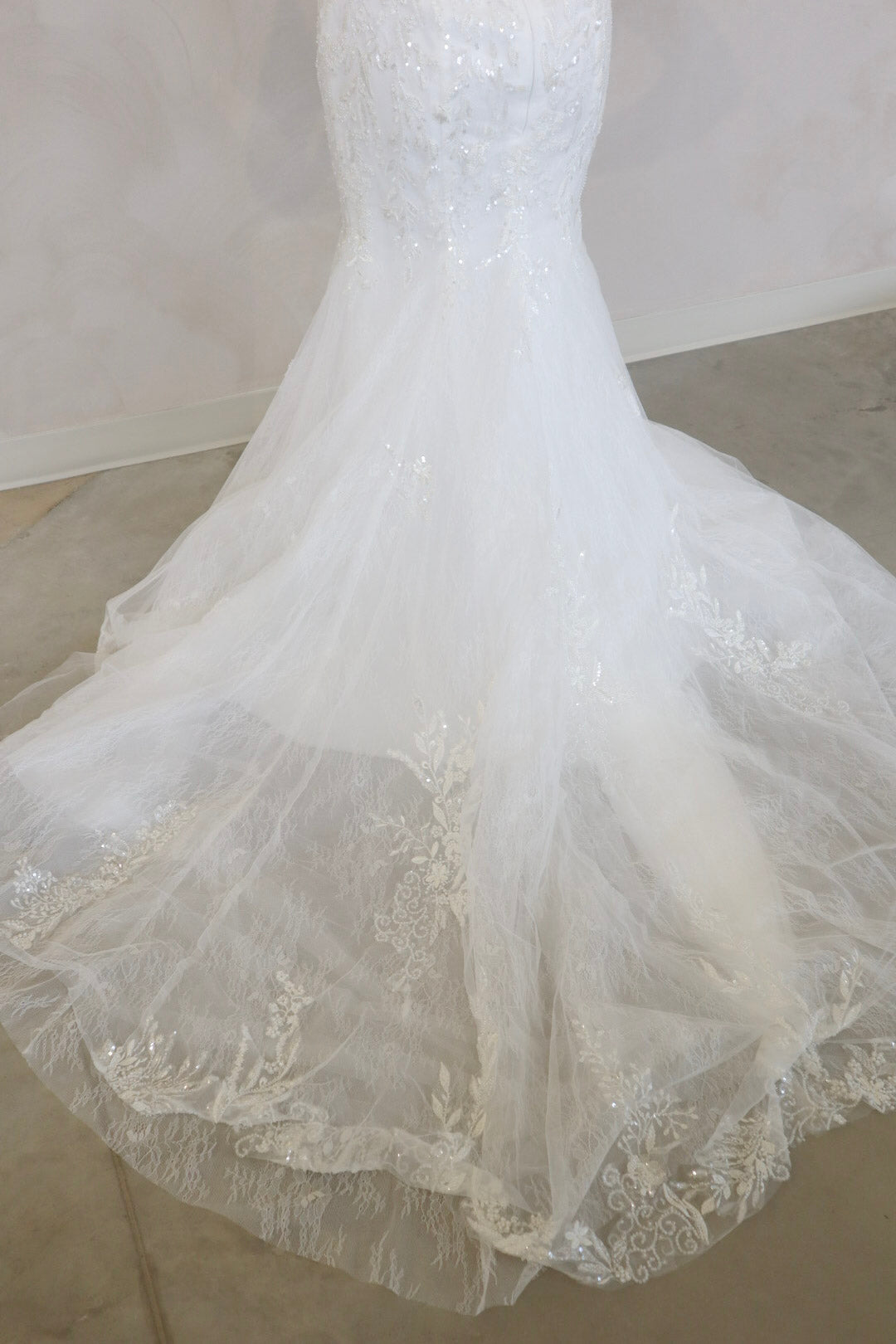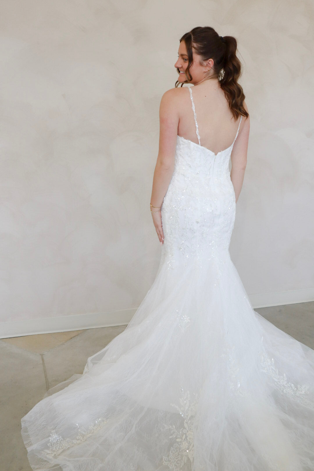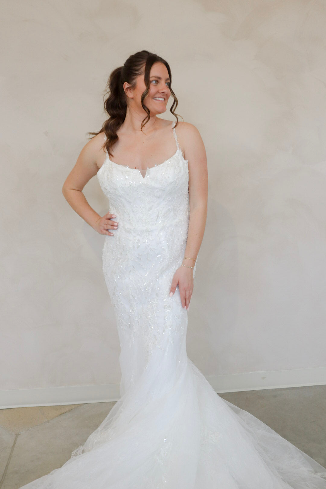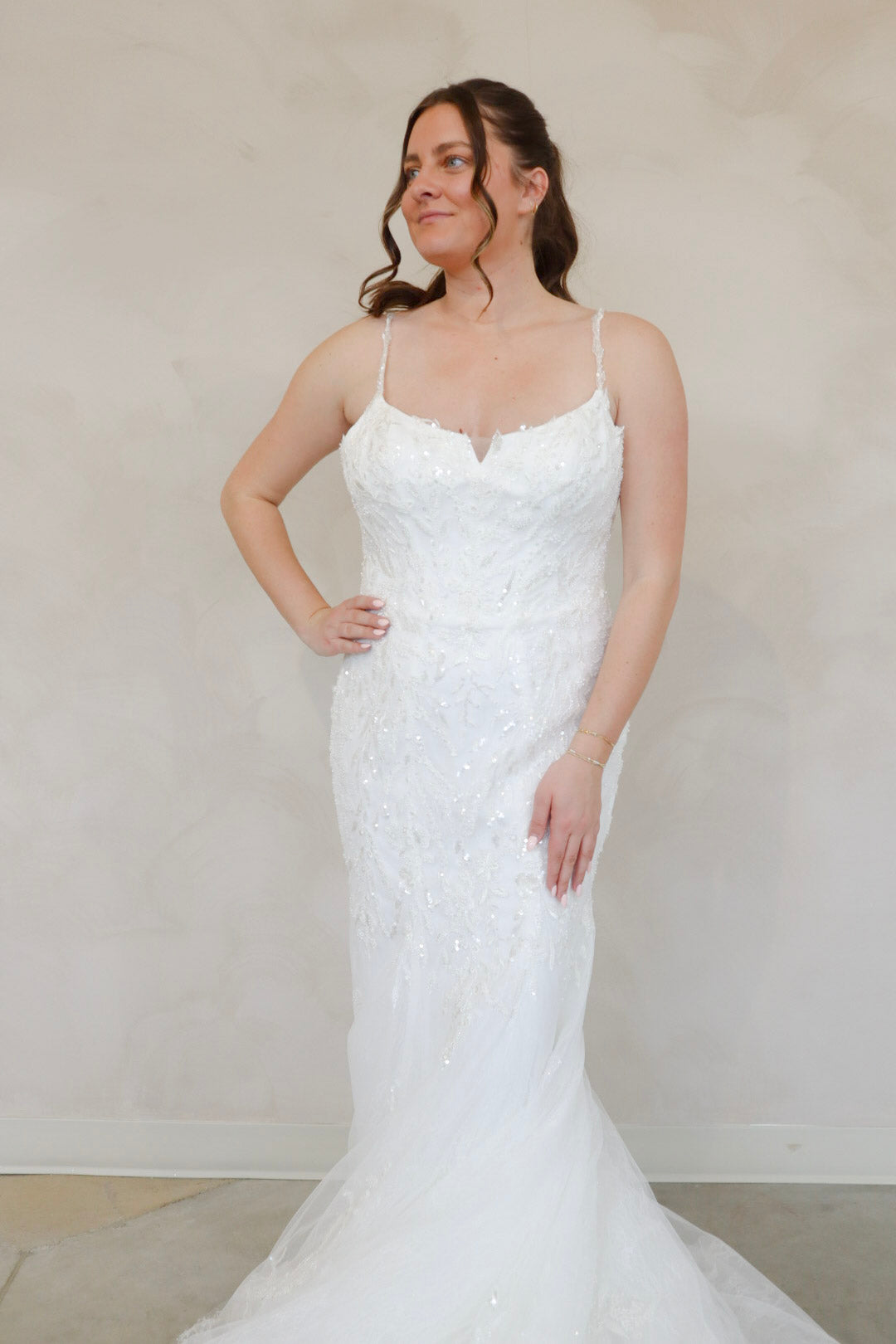 Introducing "Dahlia"- This fit-and-flare wedding gown features allover sequin and bead detailing that gradually fades down the skirt. It has a scoop neckline with skinny straps and a small illusion V inset at the front. The back is straight across with a slight dip. The fitted bodice and hips lead into a gently flared skirt for a sleek and elegant silhouette.