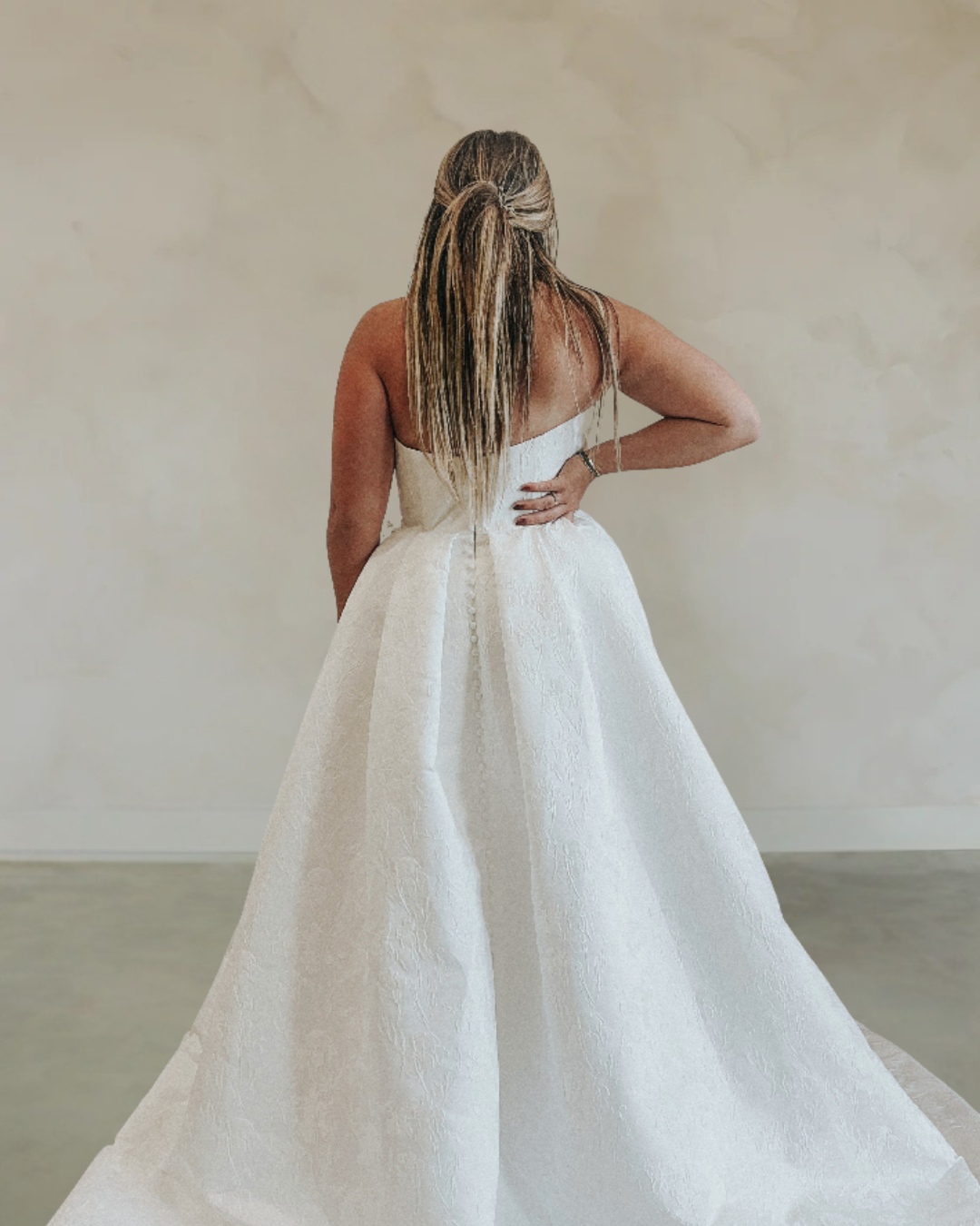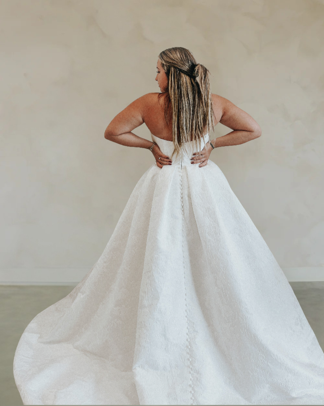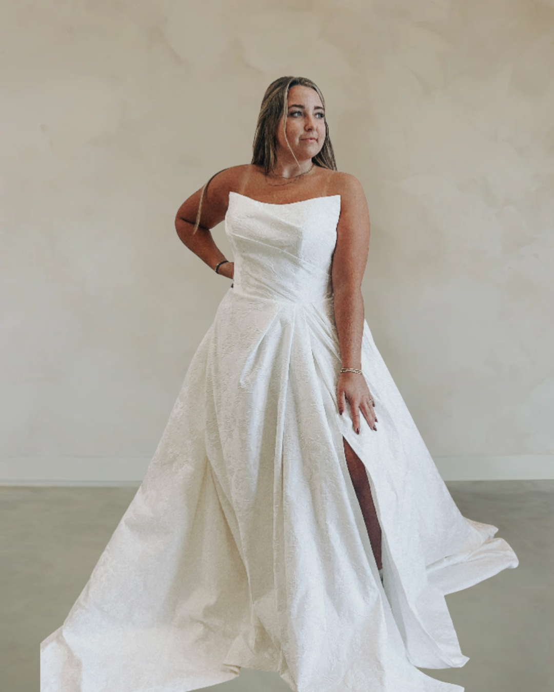Introducing "Eliza," a captivating A-line wedding gown enveloped in luxurious jacquard lace. The gown features a sleek strapless neckline and a subtle slit, balancing classic elegance with modern allure. A gracefully long train adorned with delicate buttons completes the ensemble, making "Eliza" the epitome of timeless sophistication for the bride seeking understated glamour on her special day.