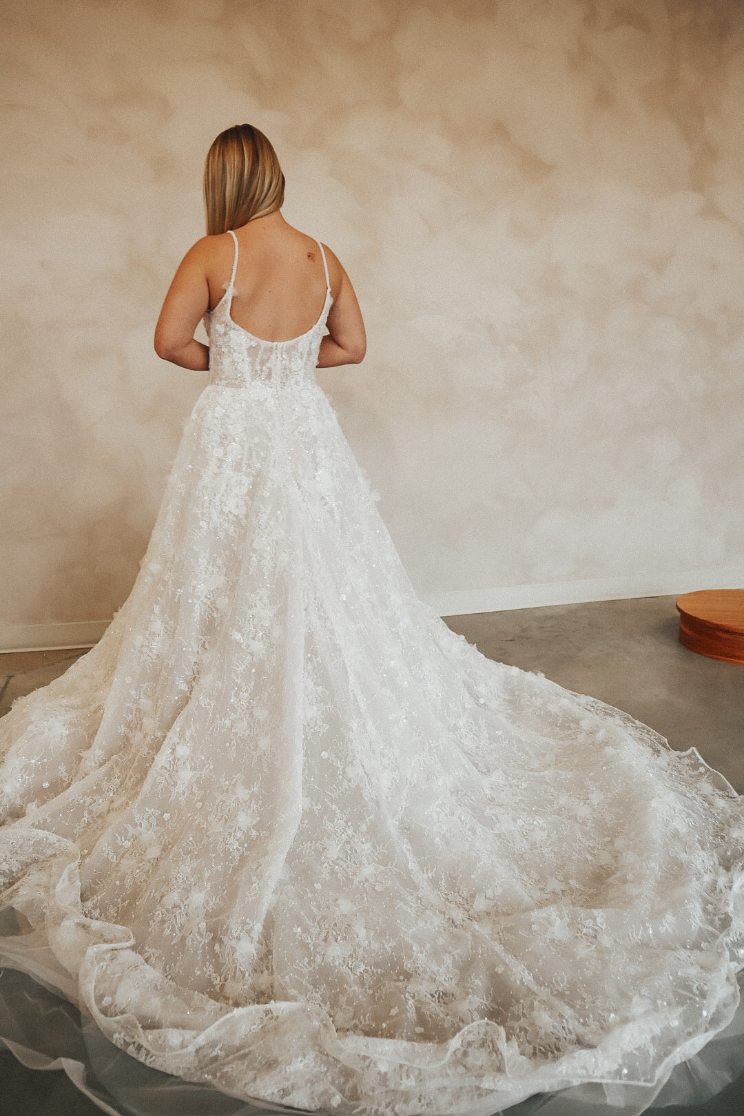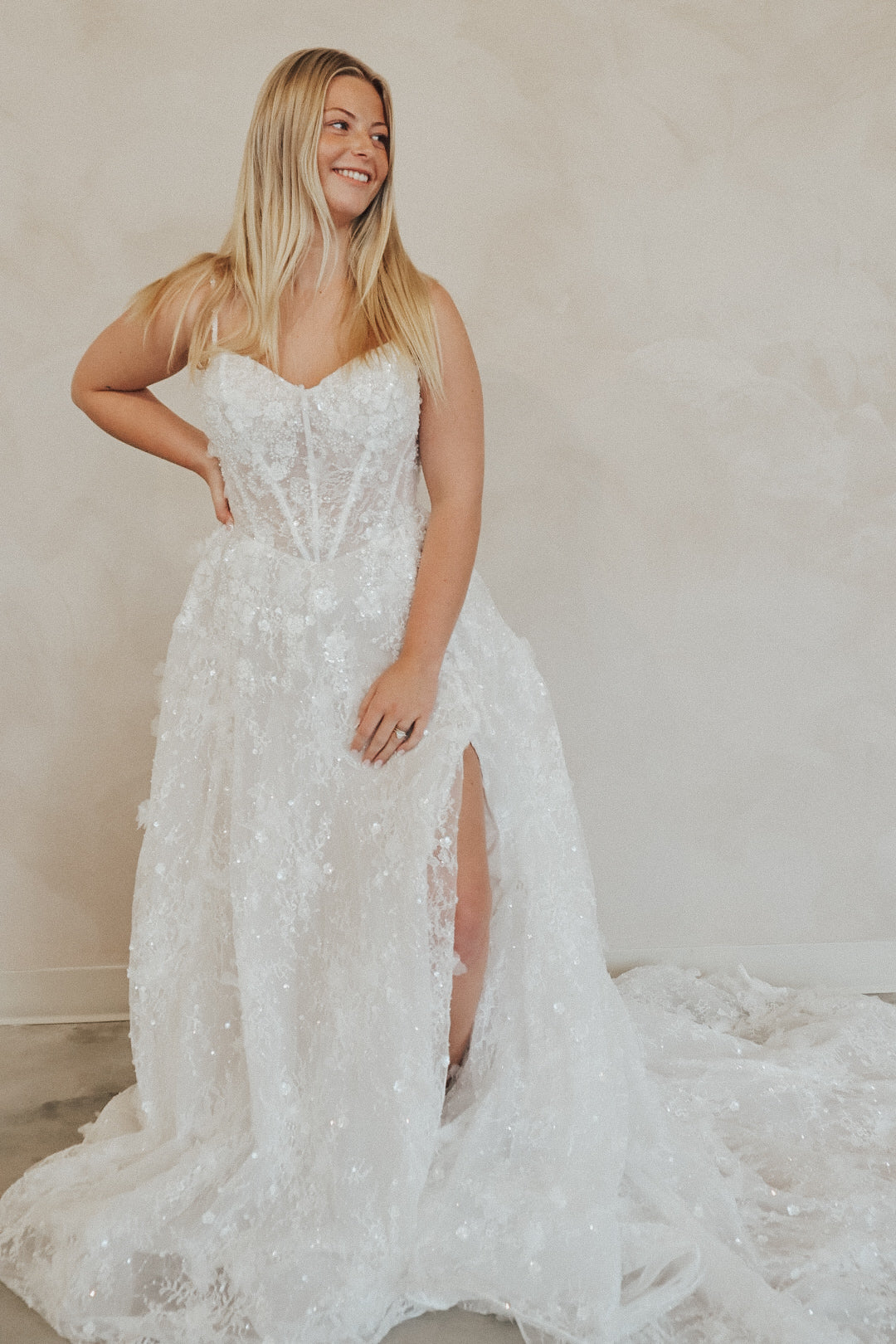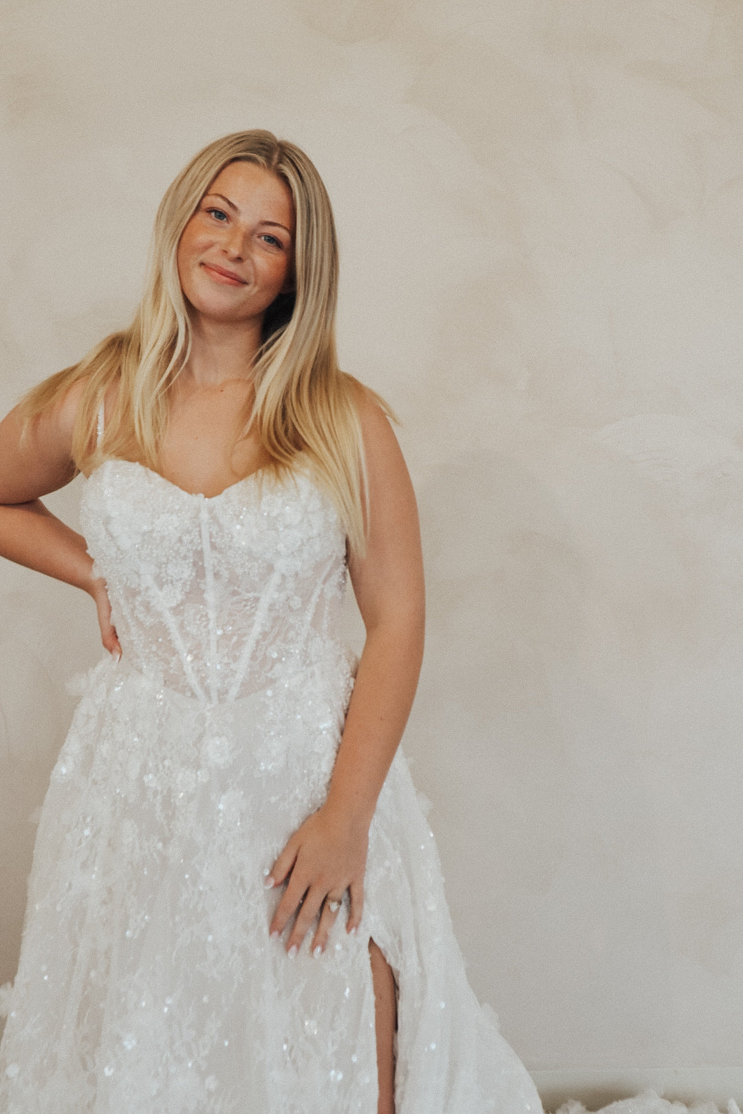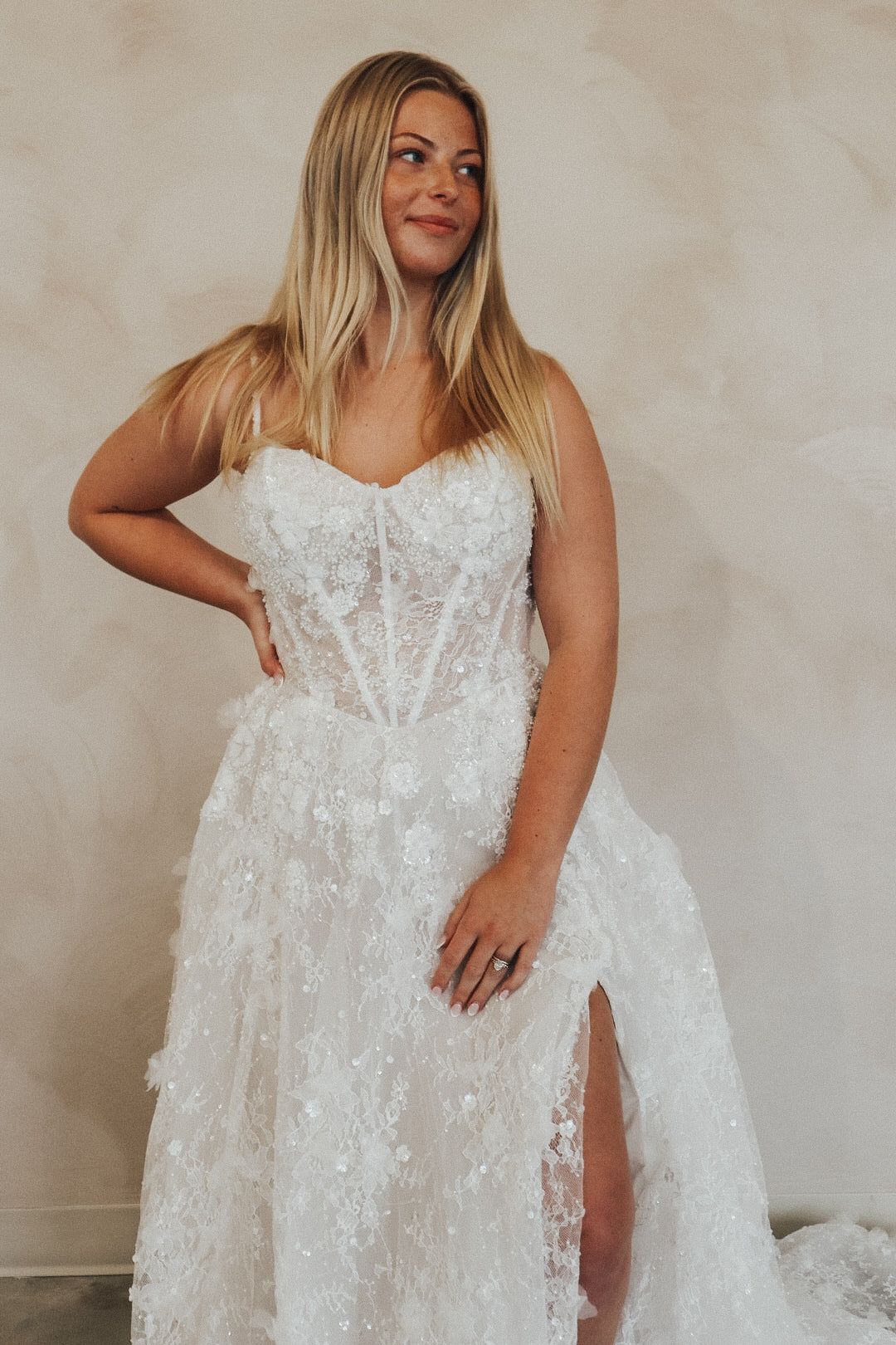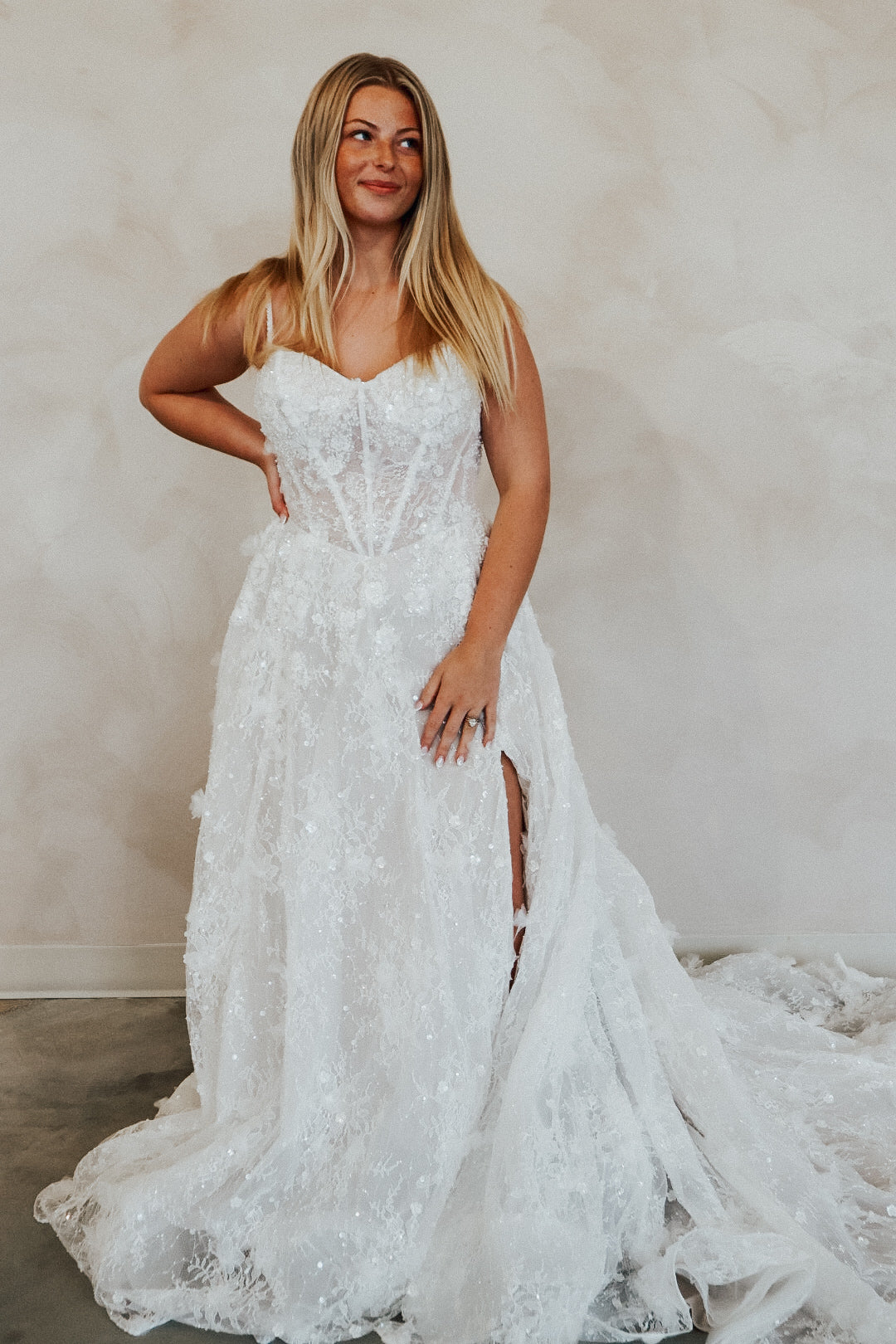 Meet "Ever" - the gown for the bride who wants whimsy with intention — soft, ethereal, and full of movement. This A-line silhouette features a semi-sheer corset bodice with exposed boning, adding structure to the otherwise airy design. 3D floral appliqué and scattered sequins trail from the bodice through the skirt, catching the light with every step. Delicate beaded straps offer a barely-there look, while the thigh-high slit adds a modern, confident edge to the fairytale texture. The full sweeping train completes the look, giving Ever its dreamy, enchanting finish.