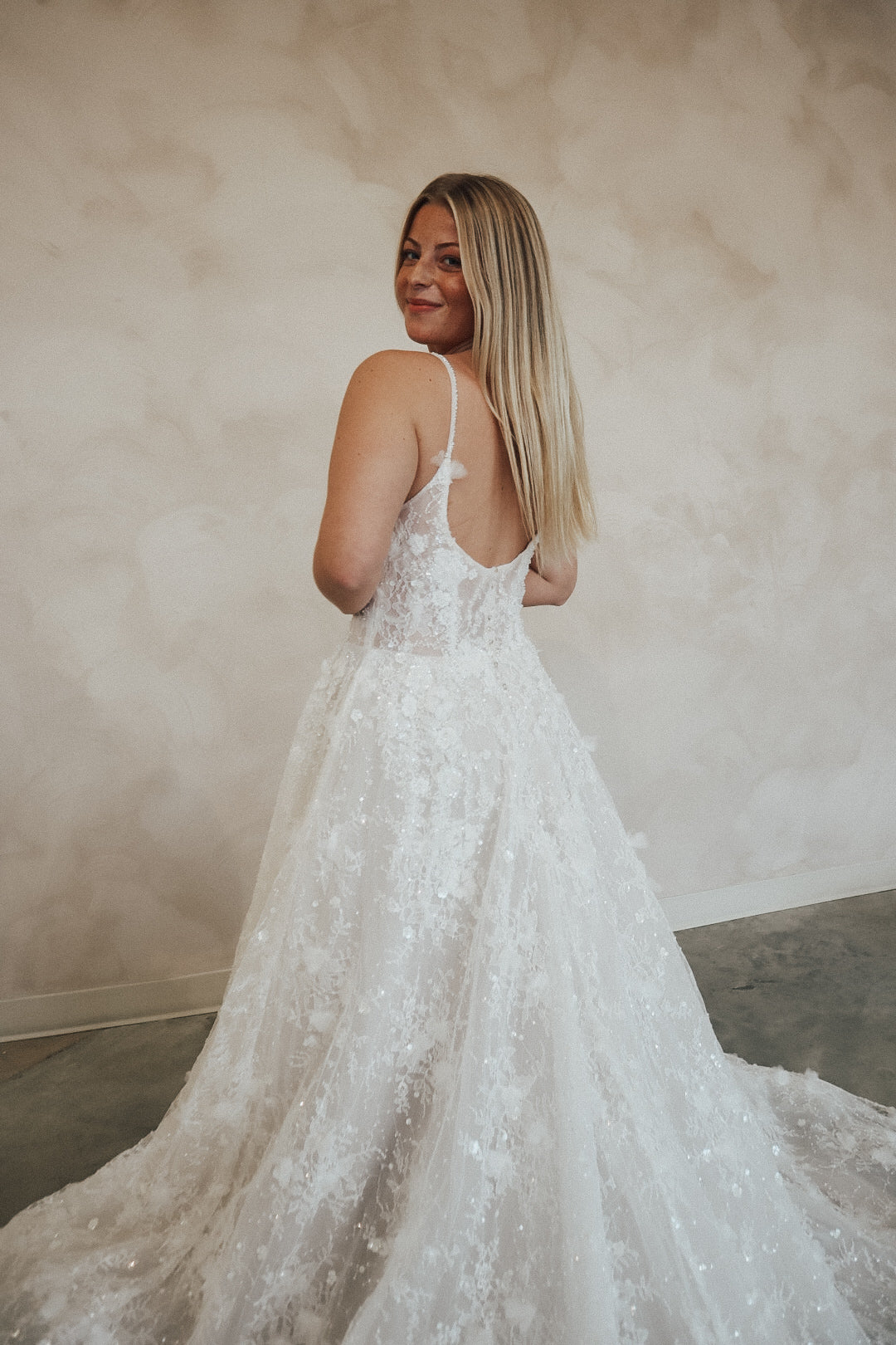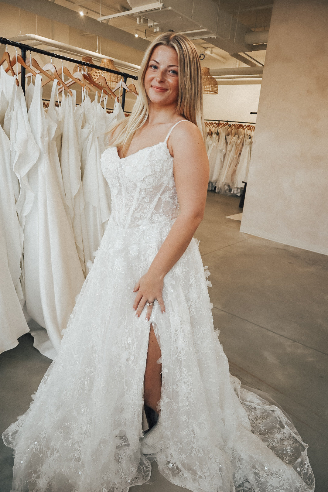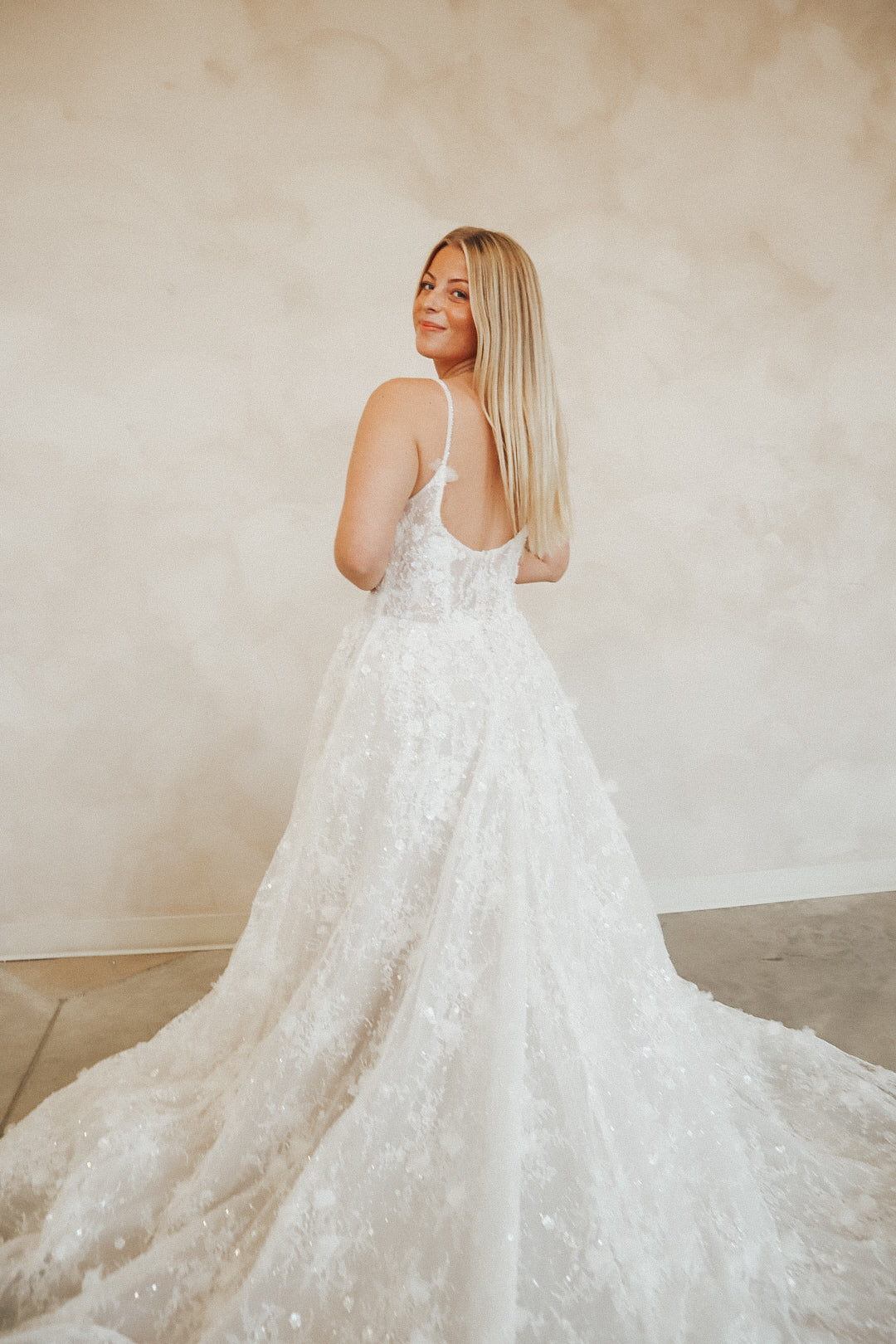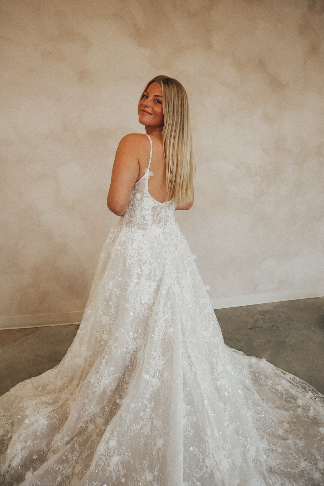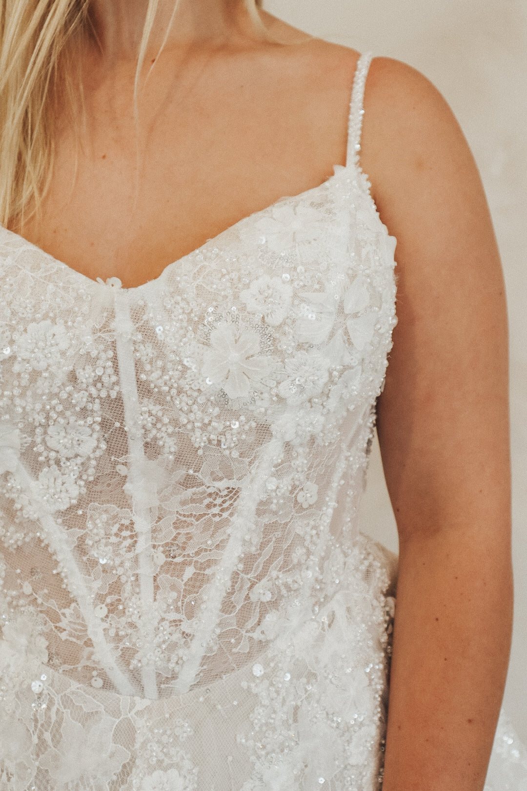 Meet "Ever" - the gown for the bride who wants whimsy with intention — soft, ethereal, and full of movement. This A-line silhouette features a semi-sheer corset bodice with exposed boning, adding structure to the otherwise airy design. 3D floral appliqué and scattered sequins trail from the bodice through the skirt, catching the light with every step. Delicate beaded straps offer a barely-there look, while the thigh-high slit adds a modern, confident edge to the fairytale texture. The full sweeping train completes the look, giving Ever its dreamy, enchanting finish.