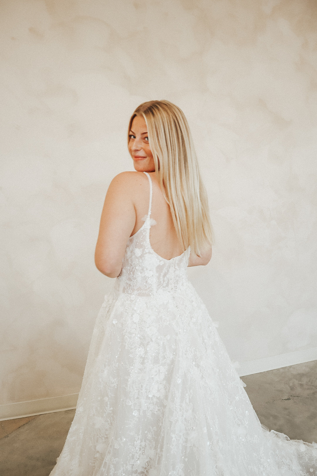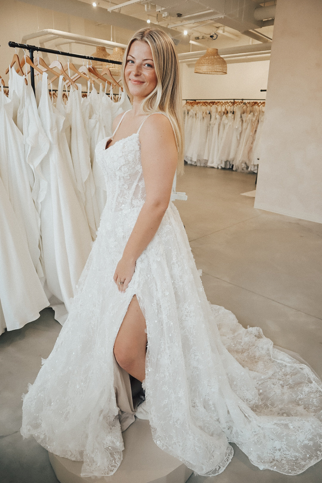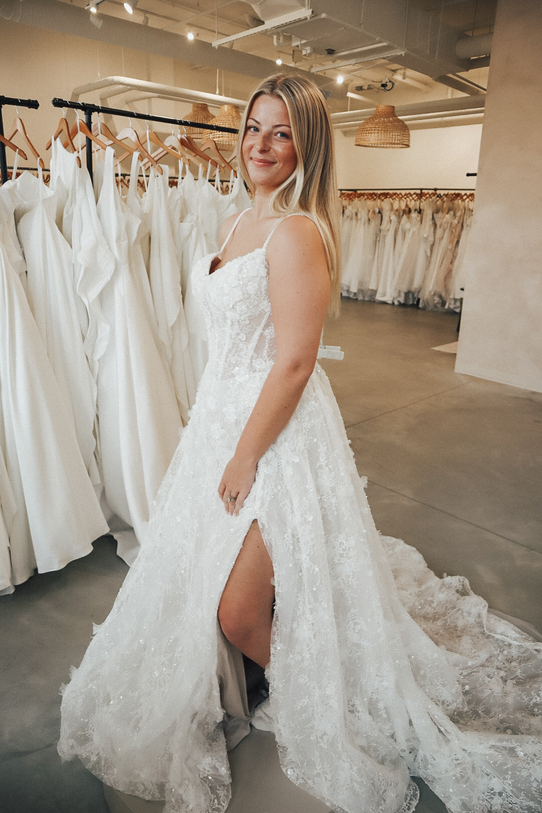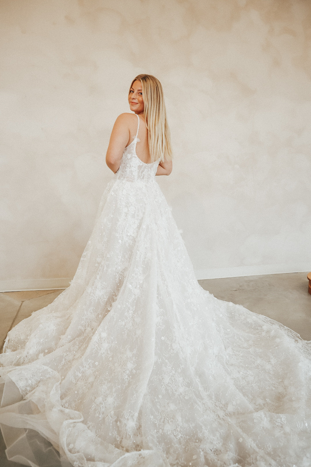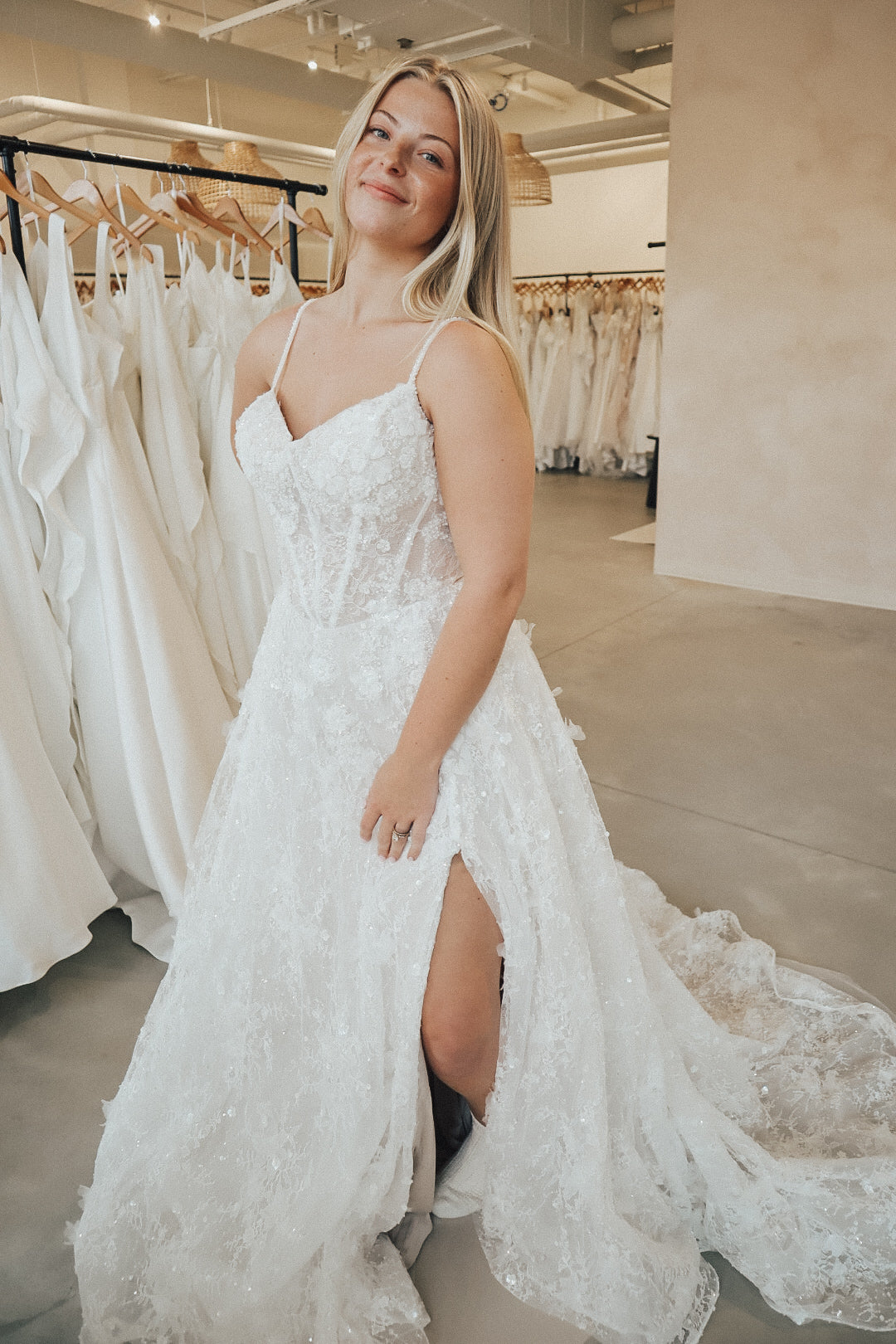 Meet "Ever" - the gown for the bride who wants whimsy with intention — soft, ethereal, and full of movement. This A-line silhouette features a semi-sheer corset bodice with exposed boning, adding structure to the otherwise airy design. 3D floral appliqué and scattered sequins trail from the bodice through the skirt, catching the light with every step. Delicate beaded straps offer a barely-there look, while the thigh-high slit adds a modern, confident edge to the fairytale texture. The full sweeping train completes the look, giving Ever its dreamy, enchanting finish.