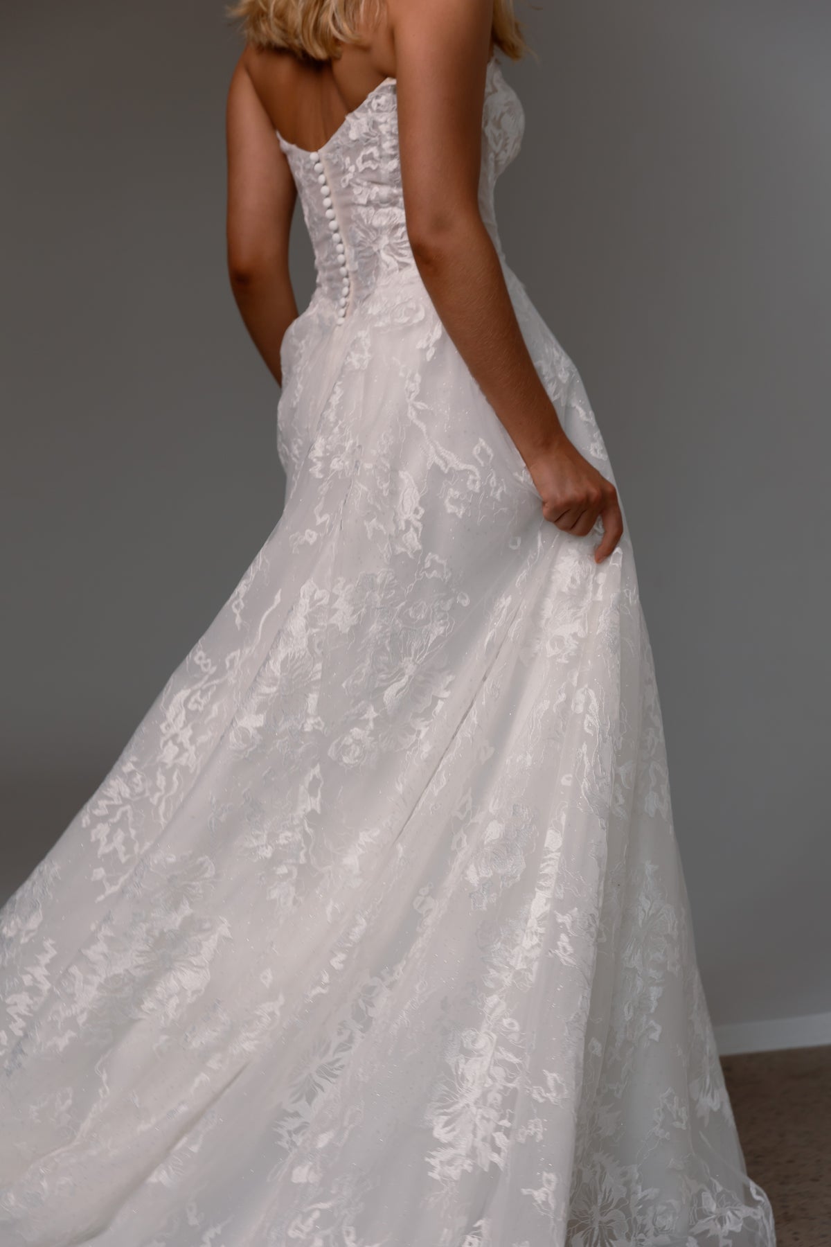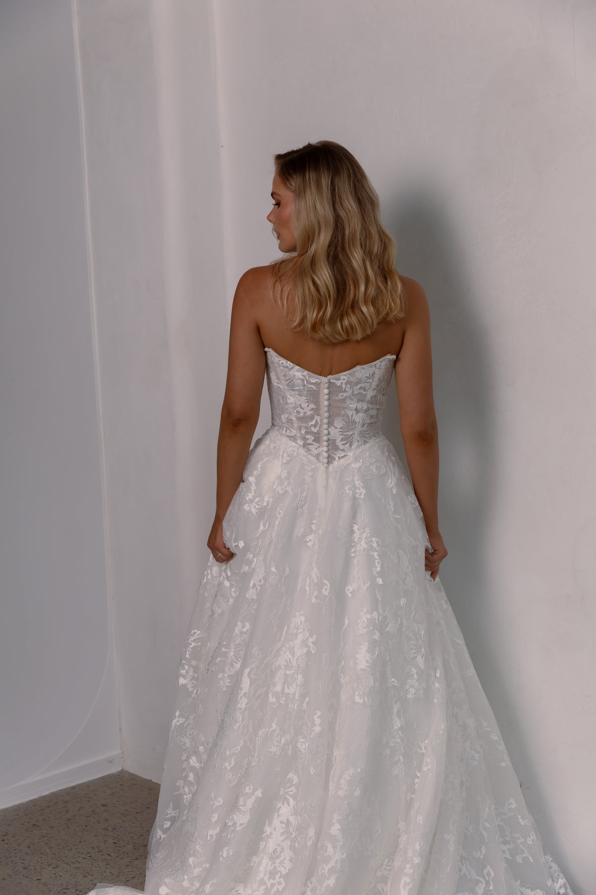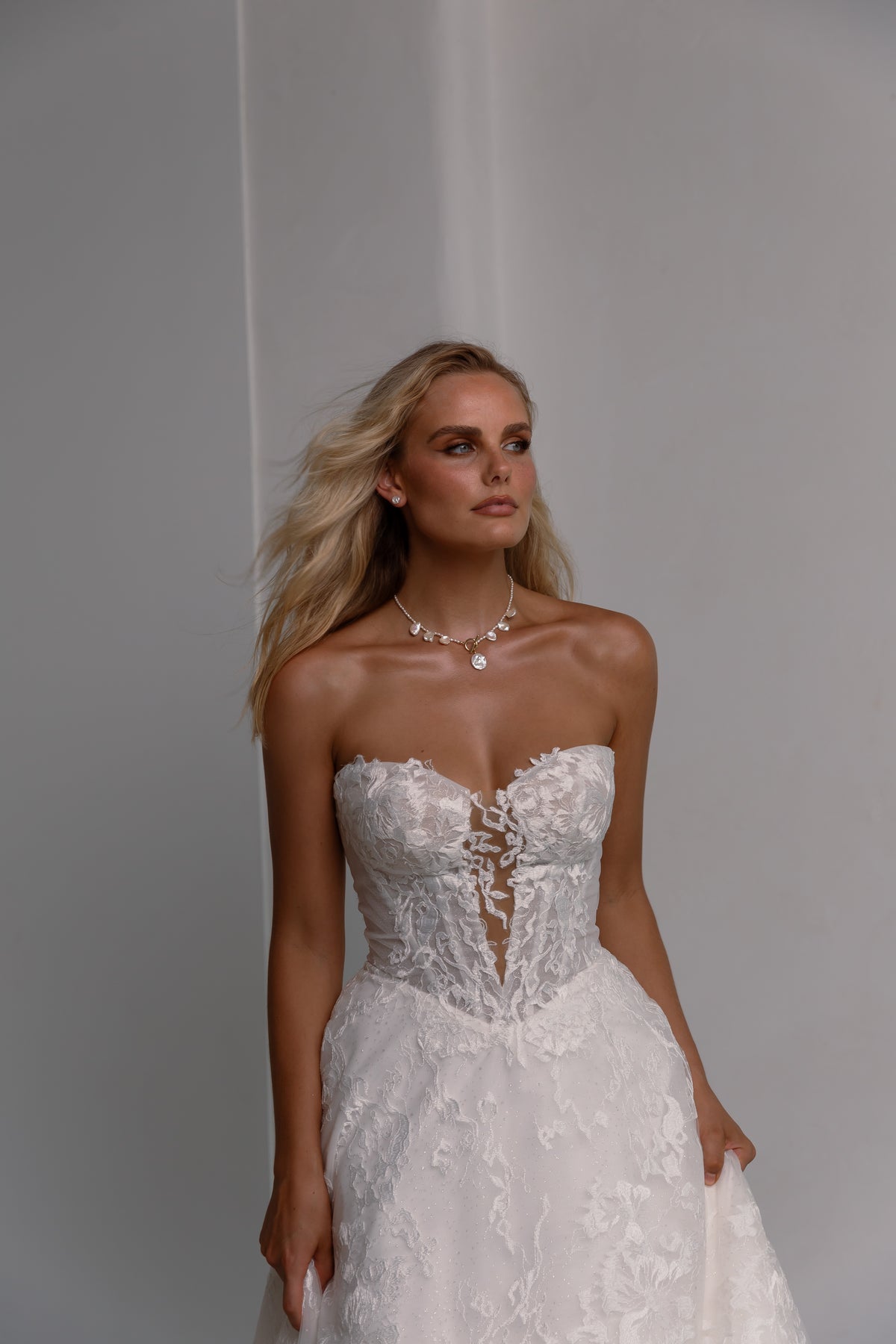 Crafted from intricate lace, the gown’s A-line silhouette flows into a full skirt that glides elegantly with every step. The lace continues seamlessly into a sweeping train, creating a sense of timeless movement and sophistication. From the sculpted bodice to the flowing hem, Florence captures a balance of romance, detail, and drama—perfect for a modern yet timeless bridal look.
