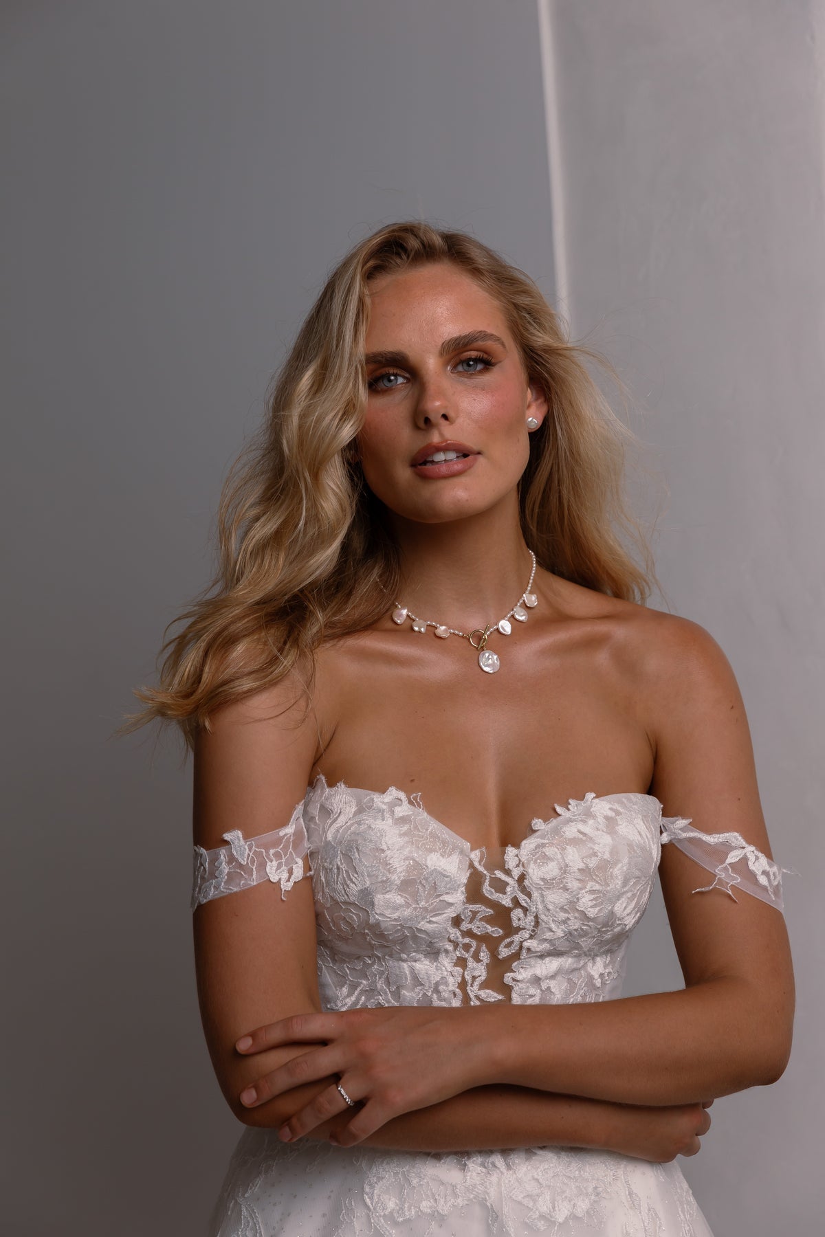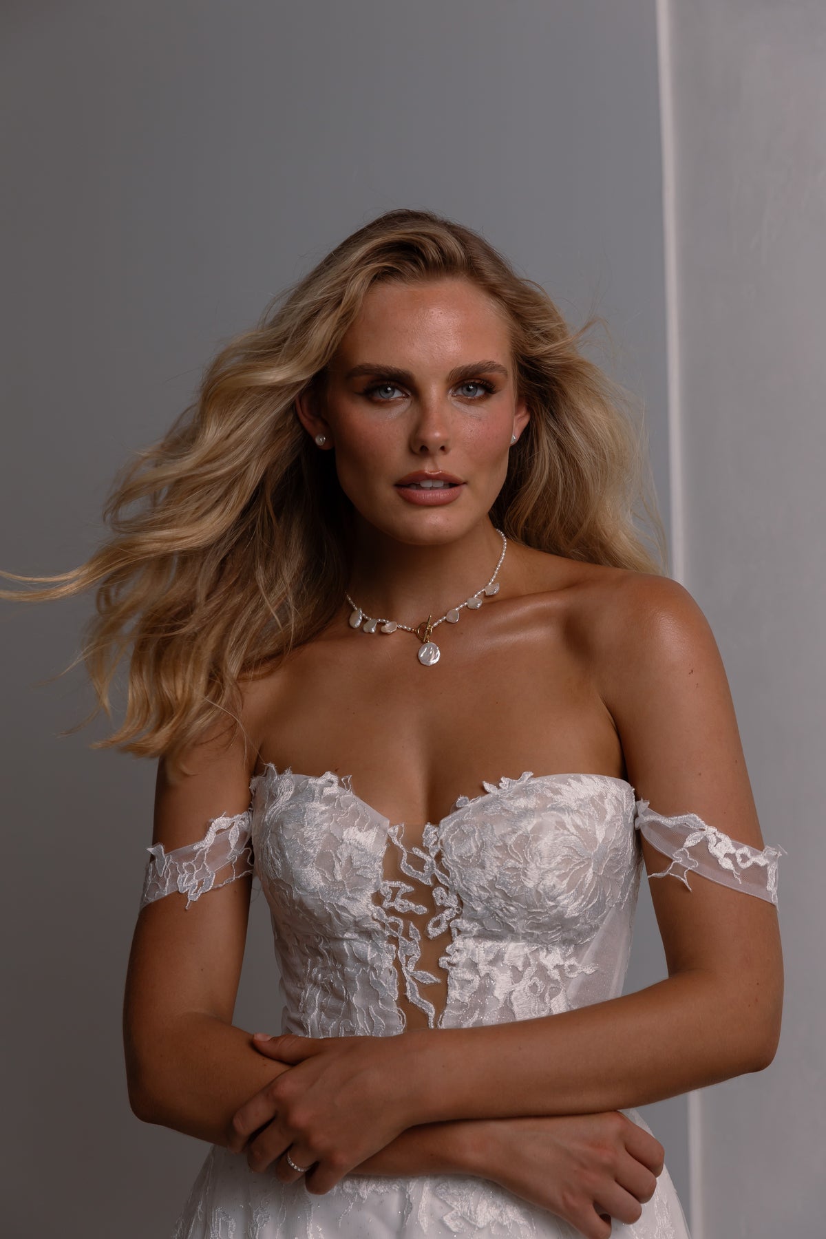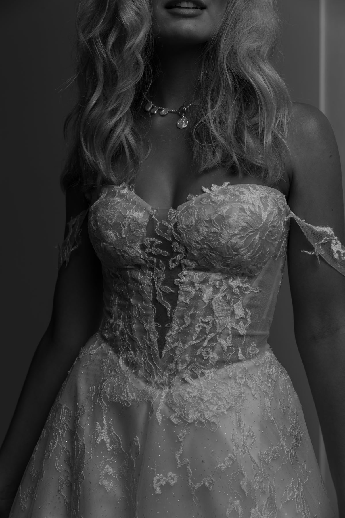 Introducing "Florence" - A romantic showstopper, designed for the bride who wants to feel effortlessly graceful. Its off-the-shoulder straps, delicately draped in soft lace, frame the neckline and shoulders with a feminine touch. The structured bodice features a deep illusion plunge and sheer corset detailing, balancing boldness with classic bridal charm.