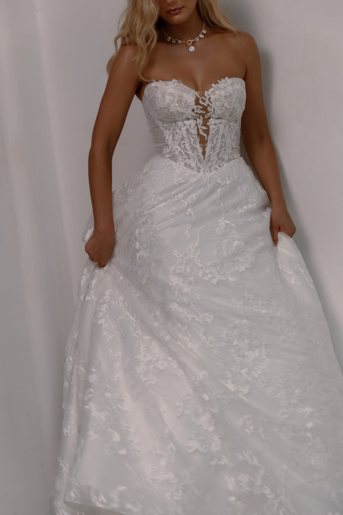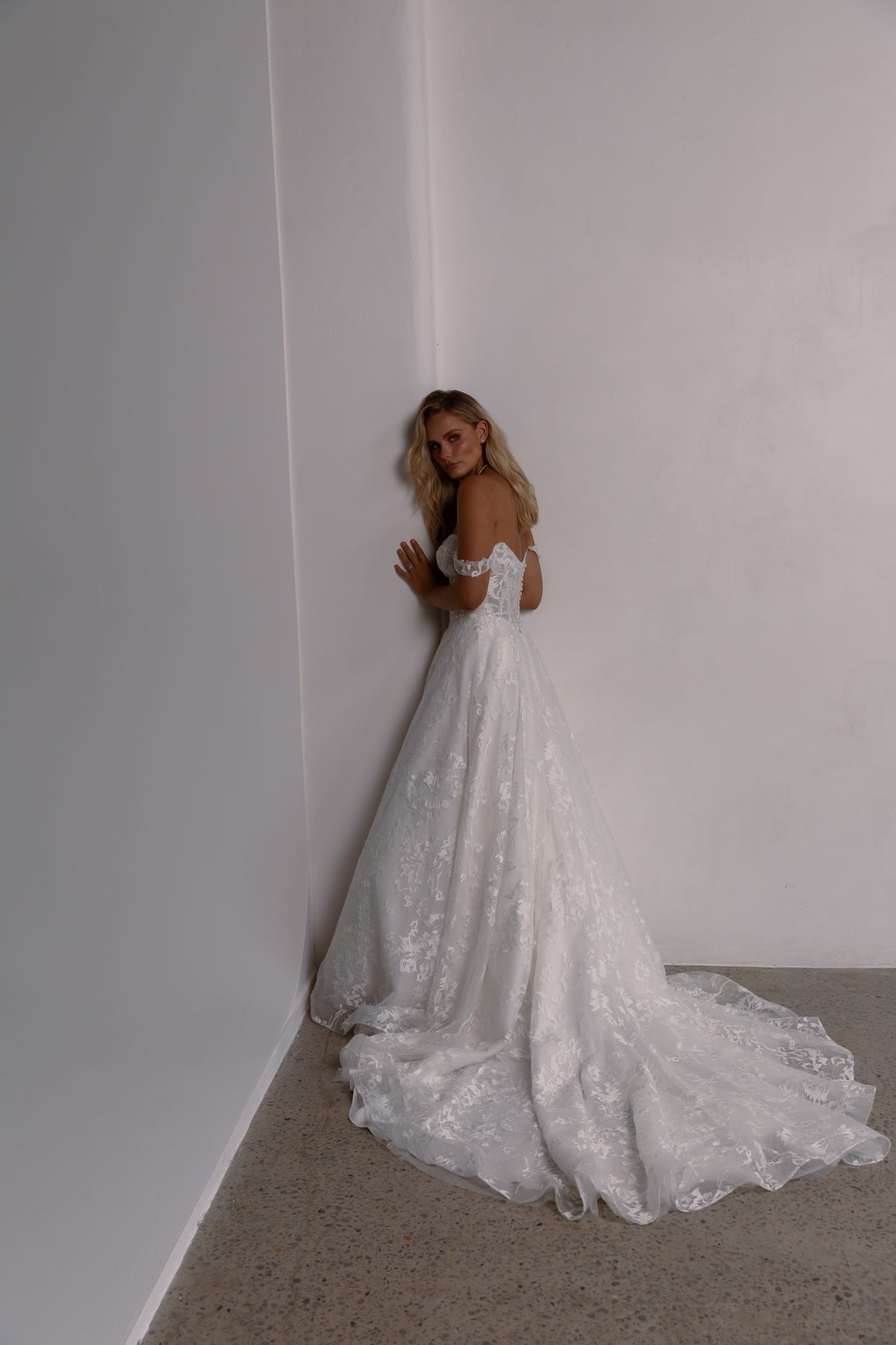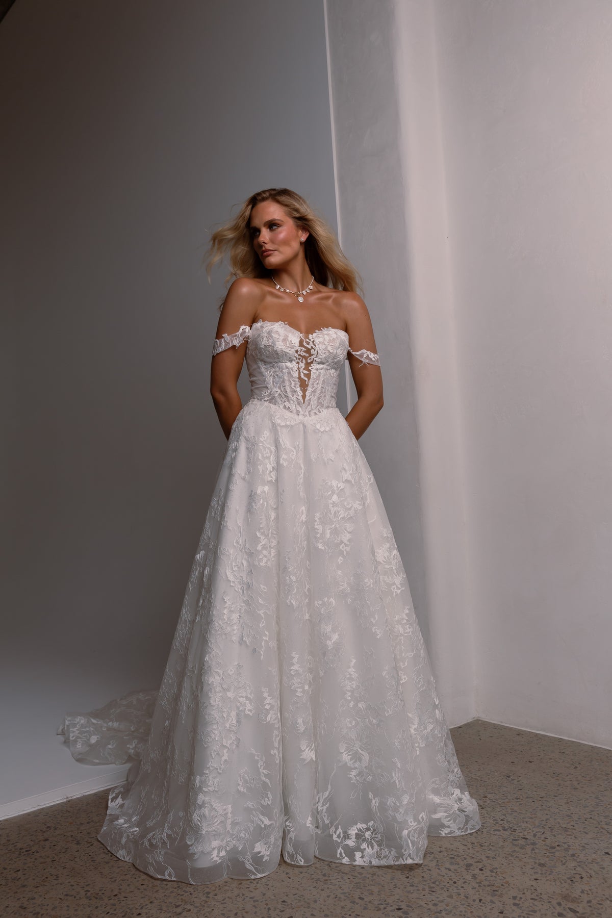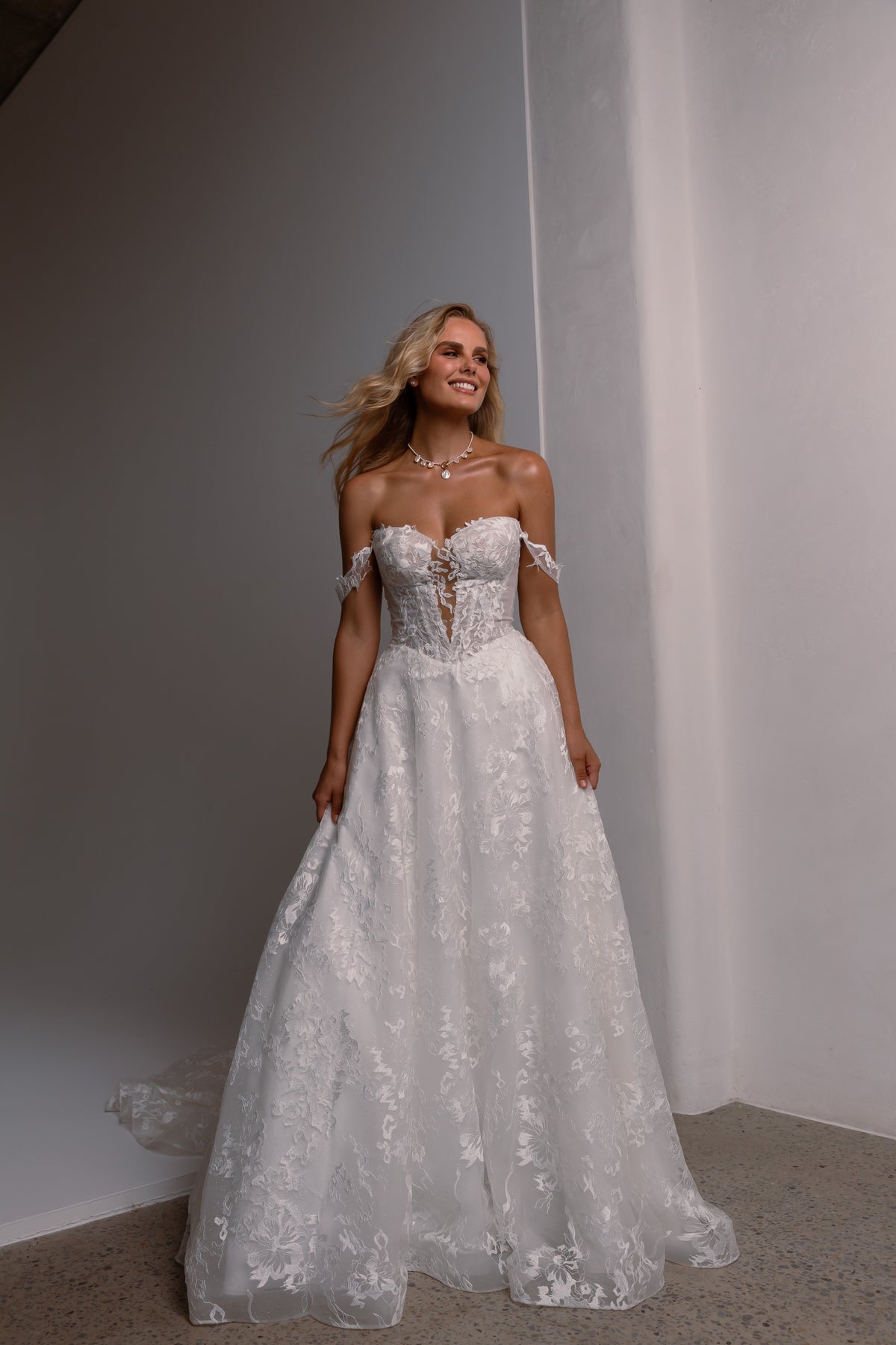 Introducing "Florence" - A romantic showstopper, designed for the bride who wants to feel effortlessly graceful. Its off-the-shoulder straps, delicately draped in soft lace, frame the neckline and shoulders with a feminine touch. The structured bodice features a deep illusion plunge and sheer corset detailing, balancing boldness with classic bridal charm.