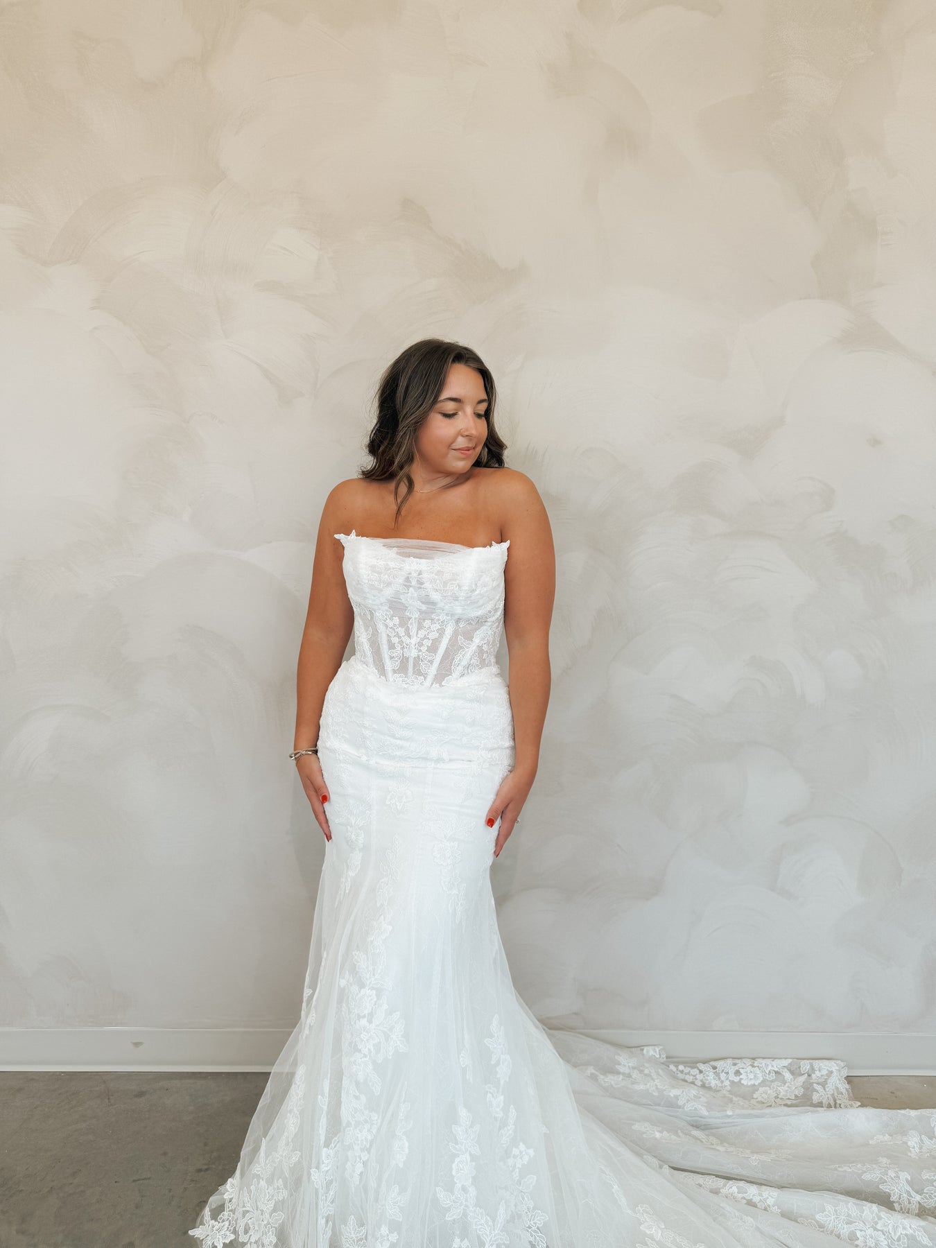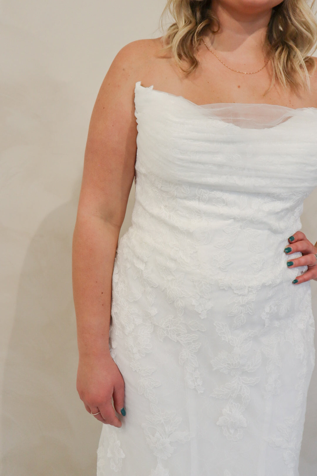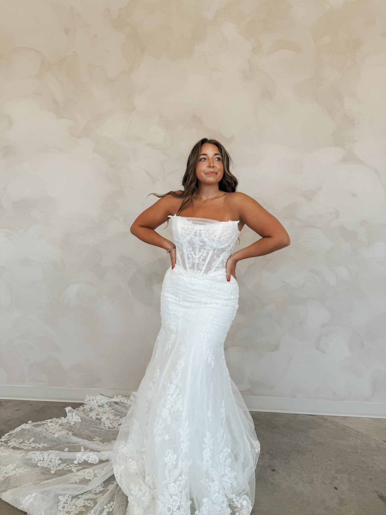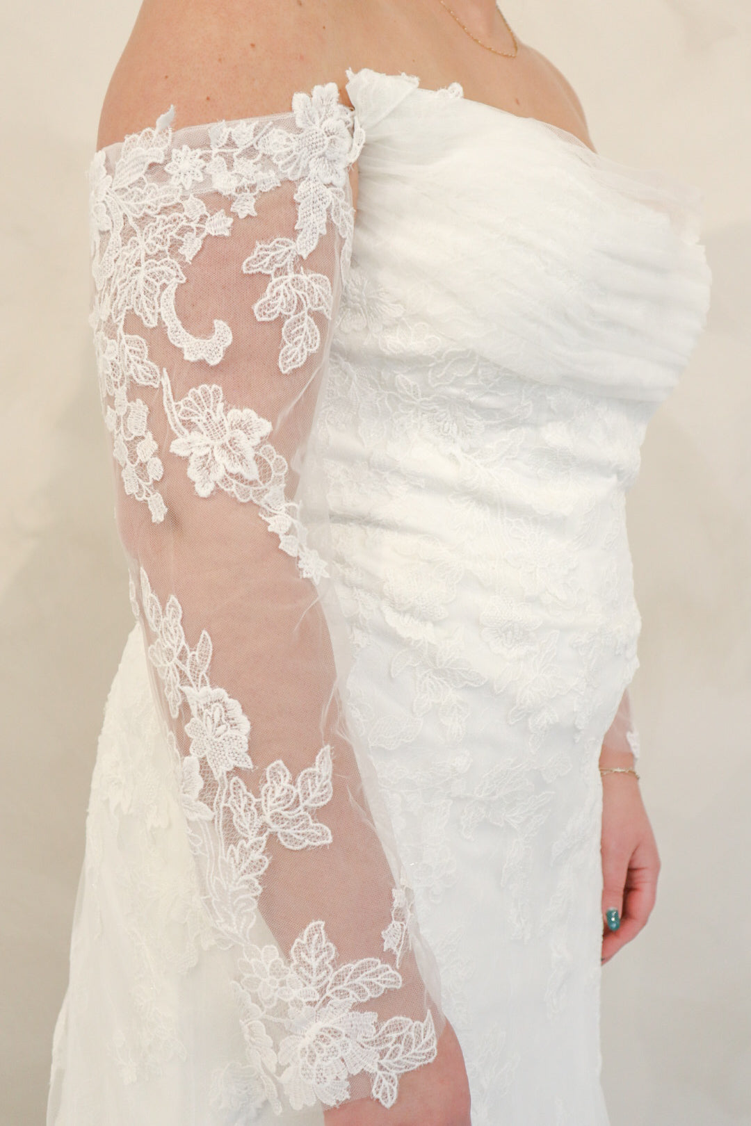 Introducing "Graham," a breathtaking blend of romance and sophistication, designed for the bride who loves timeless lace. This fit-and-flare silhouette is adorned with intricate lace from head to toe, sculpting the body beautifully before flowing into a stunning lace train. The strapless neckline is complemented by delicate off-the-shoulder long lace sleeves, adding a touch of ethereal elegance. With every detail thoughtfully crafted, "Graham" is the perfect choice for a bride seeking classic beauty with a modern, dramatic flair.