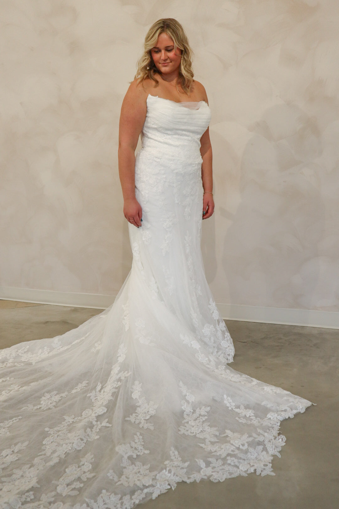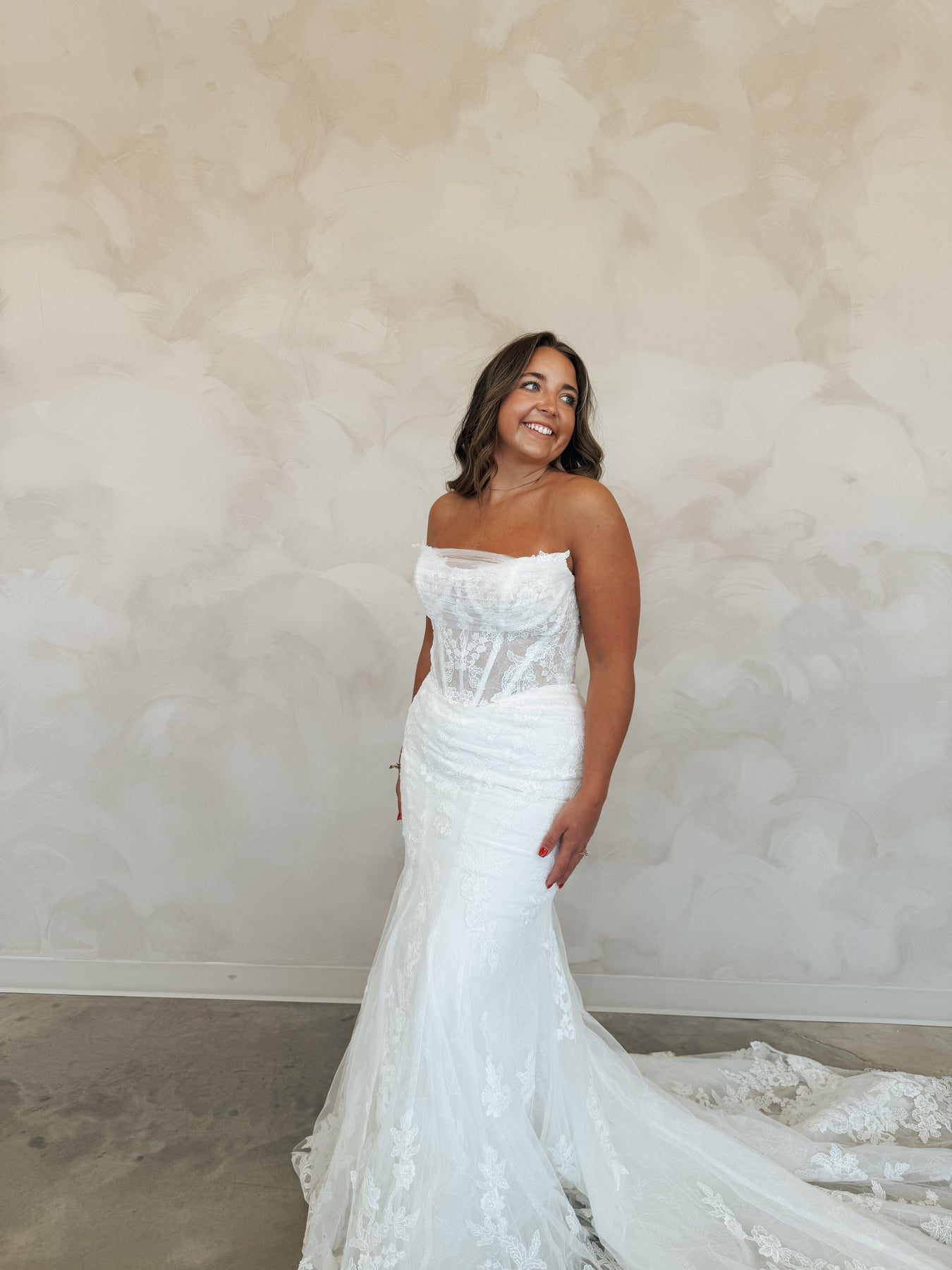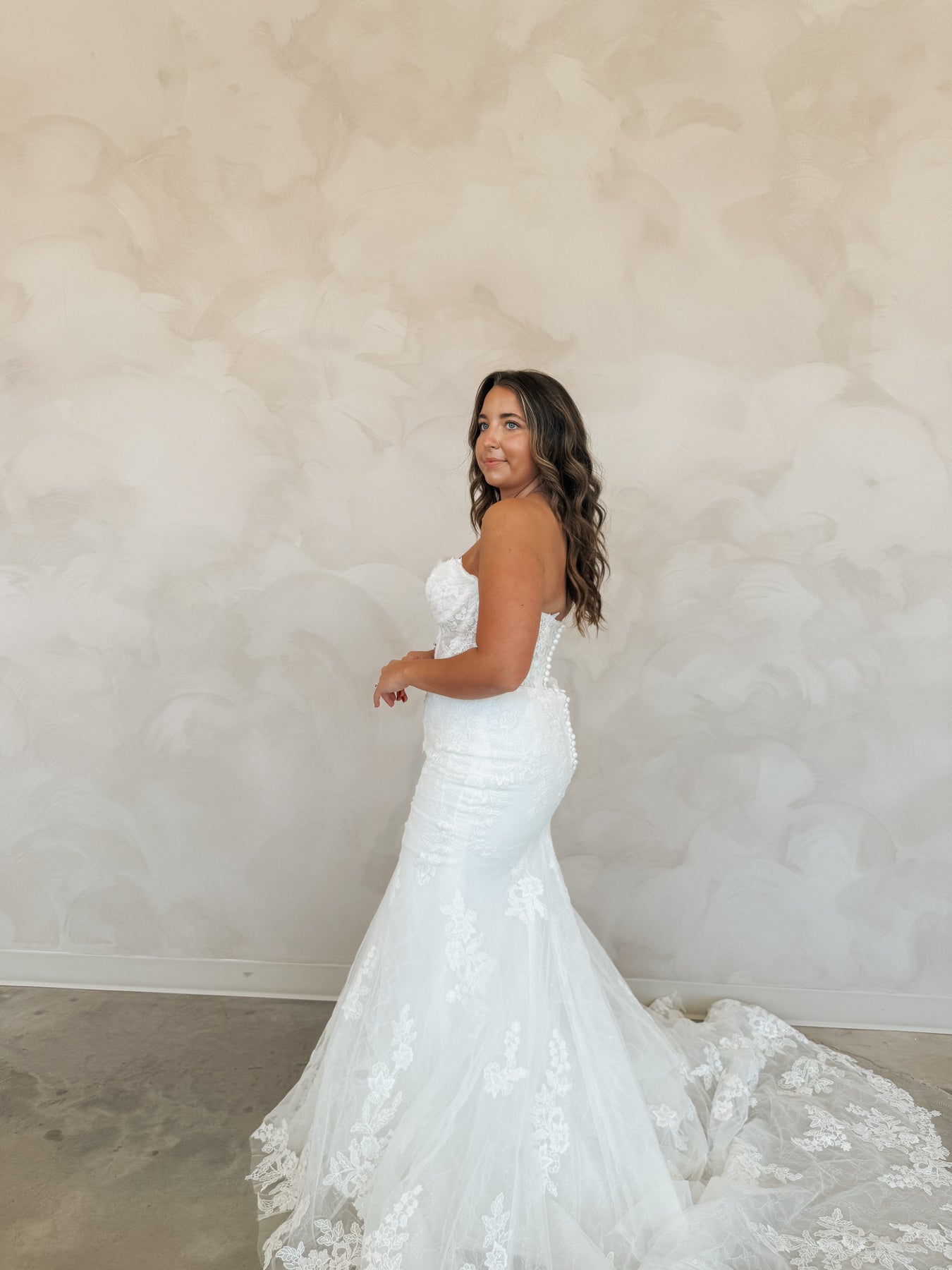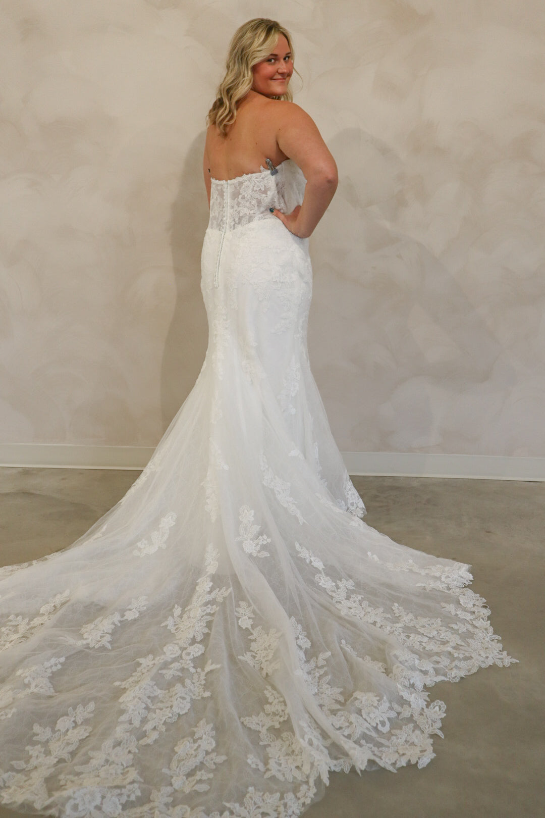 Introducing "Graham," a breathtaking blend of romance and sophistication, designed for the bride who loves timeless lace. This fit-and-flare silhouette is adorned with intricate lace from head to toe, sculpting the body beautifully before flowing into a stunning lace train. The strapless neckline is complemented by delicate off-the-shoulder long lace sleeves, adding a touch of ethereal elegance. With every detail thoughtfully crafted, "Graham" is the perfect choice for a bride seeking classic beauty with a modern, dramatic flair.
