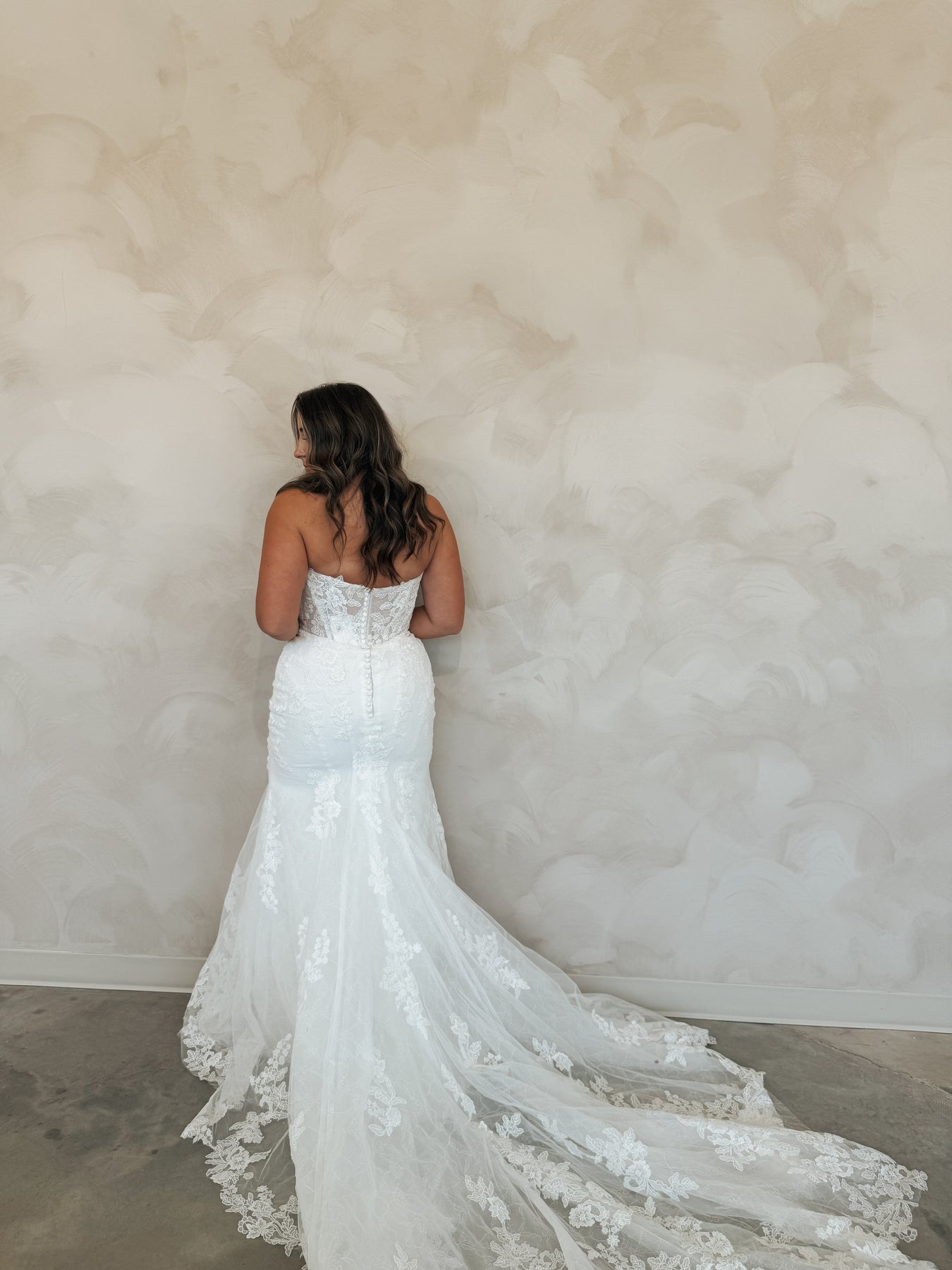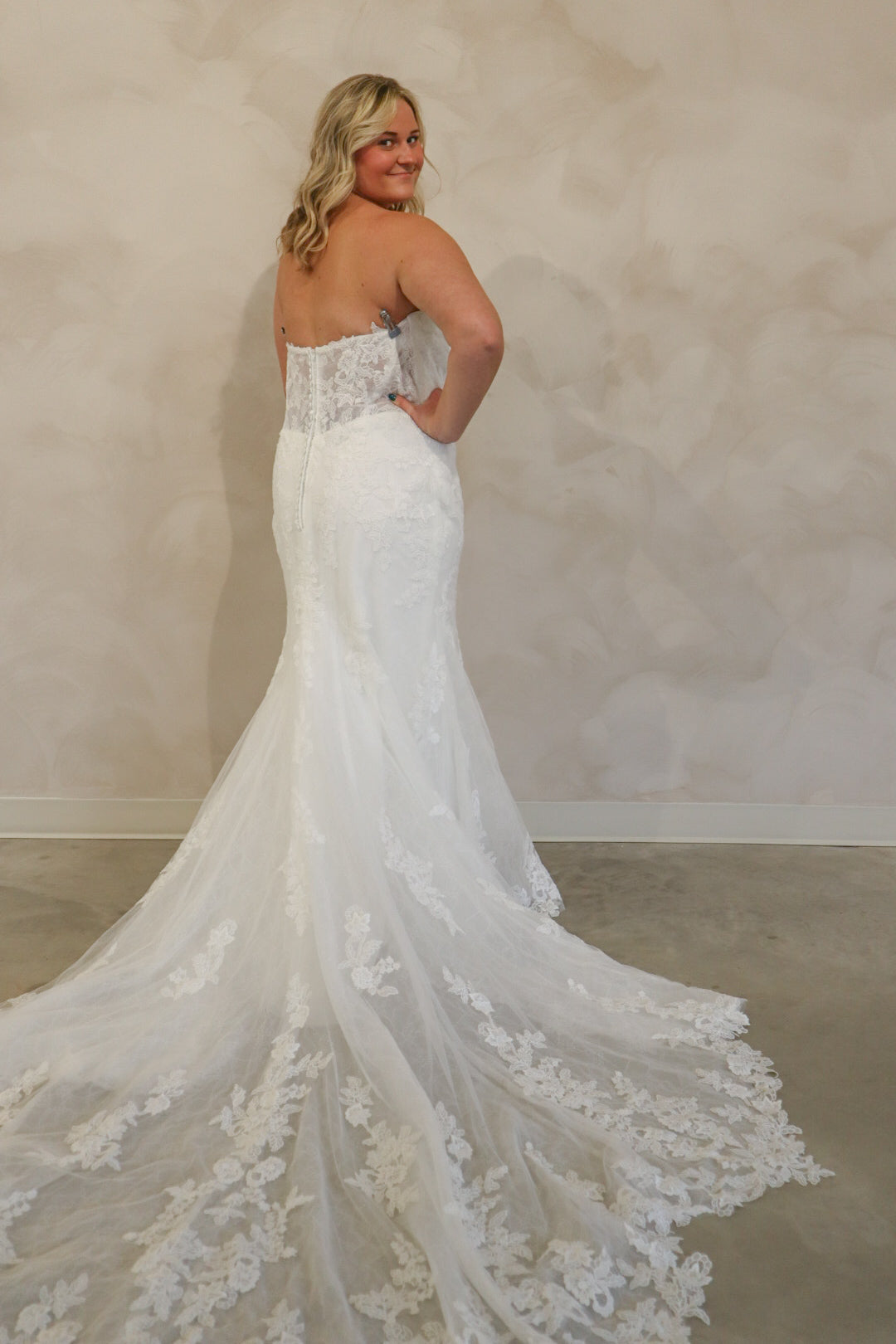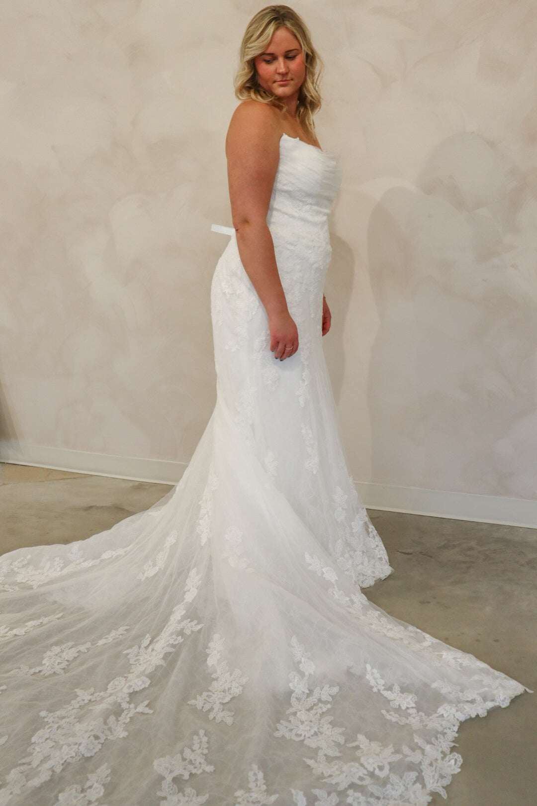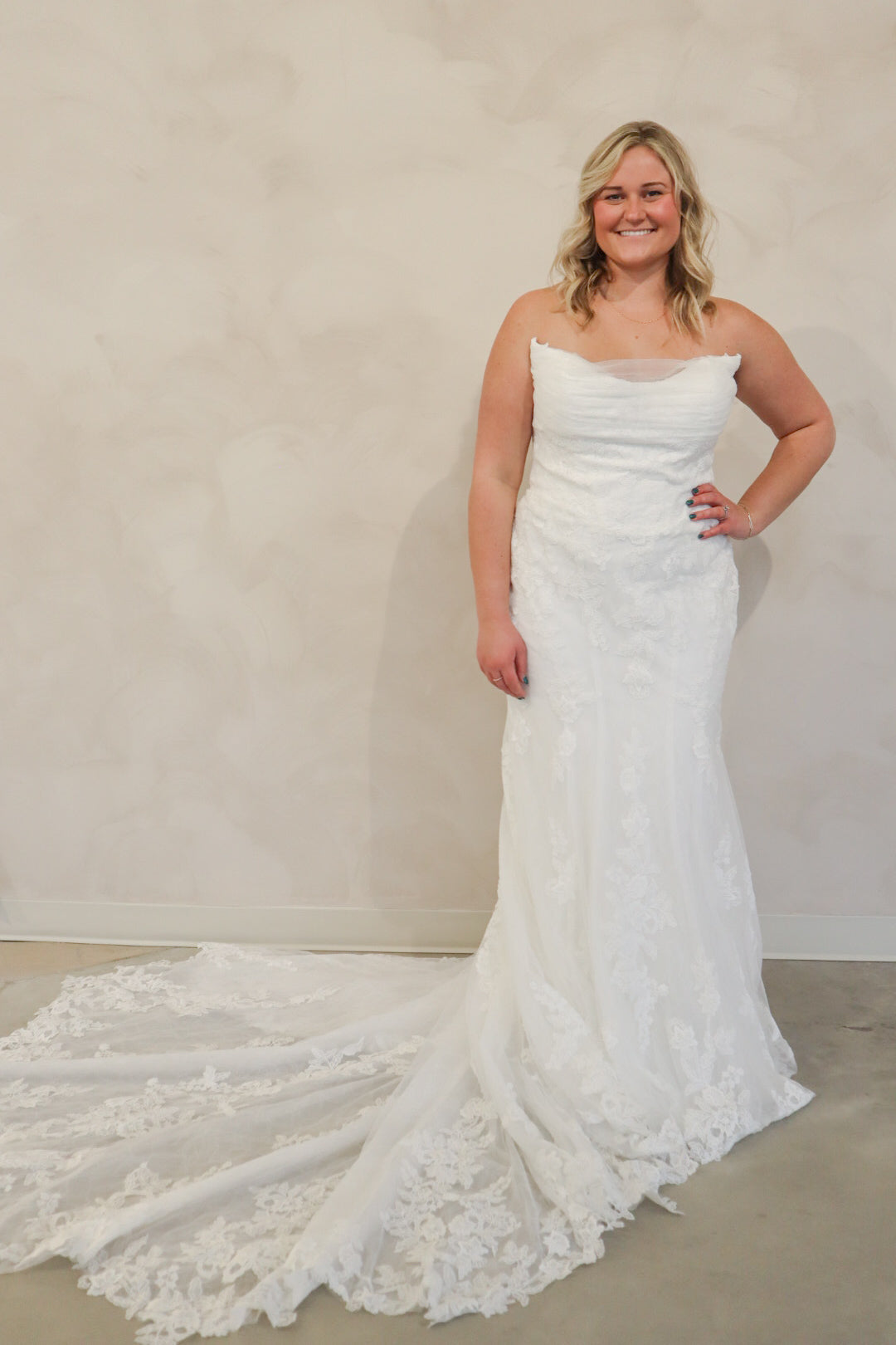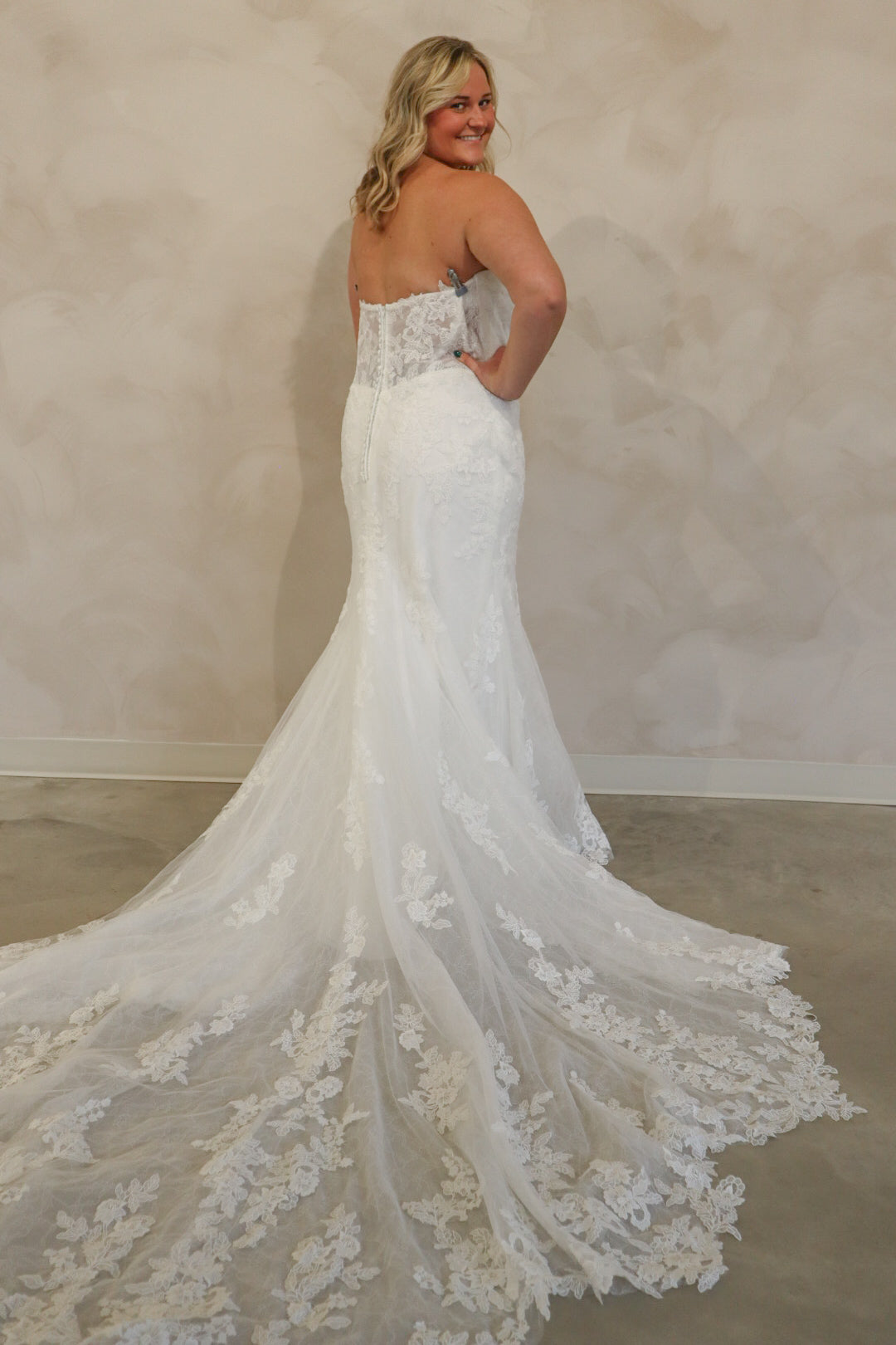 Introducing "Graham," a breathtaking blend of romance and sophistication, designed for the bride who loves timeless lace. This fit-and-flare silhouette is adorned with intricate lace from head to toe, sculpting the body beautifully before flowing into a stunning lace train. The strapless neckline is complemented by delicate off-the-shoulder long lace sleeves, adding a touch of ethereal elegance. With every detail thoughtfully crafted, "Graham" is the perfect choice for a bride seeking classic beauty with a modern, dramatic flair.