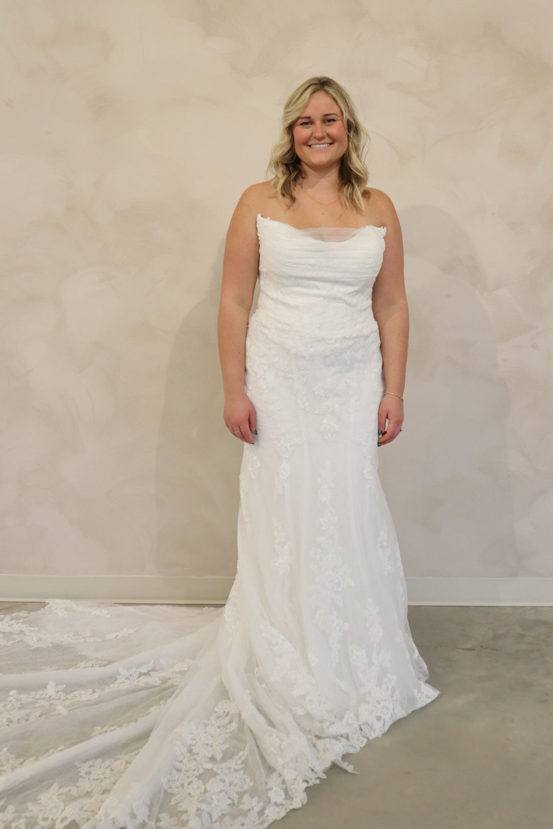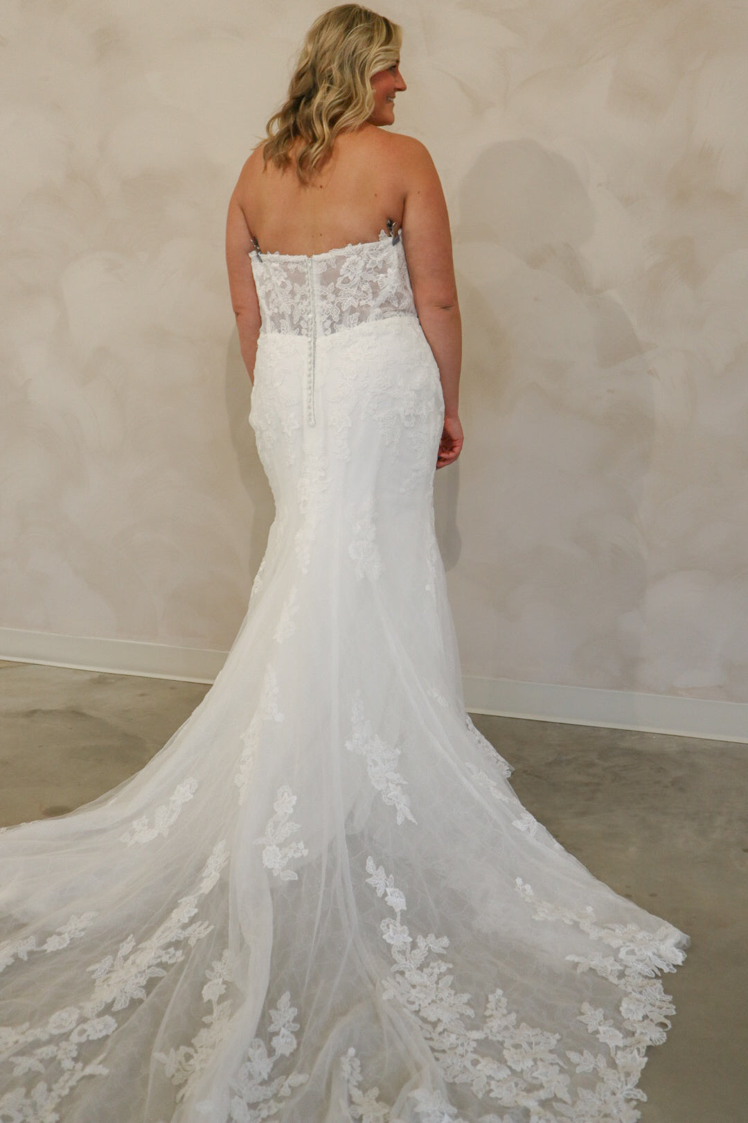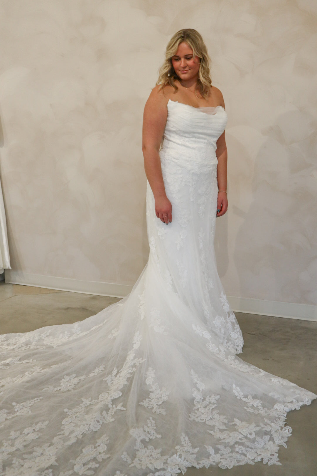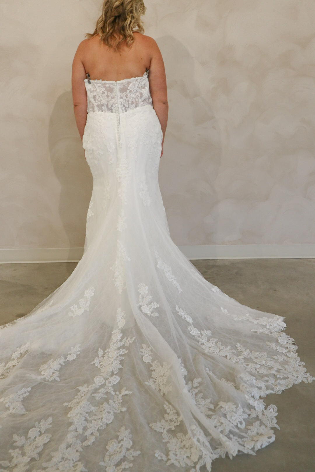 Introducing "Graham," a breathtaking blend of romance and sophistication, designed for the bride who loves timeless lace. This fit-and-flare silhouette is adorned with intricate lace from head to toe, sculpting the body beautifully before flowing into a stunning lace train. The strapless neckline is complemented by delicate off-the-shoulder long lace sleeves, adding a touch of ethereal elegance. With every detail thoughtfully crafted, "Graham" is the perfect choice for a bride seeking classic beauty with a modern, dramatic flair.