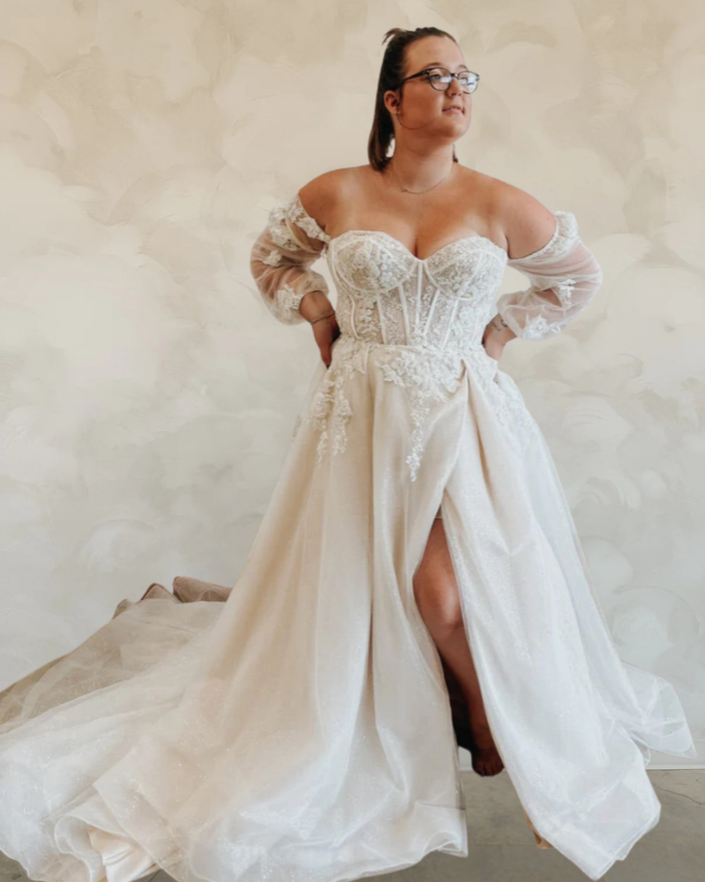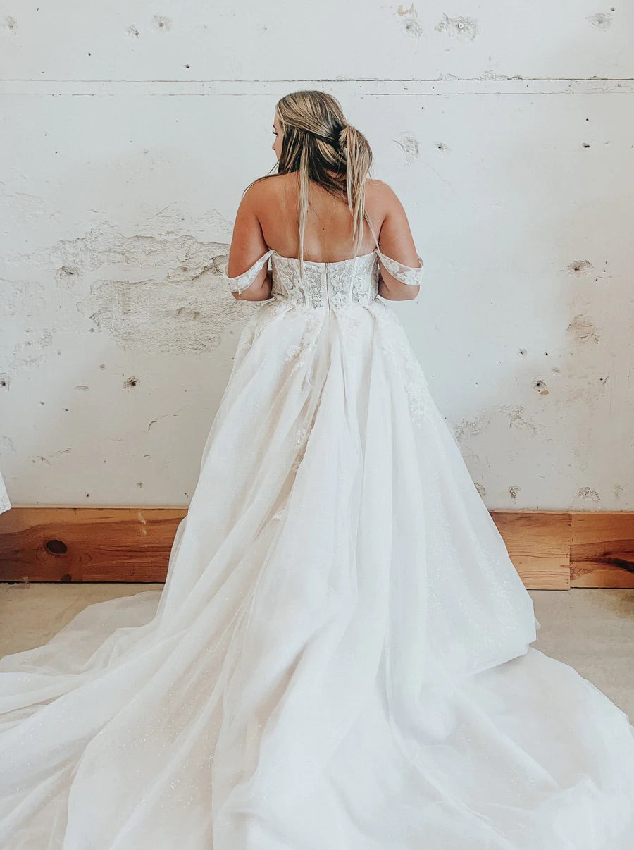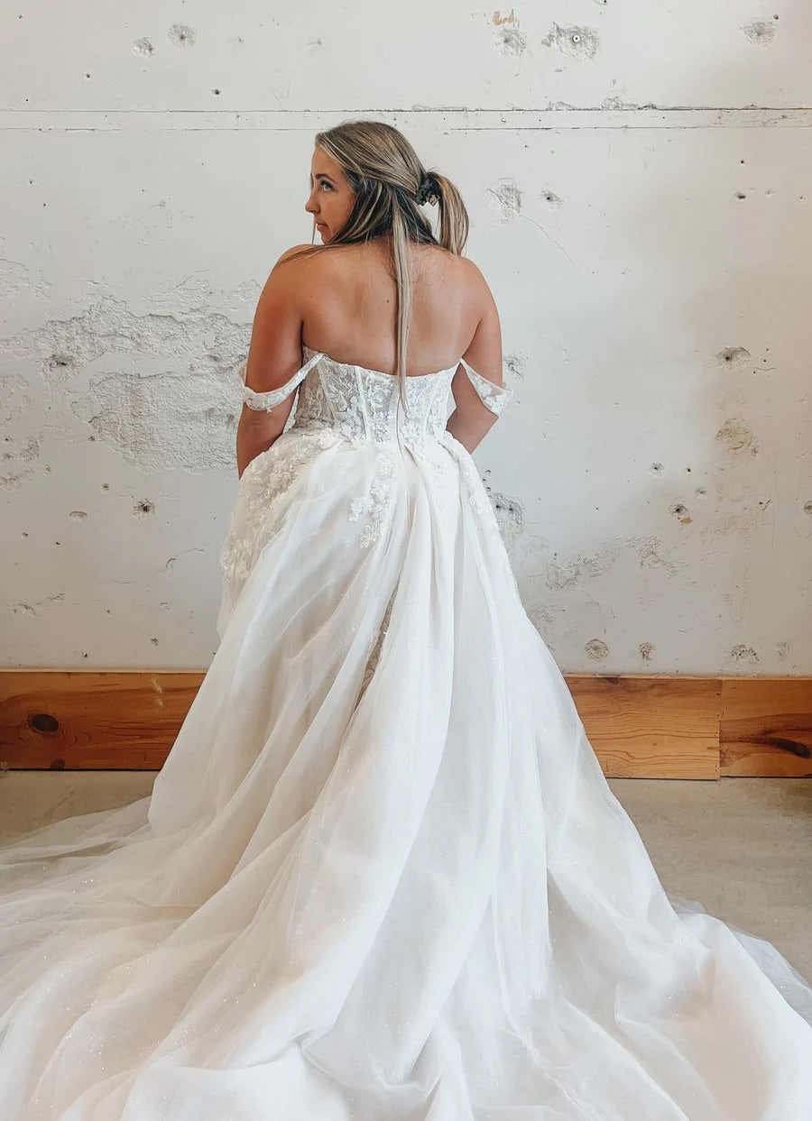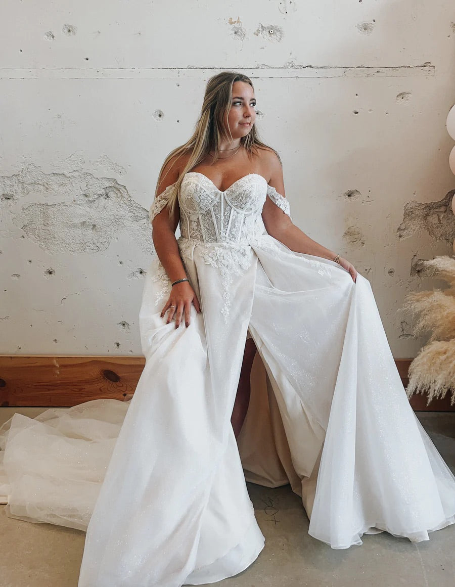 Introducing "Gwen"- This dress is a stunning combination of bold drama and delicate romance. The structured corset bodice creates a striking silhouette, with intricate lace and beadwork adding texture and femininity. The optional sleeves are a gorgeous touch of softness, balancing the more structured elements of the gown. The flowy skirt features a daring thigh-high slit that gives it a modern edge while still exuding elegance. Perfect for a bride who wants to feel powerful yet graceful, this gown is ideal for a memorable wedding day that makes a statement.