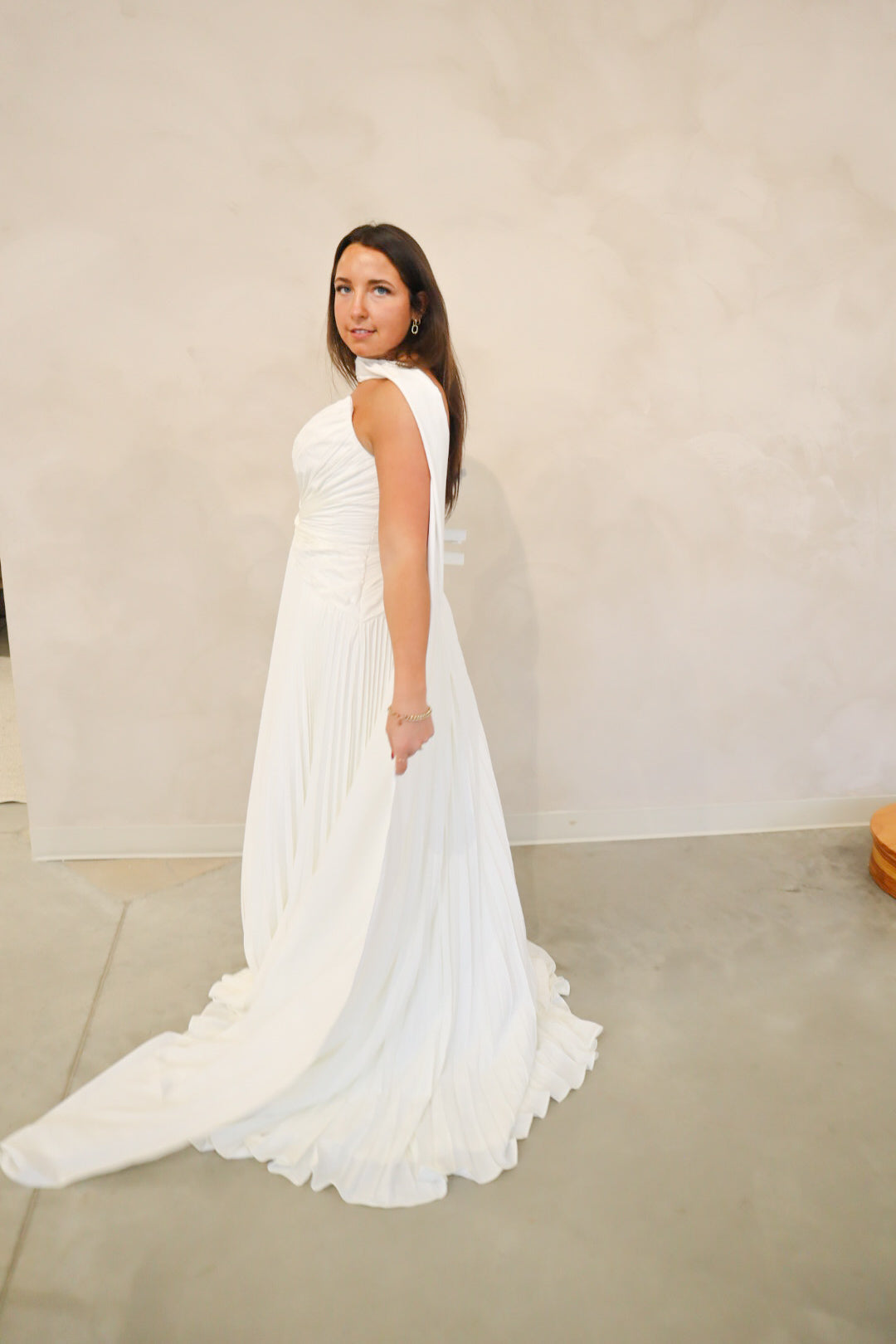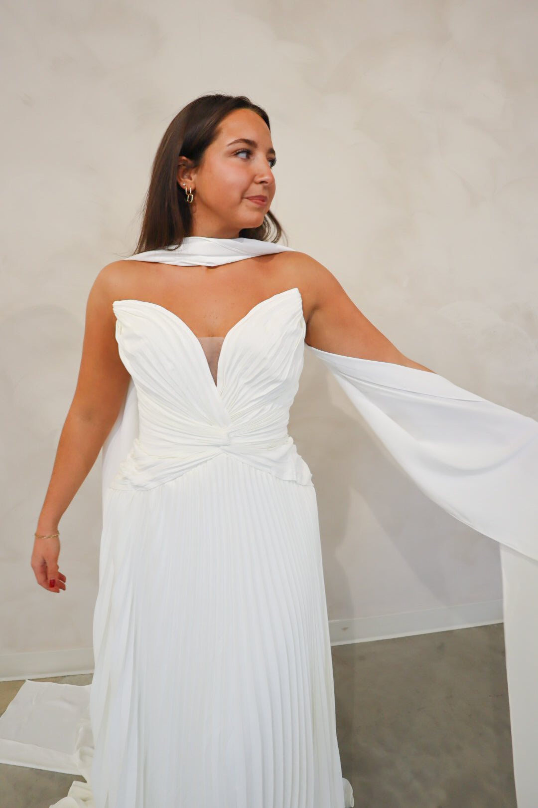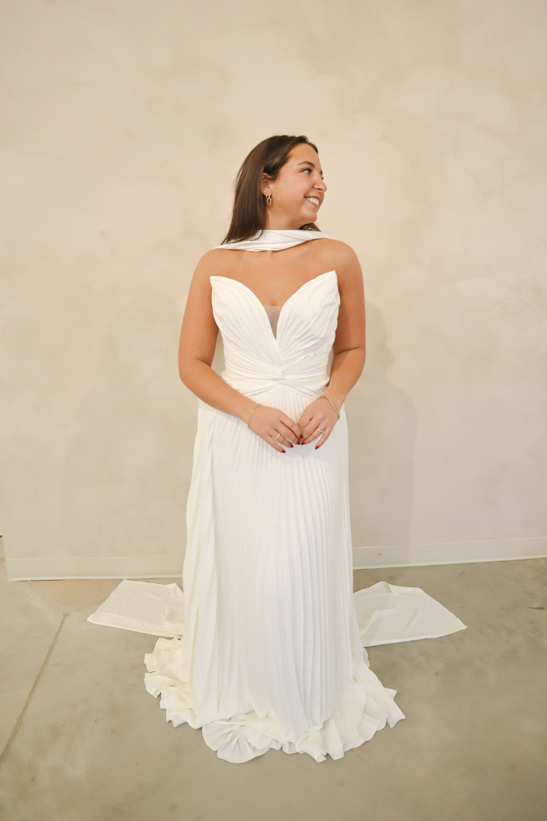 Meet "Hazel" - A modern goddess moment come to life. This ethereal gown features a soft, sculpted sweetheart bodice with delicate pleating that draws the eye inward and creates a beautifully cinched waist. The fabric drapes effortlessly into a finely pleated skirt that flows with every step, giving her a dreamy, lightweight movement brides love.