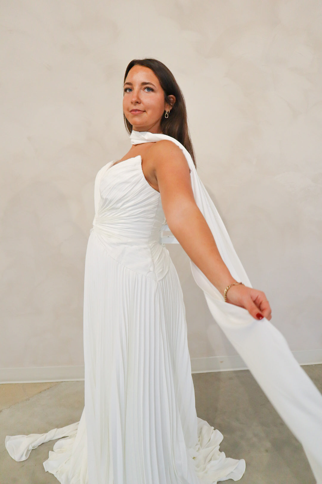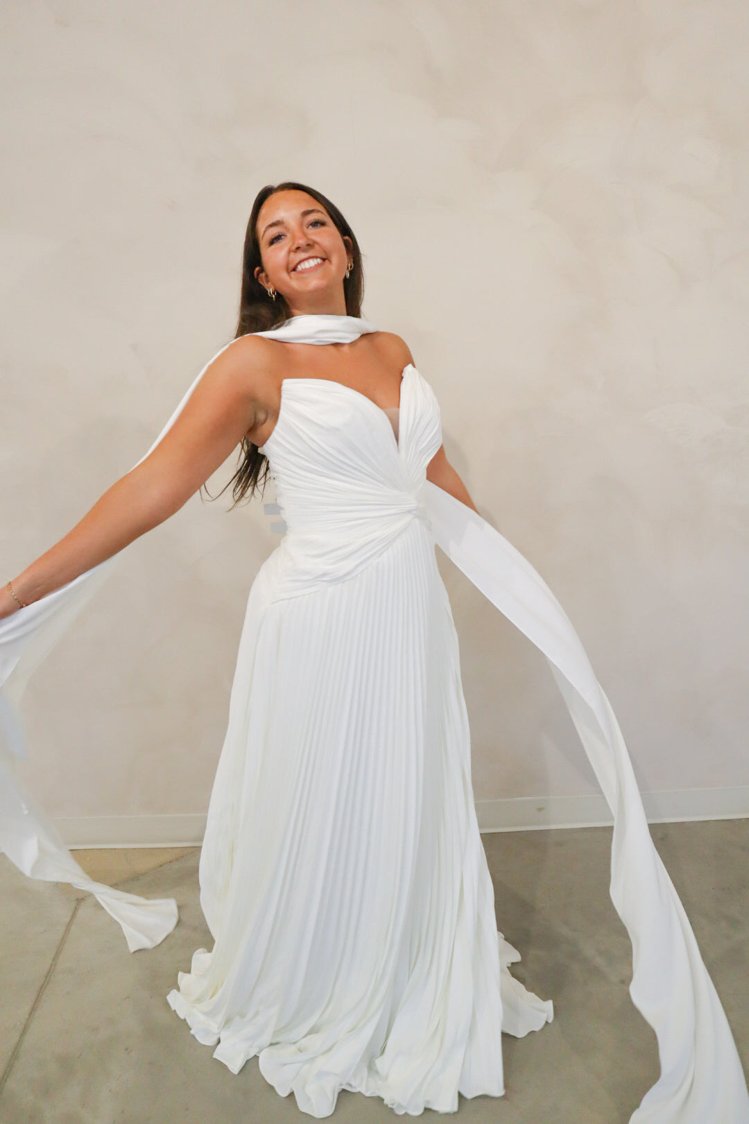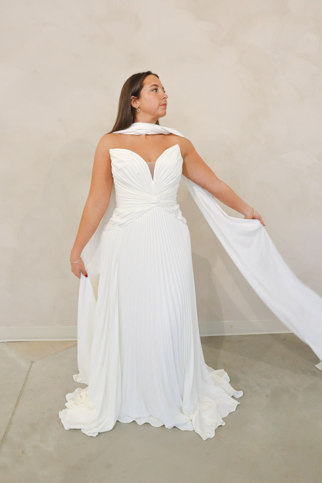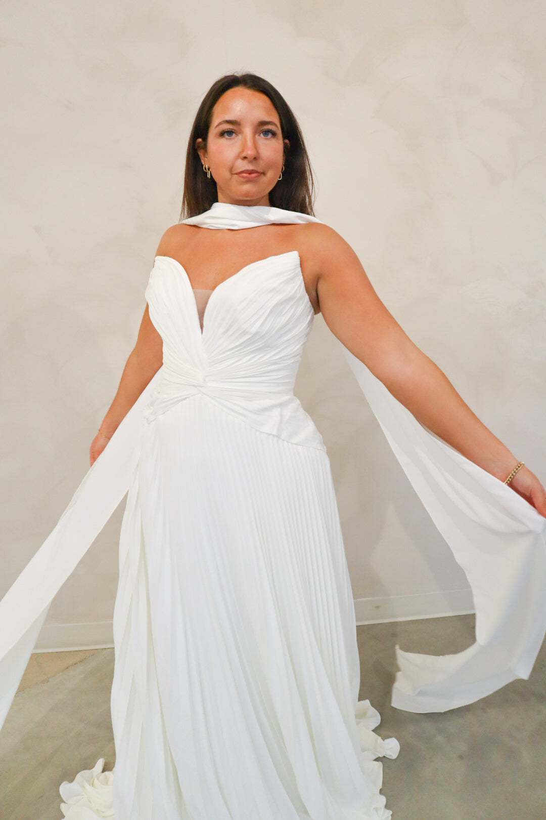 Meet "Hazel" - A modern goddess moment come to life. This ethereal gown features a soft, sculpted sweetheart bodice with delicate pleating that draws the eye inward and creates a beautifully cinched waist. The fabric drapes effortlessly into a finely pleated skirt that flows with every step, giving her a dreamy, lightweight movement brides love.