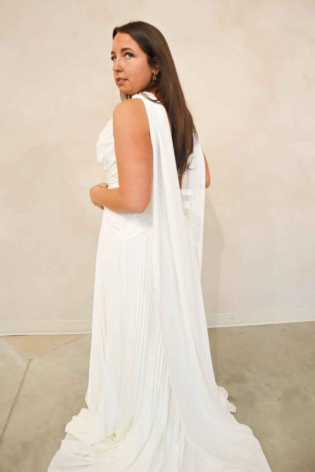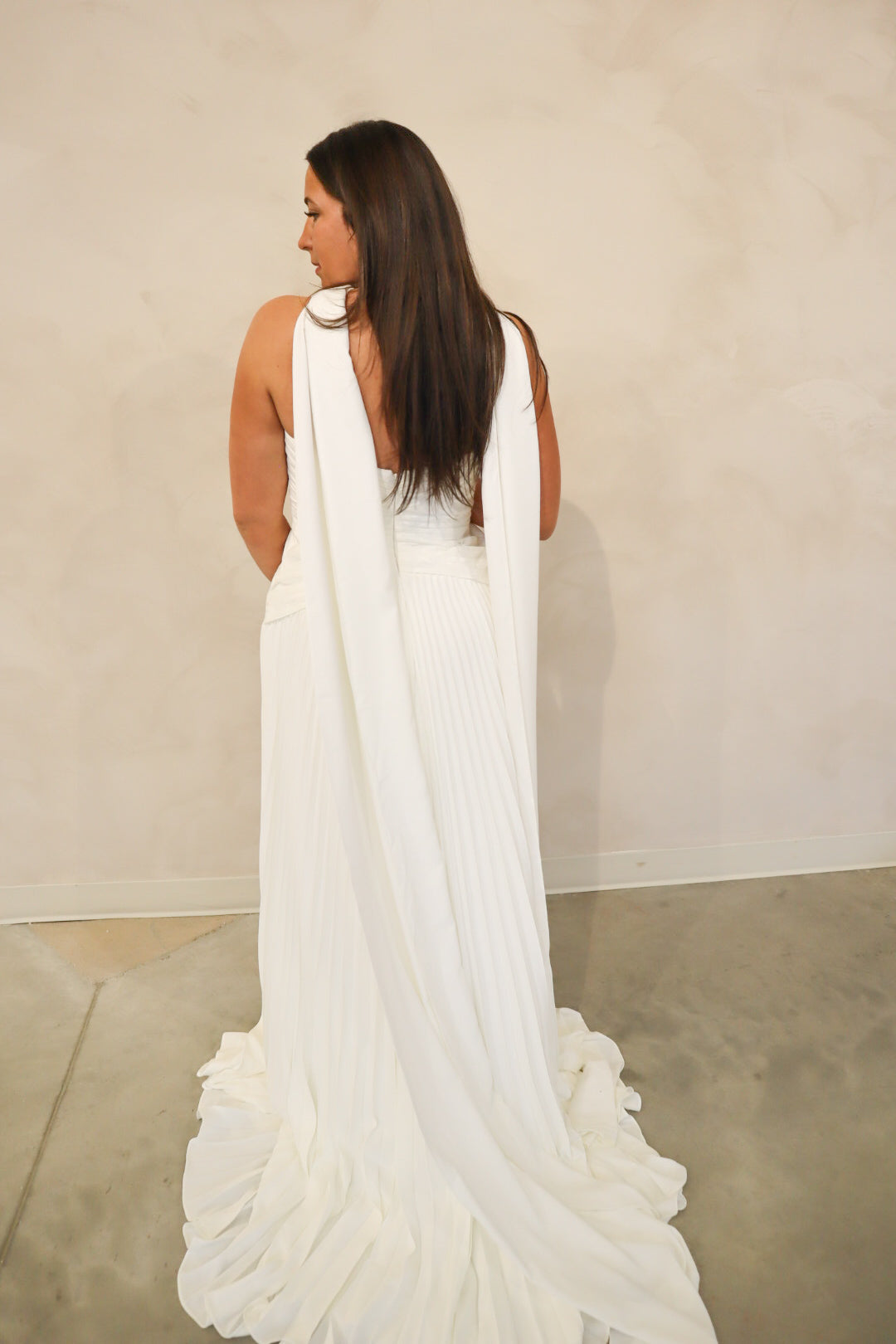 The shoulder-draped streamers that can be worn loose, tied, or styled with movement for photos — giving the gown a dramatic, cape-like effect without feeling heavy. From the back, the long pleated train and cascading scarves create a breathtaking silhouette that feels powerful, romantic, and completely unforgettable.