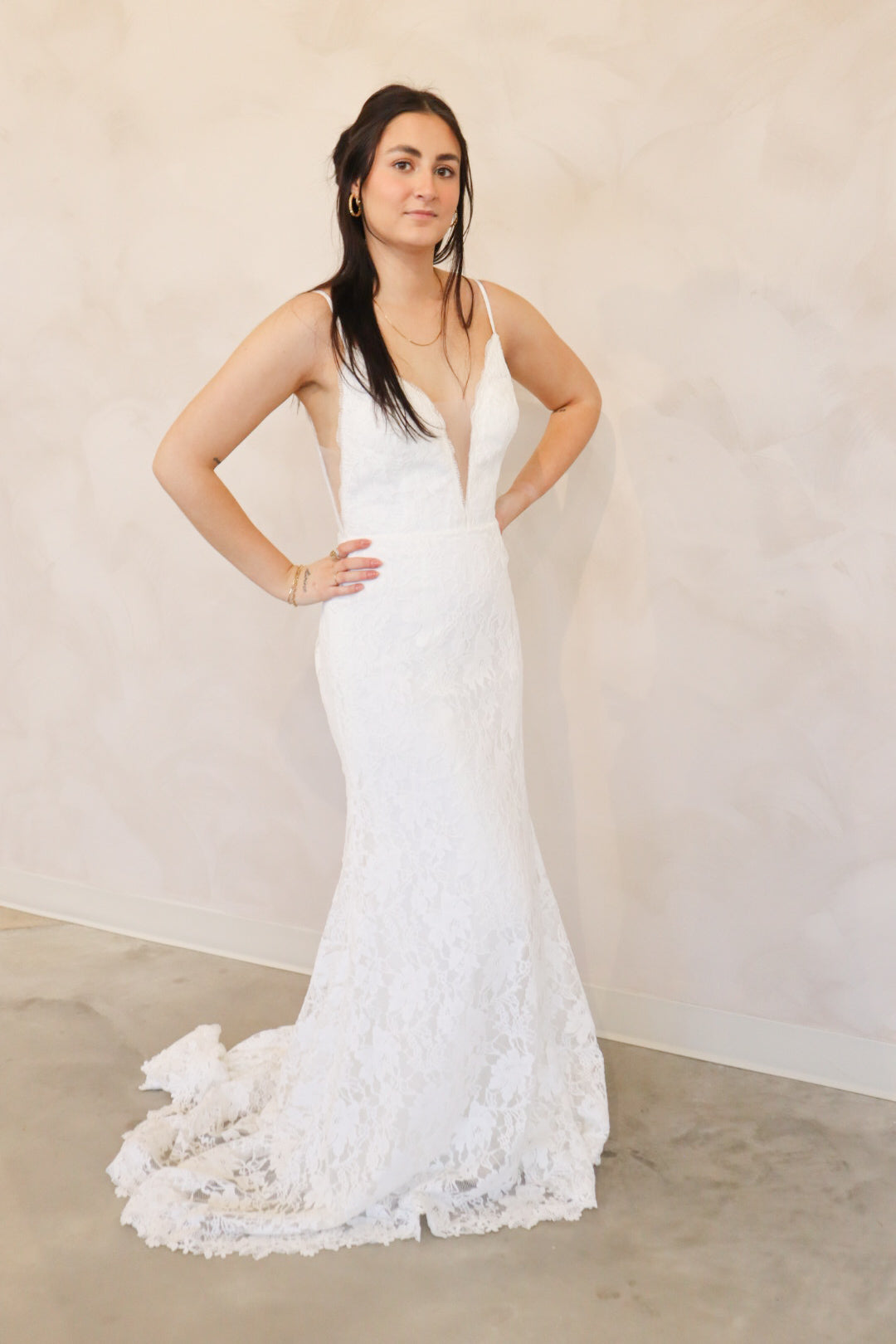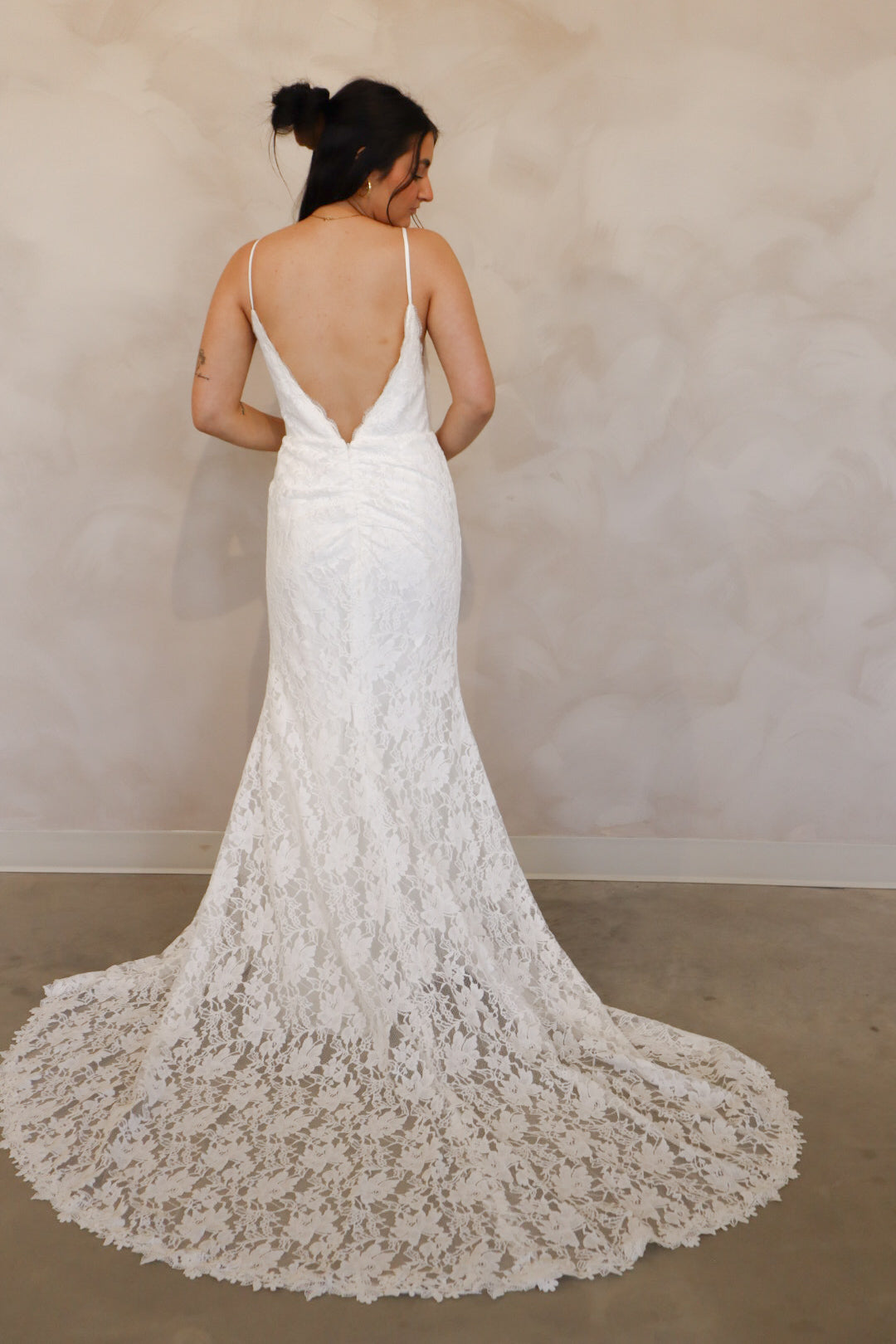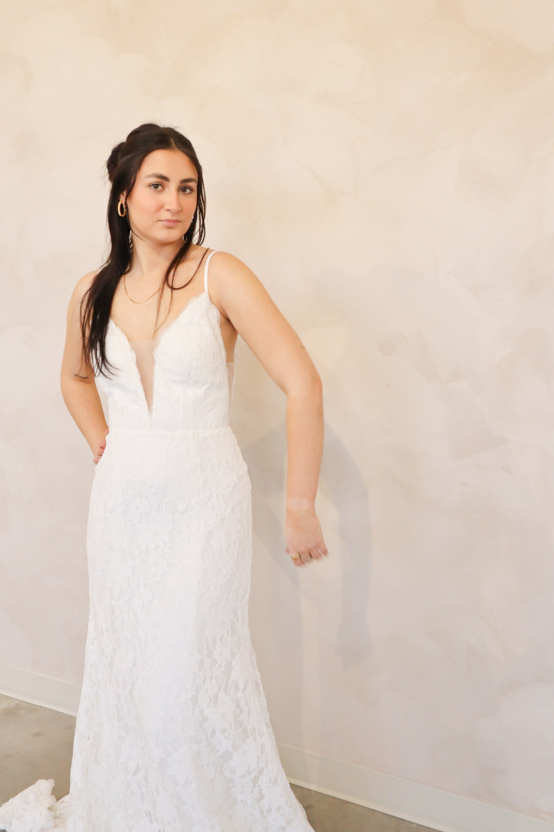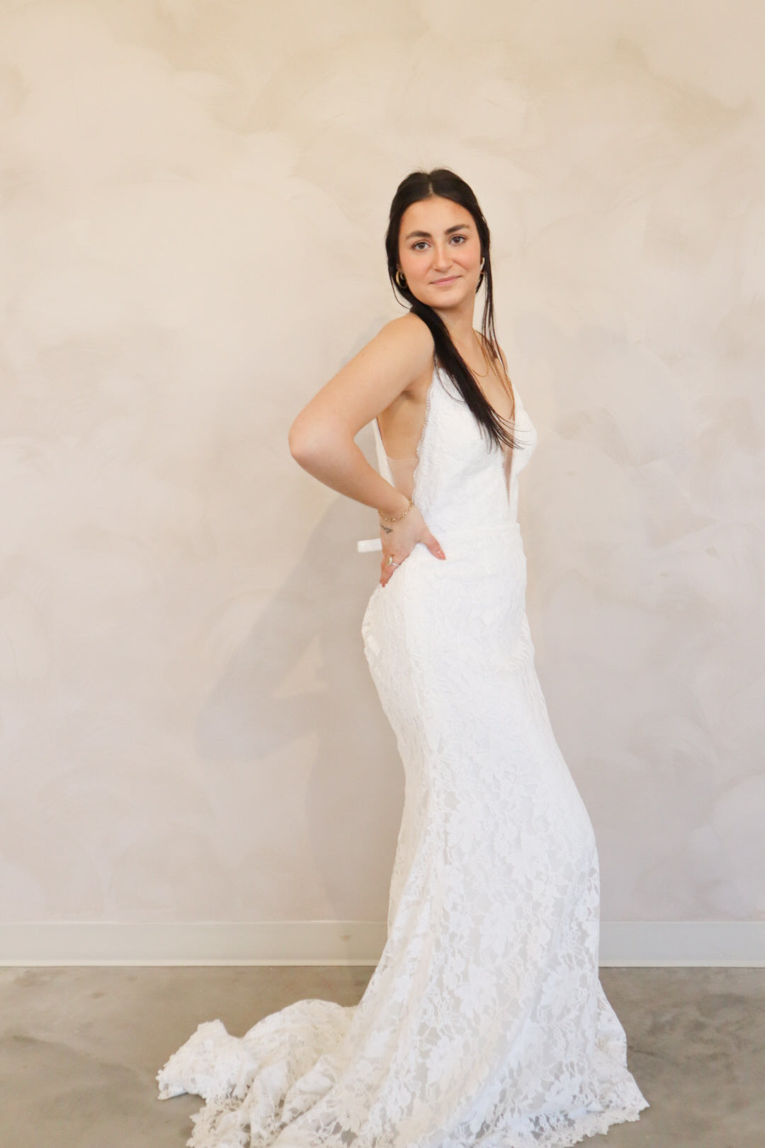 Introducing "Lennon" - a fit and flare wedding dress that has soft lace throughout. Lennon has a silk underlay and features a deep v-neckline, an open back, and thin straps. Lennon is perfect for your intimate affair or outdoor wedding and is the perfect mix between boho and modern.
