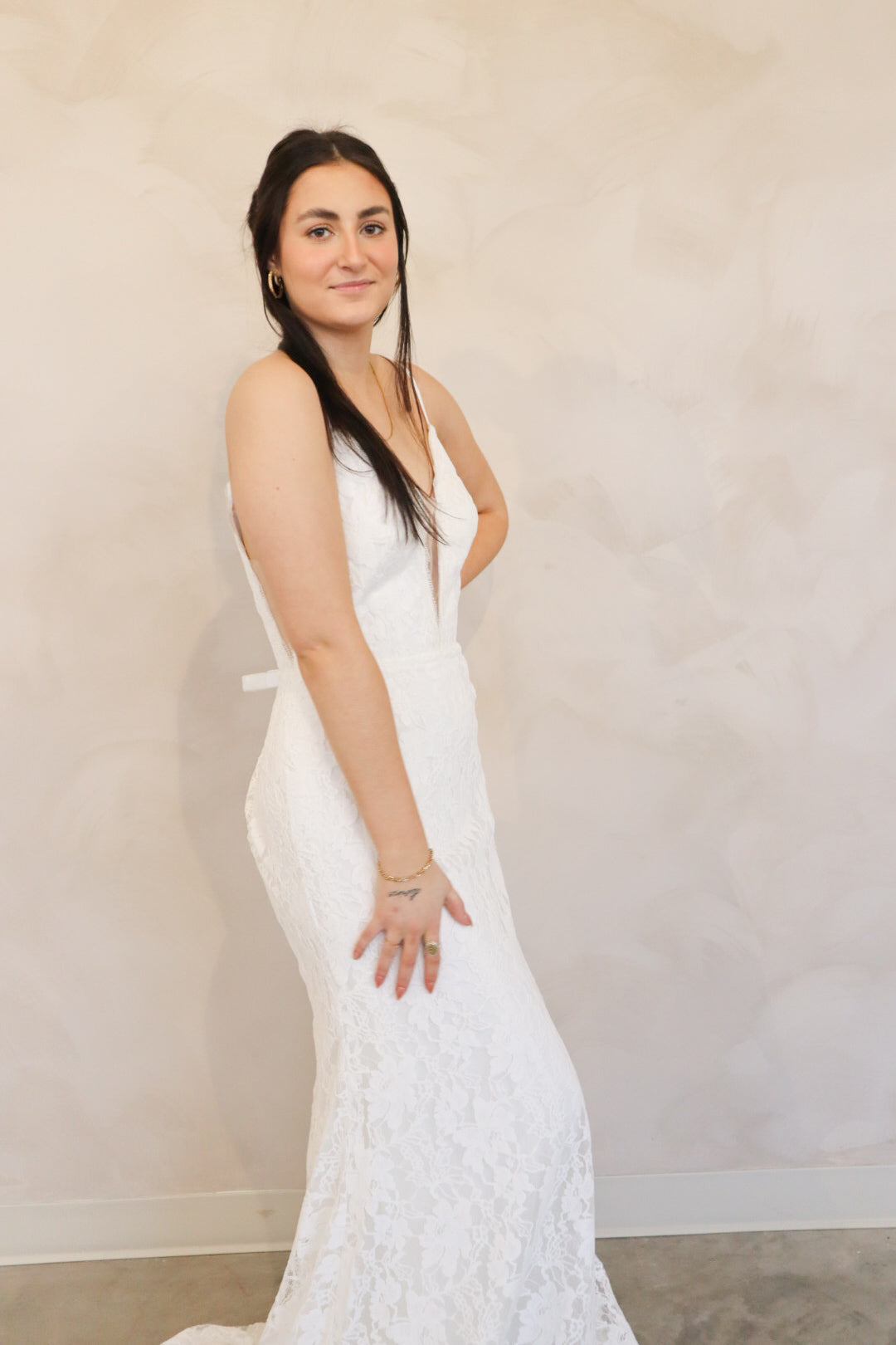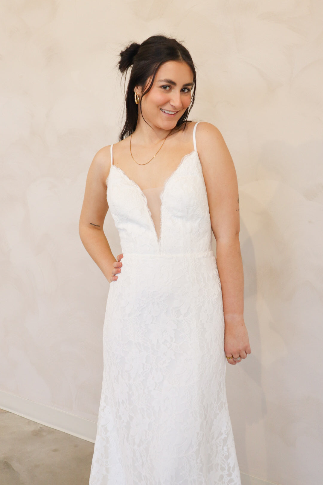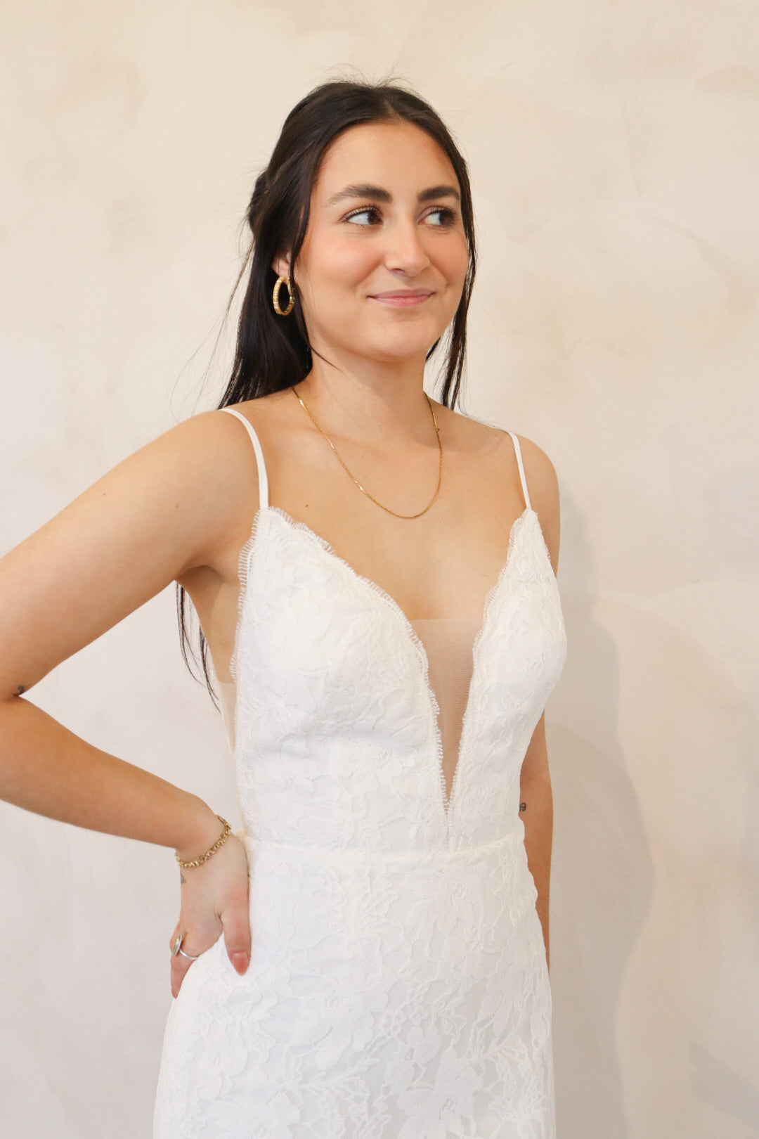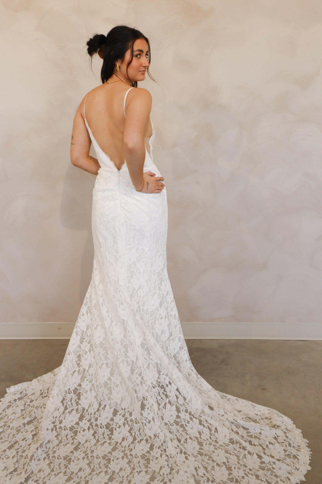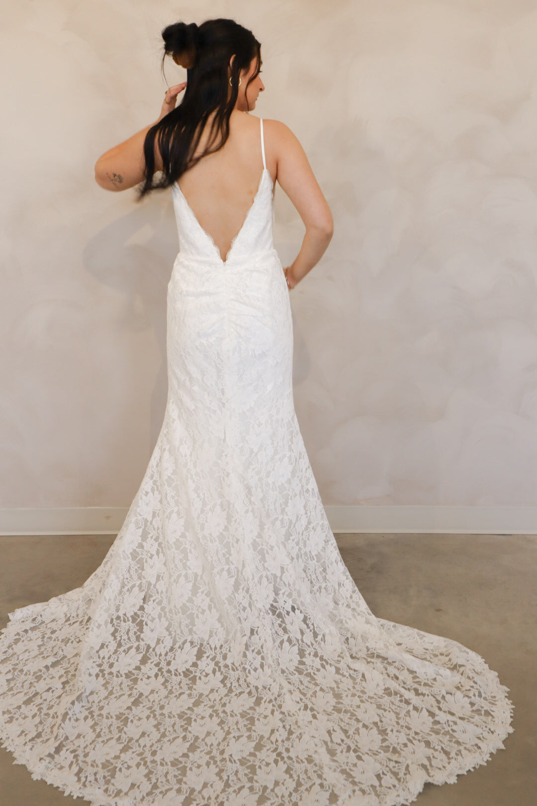 Introducing "Lennon" - a fit and flare wedding dress that has soft lace throughout. Lennon has a silk underlay and features a deep v-neckline, an open back, and thin straps. Lennon is perfect for your intimate affair or outdoor wedding and is the perfect mix between boho and modern.