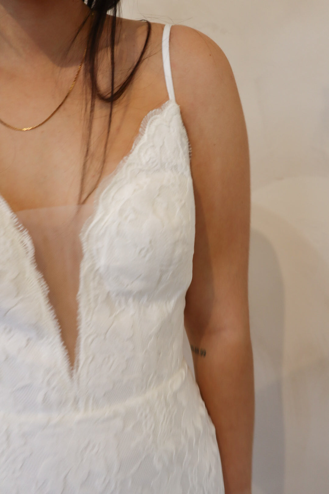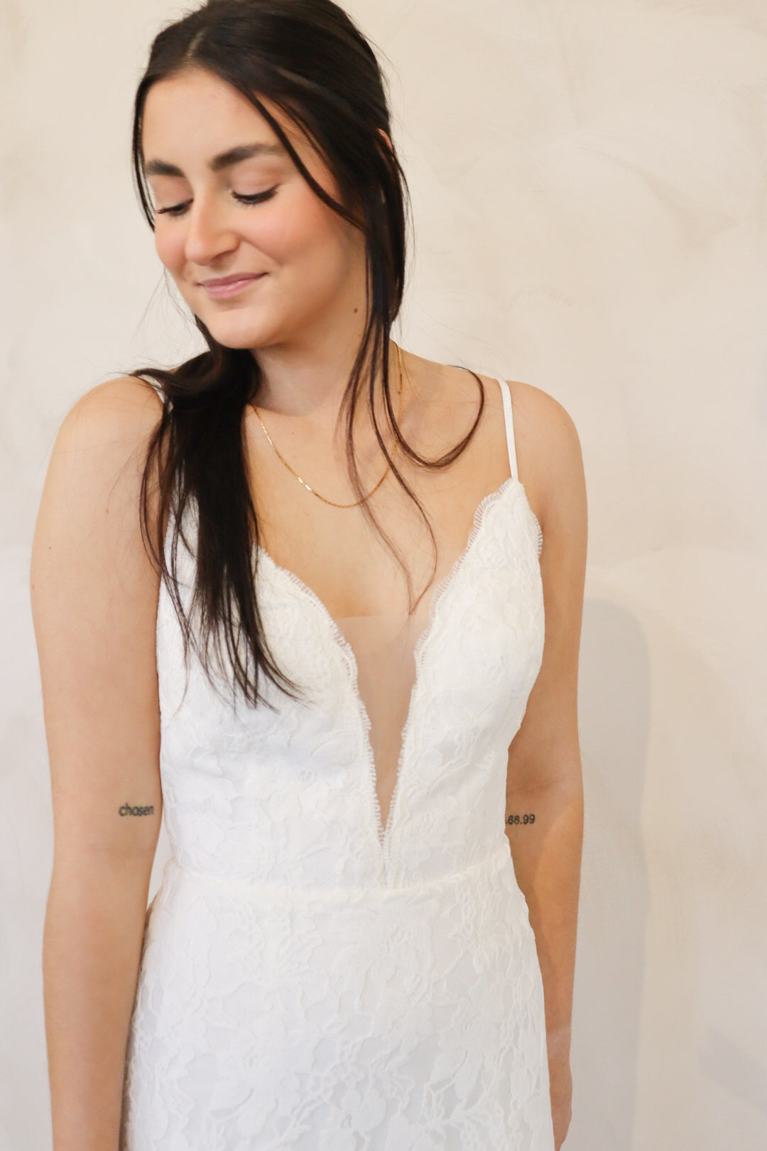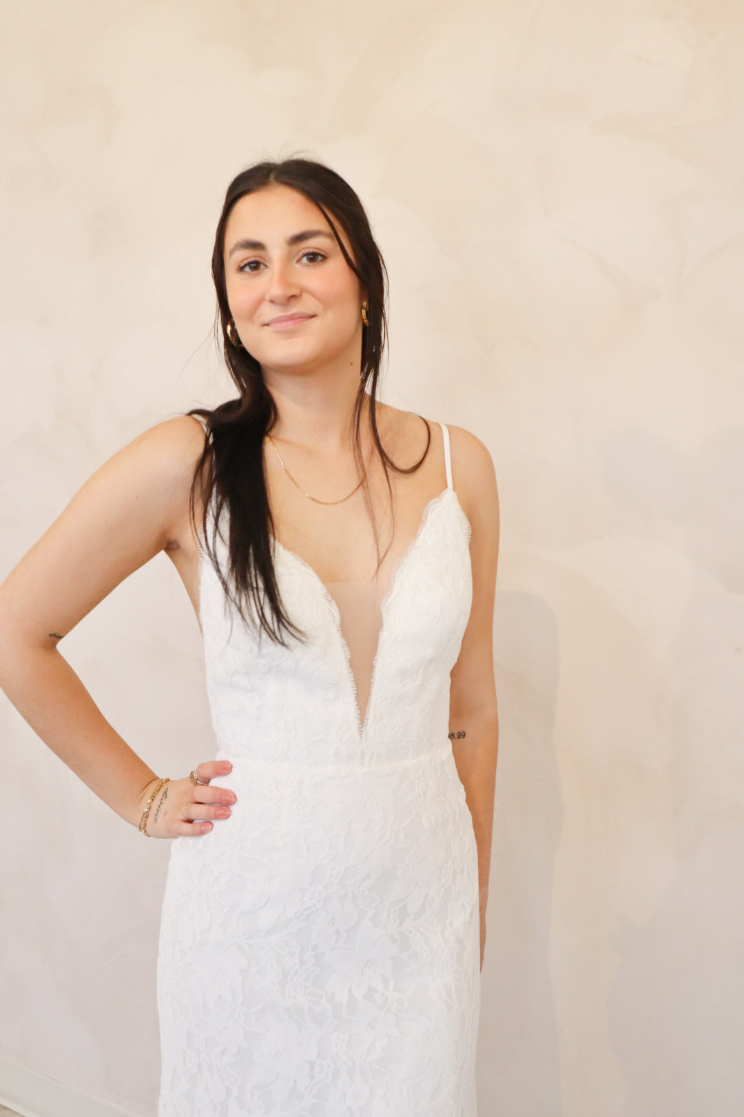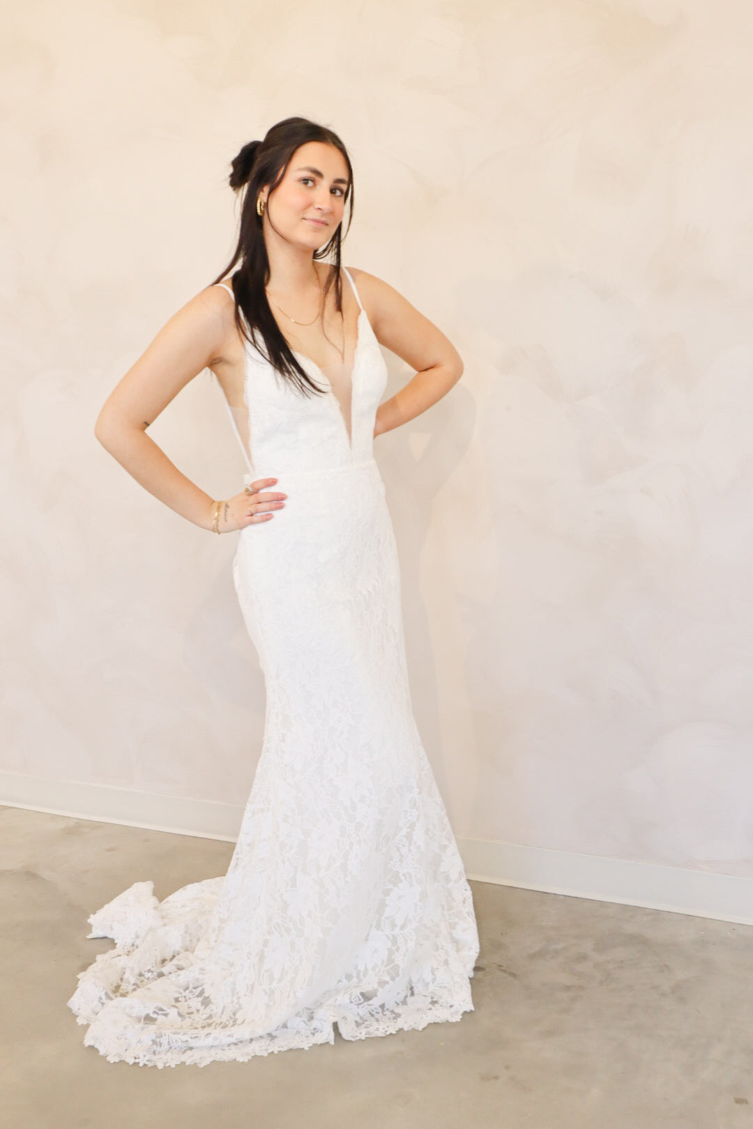 Introducing "Lennon" - a fit and flare wedding dress that has soft lace throughout. Lennon has a silk underlay and features a deep v-neckline, an open back, and thin straps. Lennon is perfect for your intimate affair or outdoor wedding and is the perfect mix between boho and modern.