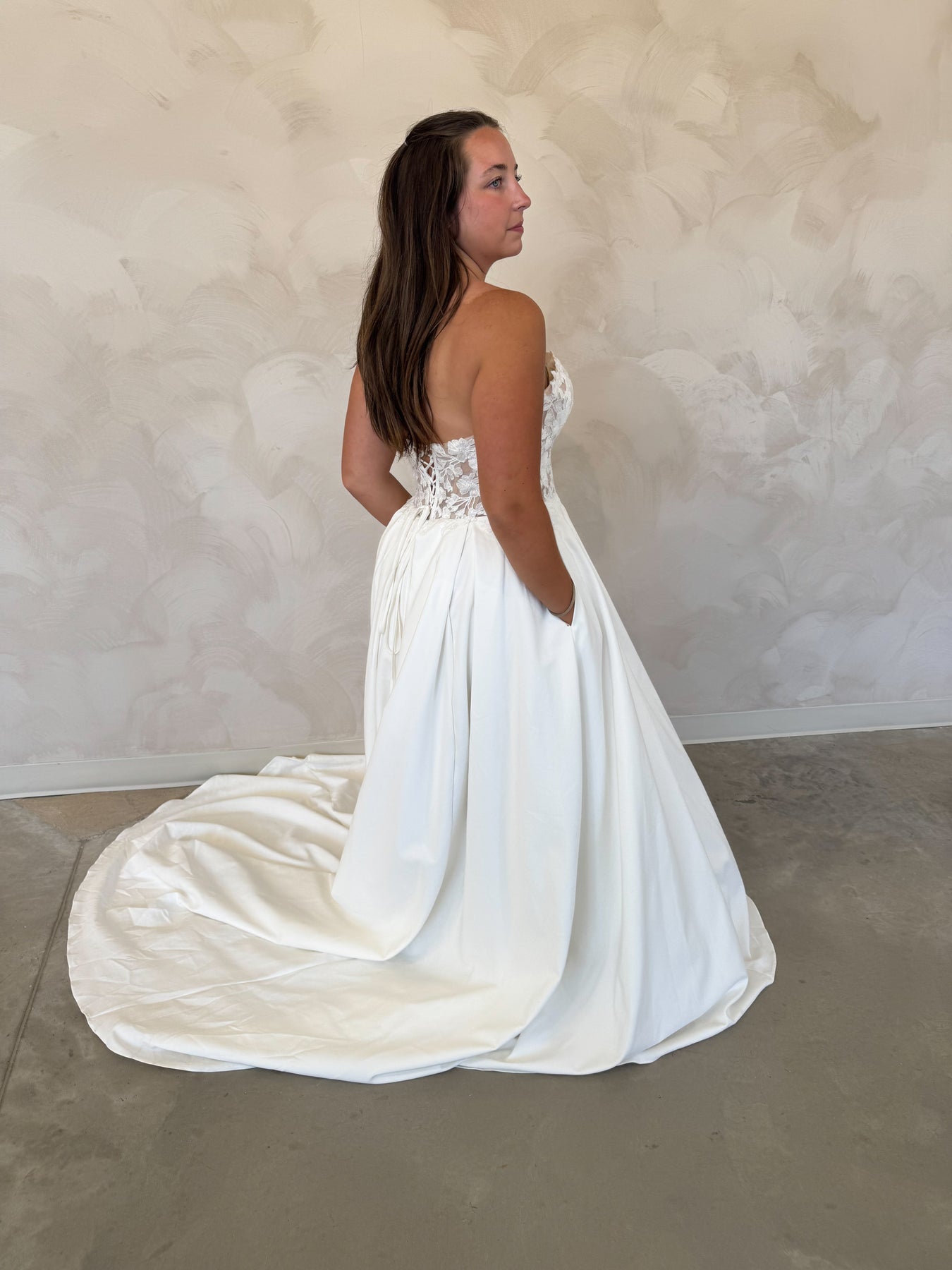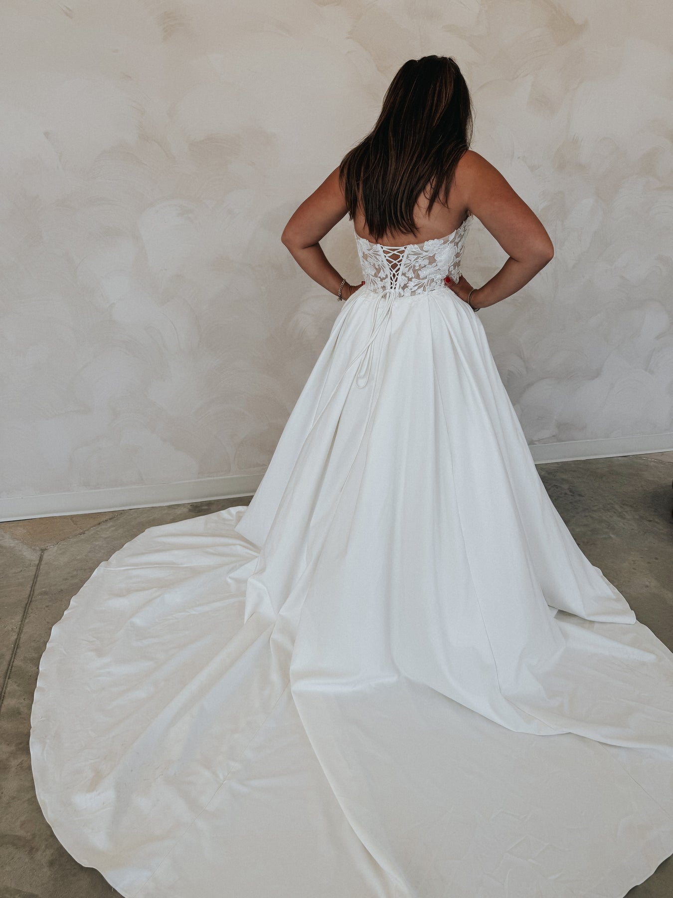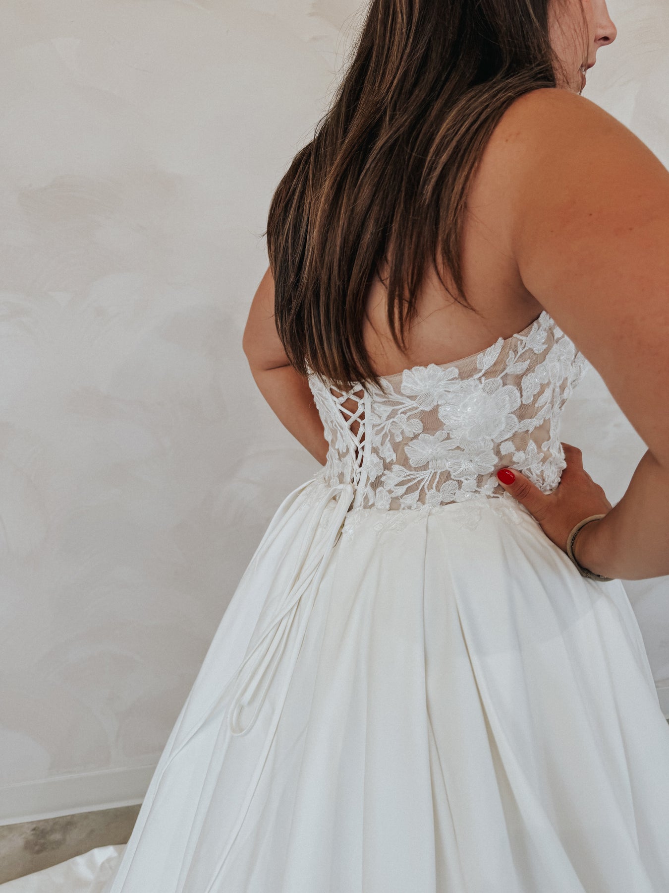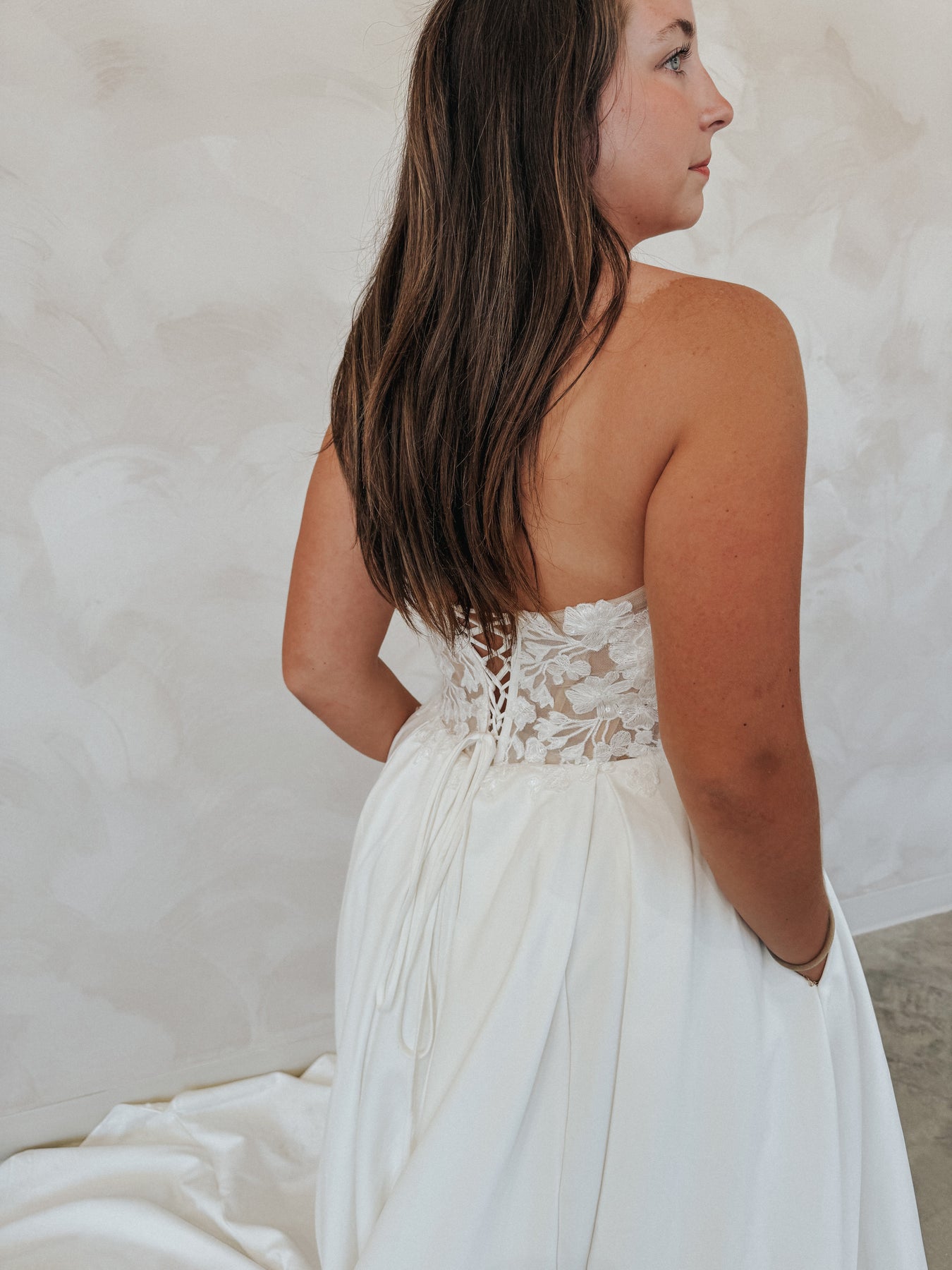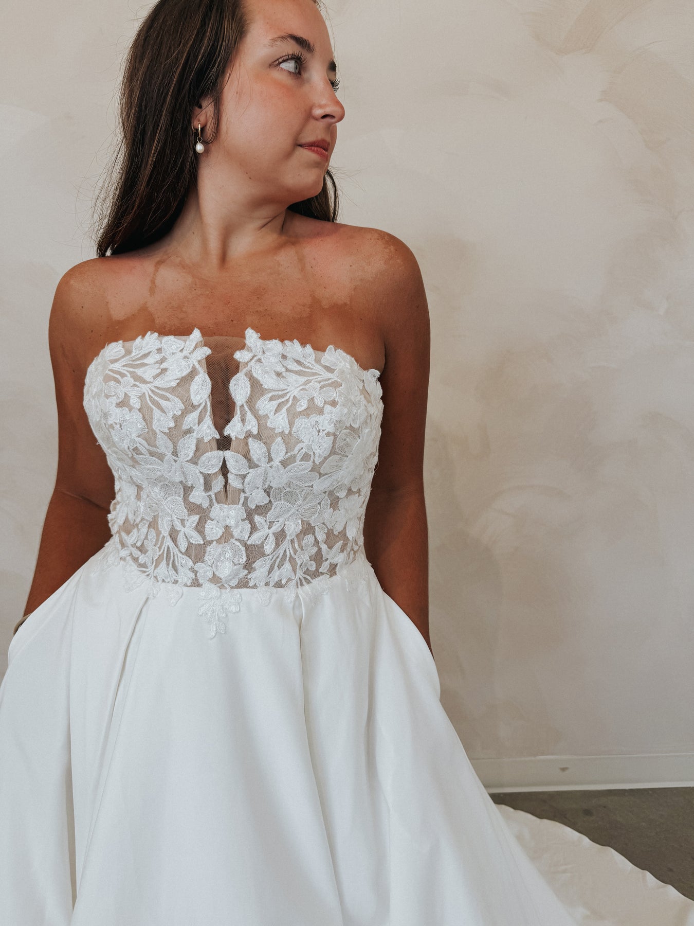 Meet “Lola” — sweet, structured, and made to move. This strapless A-line gown pairs a romantic floral lace bodice with a clean, flowy skirt for the ultimate modern-fairytale feel. The soft sweetheart neckline flatters beautifully, while the bold lace detail adds texture and charm. Lola is perfect for the bride who wants something classic with a fresh, effortless twist — the kind of dress that feels just as good as it looks.
