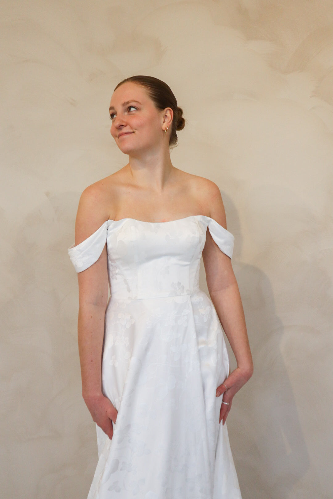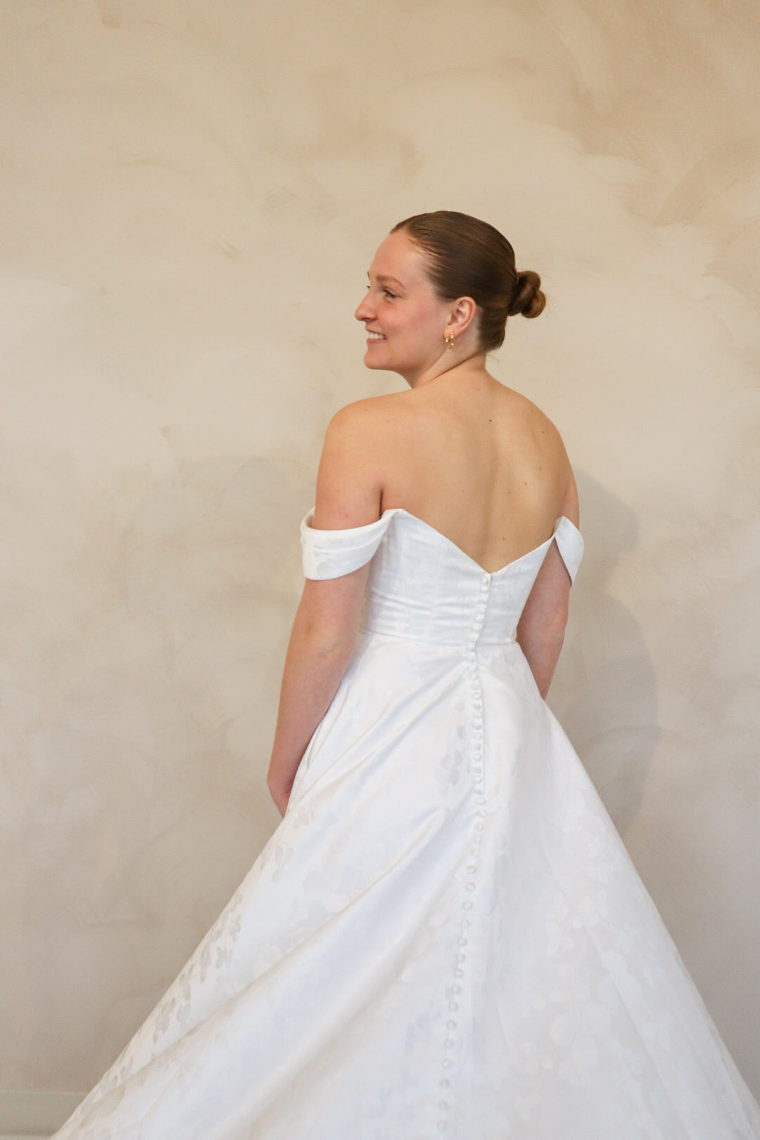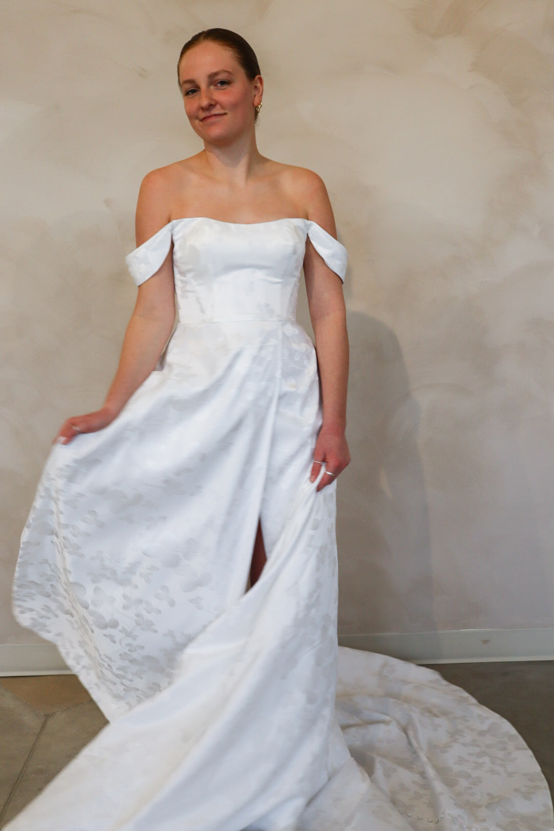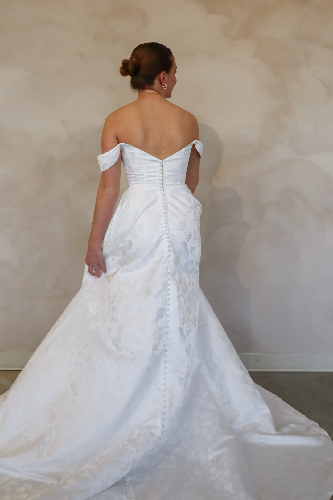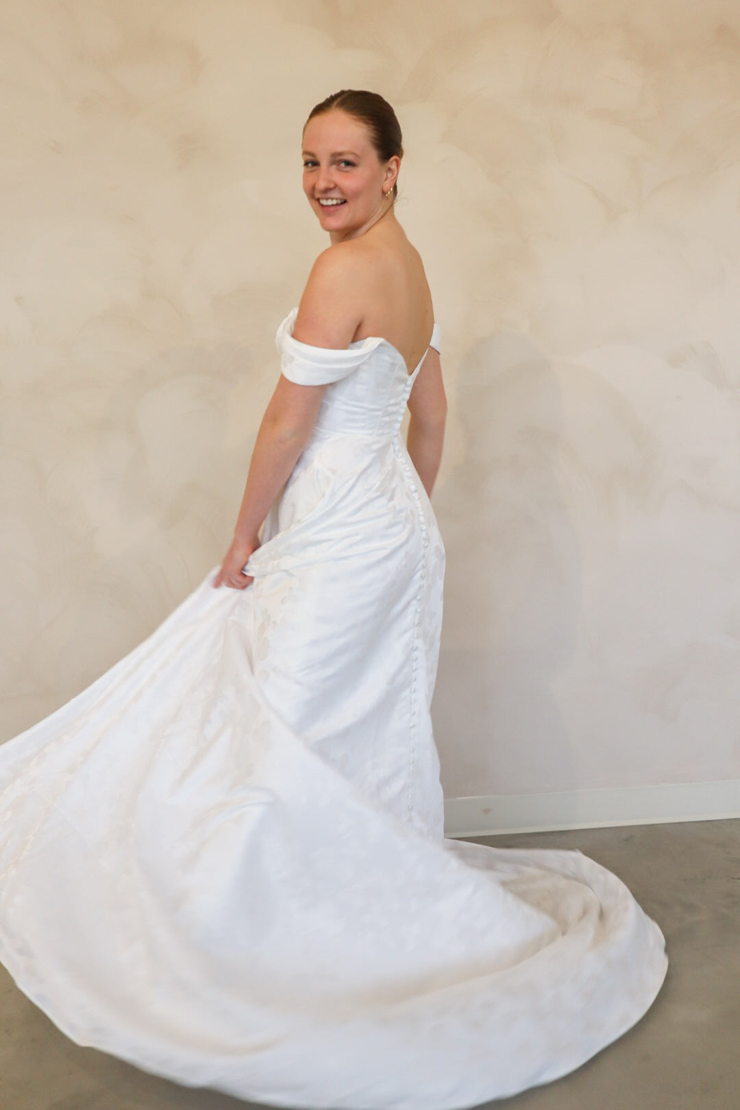 Introducing "Mae." Mae is an aline wedding dress that has a floral, satin, jacquard lace throughout. Mae features a scoop neckline with off the shoulder straps. Mae is complete with a full skirt and features a slit, as well as a stunning train with buttons down the back. This one layer wedding dress is perfect for the bride who dreams of comfort and class.