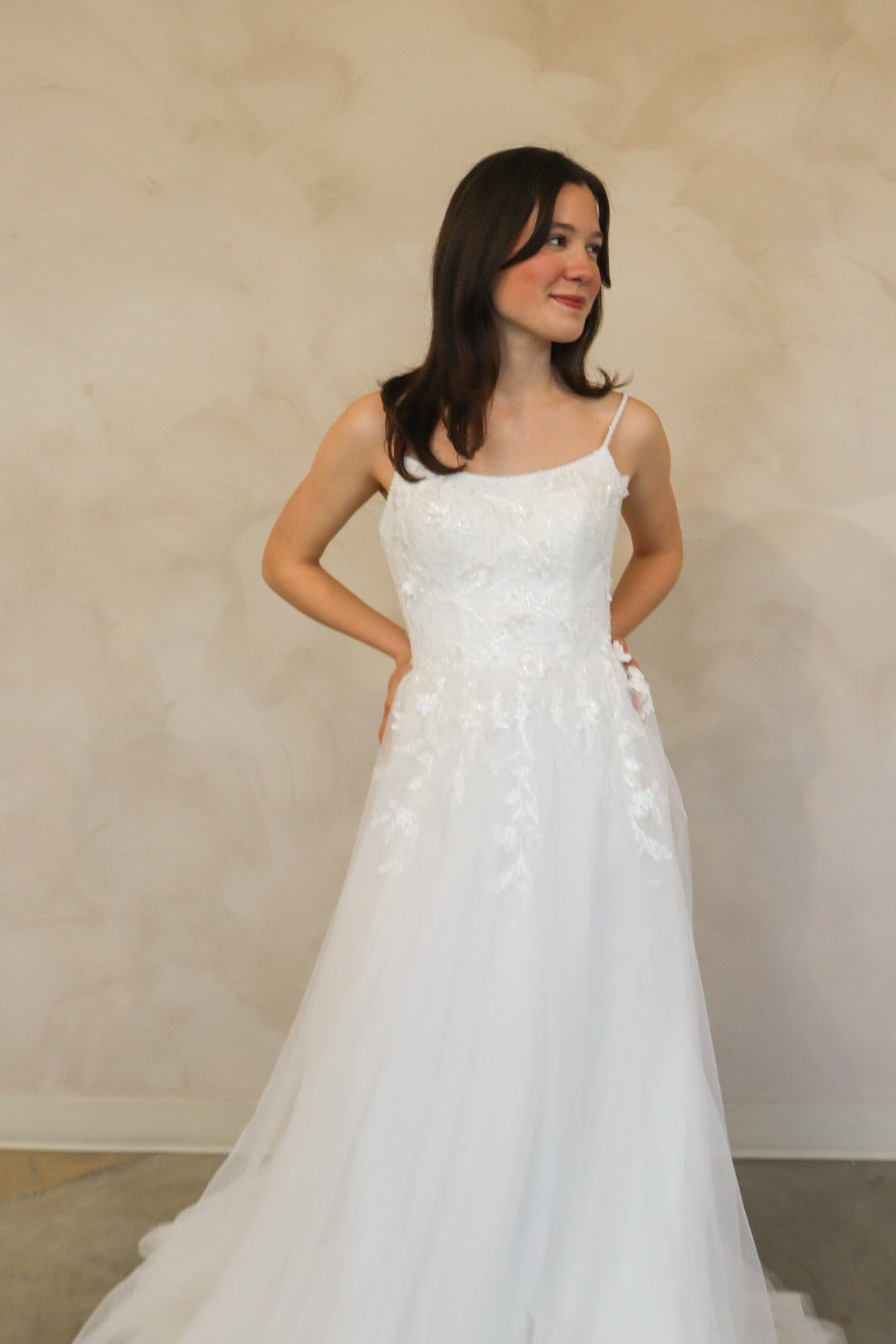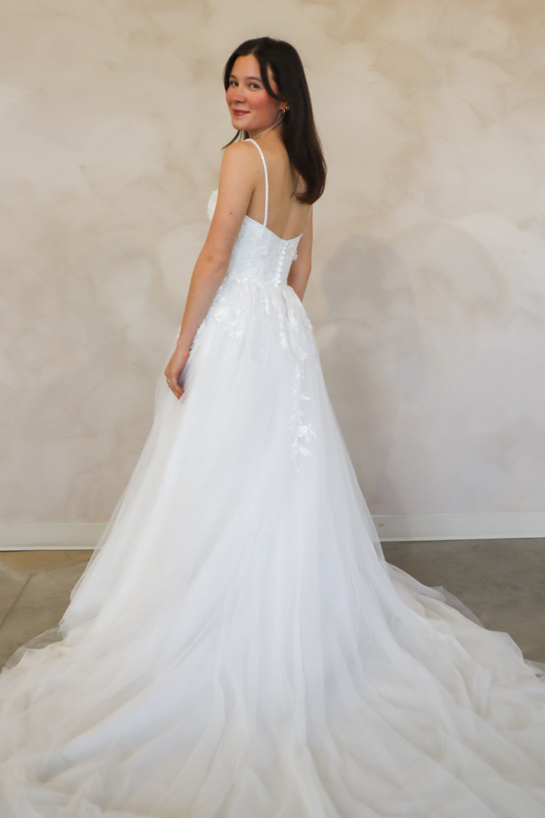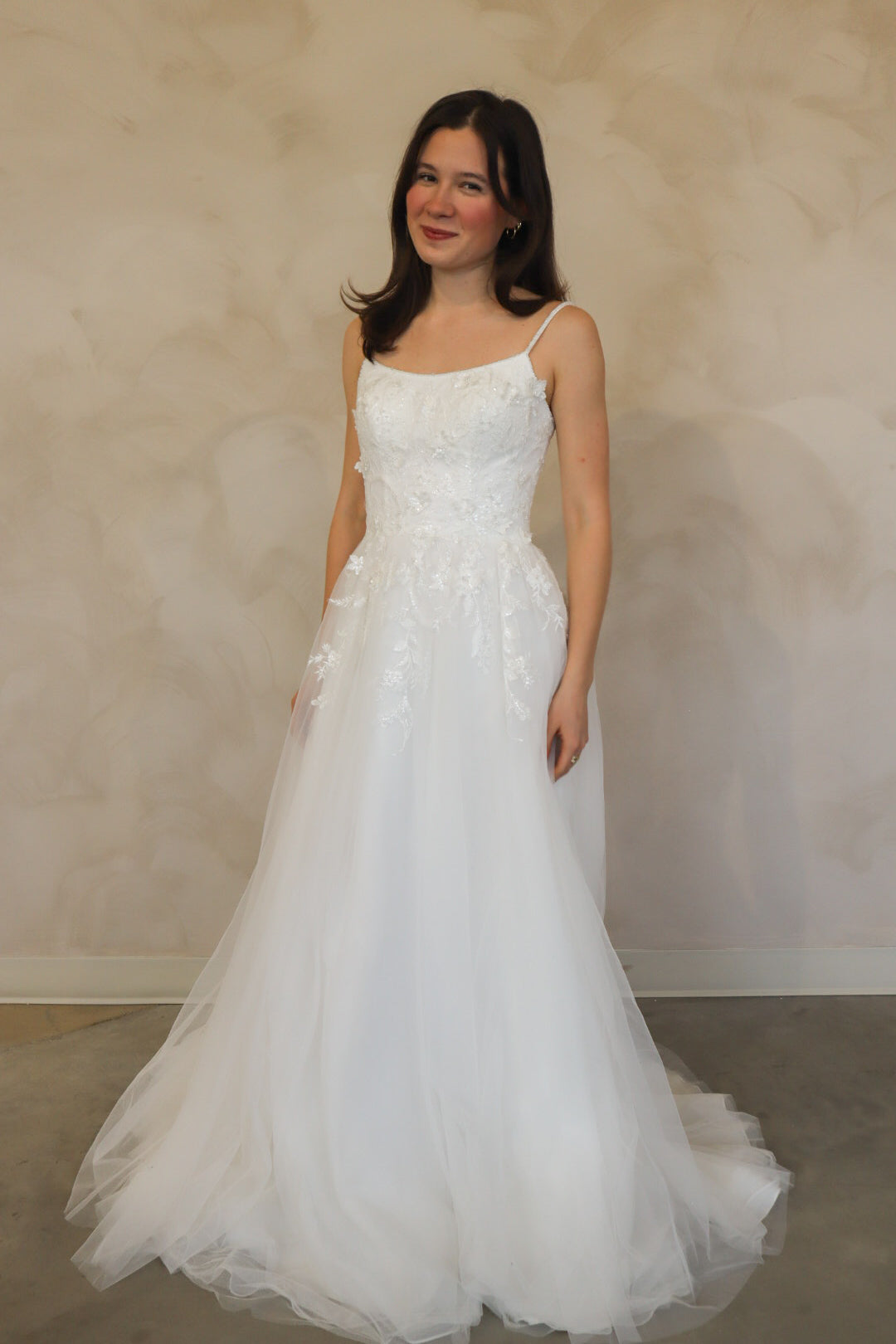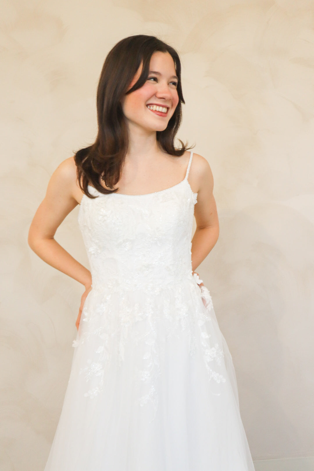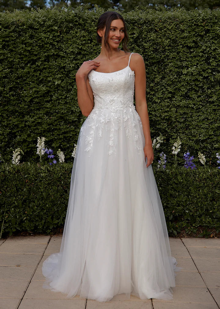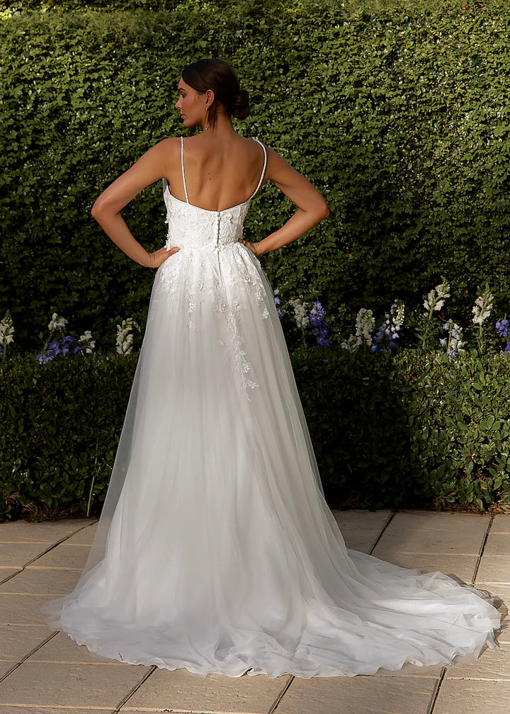 The Margarida is this season's most romantic wedding dress, it boasts beaded lace applique and tulle, exuding effortless elegance. With delicate beaded straps and a scoop neckline adorned with subtle trim. The lace applique, adorned with subtle beading, adds a touch of glamour. Featuring built-in bra cups, boning, and soft fusing for comfort and support, it ensures a flawless fit. Complete with an invisible zip and button closure.