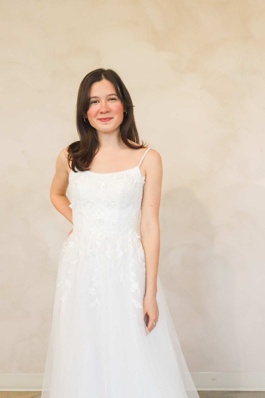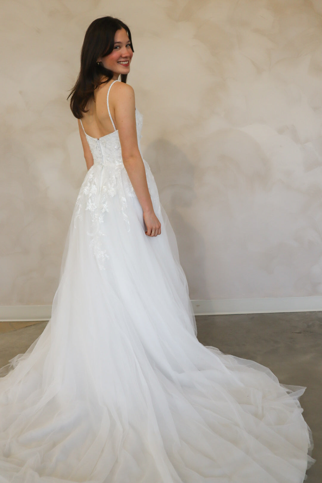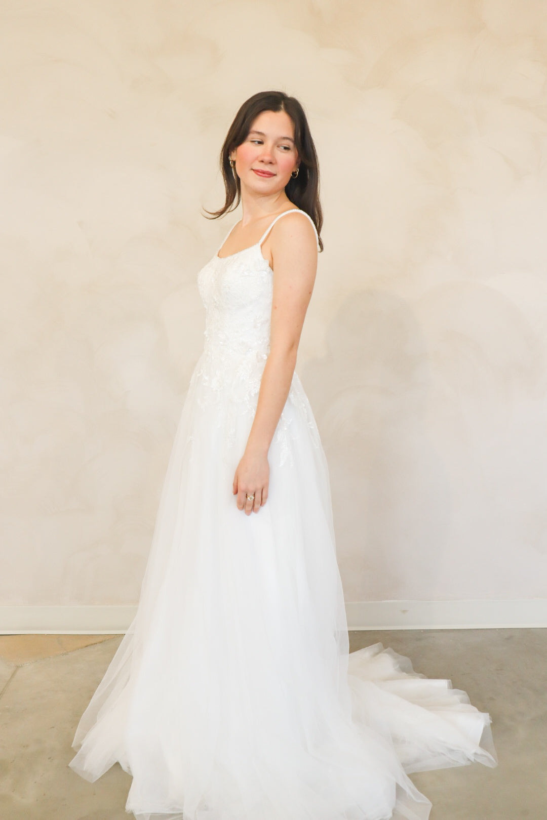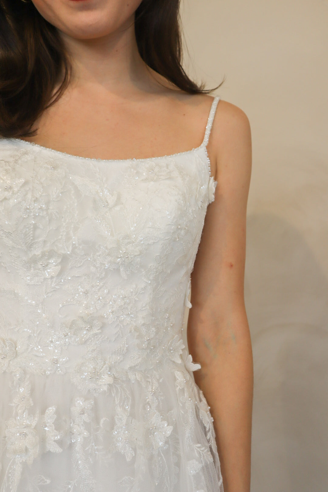 The Margarida is this season's most romantic wedding dress, it boasts beaded lace applique and tulle, exuding effortless elegance. With delicate beaded straps and a scoop neckline adorned with subtle trim. The lace applique, adorned with subtle beading, adds a touch of glamour. Featuring built-in bra cups, boning, and soft fusing for comfort and support, it ensures a flawless fit. Complete with an invisible zip and button closure.