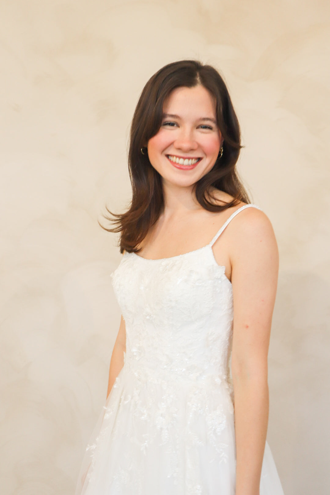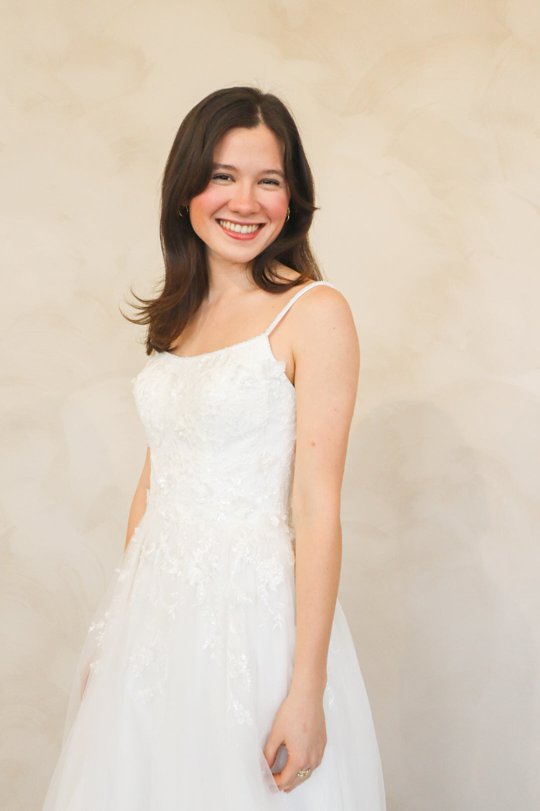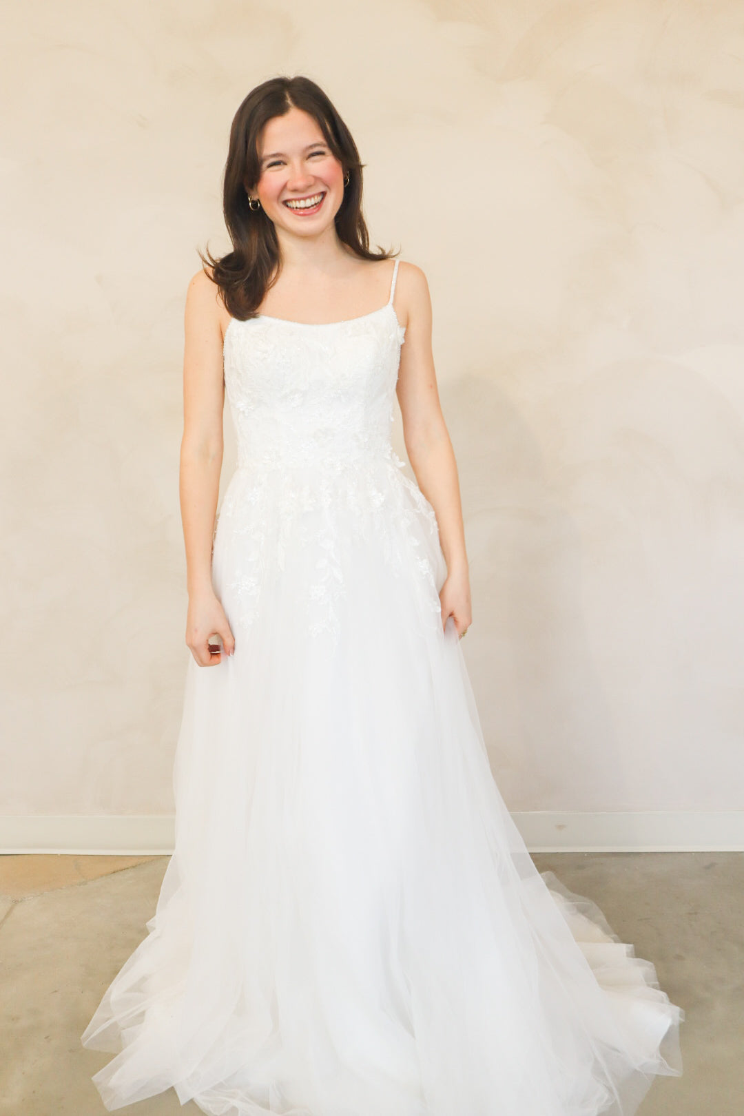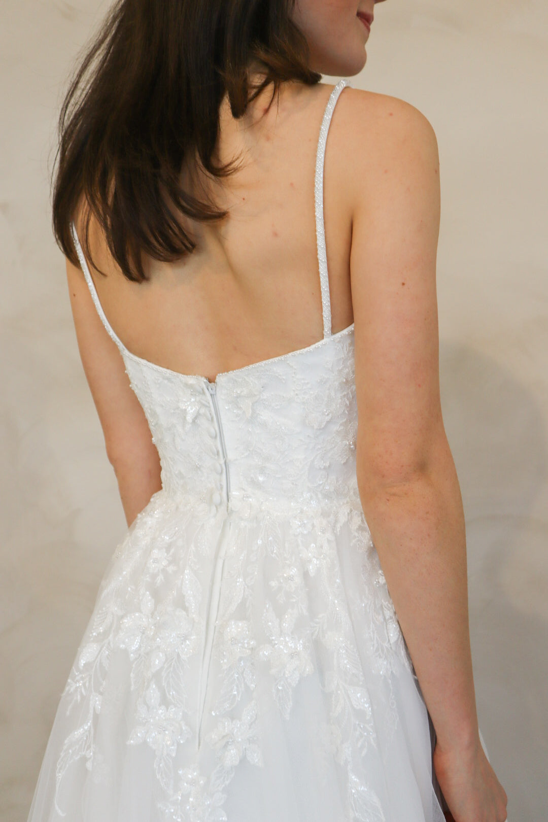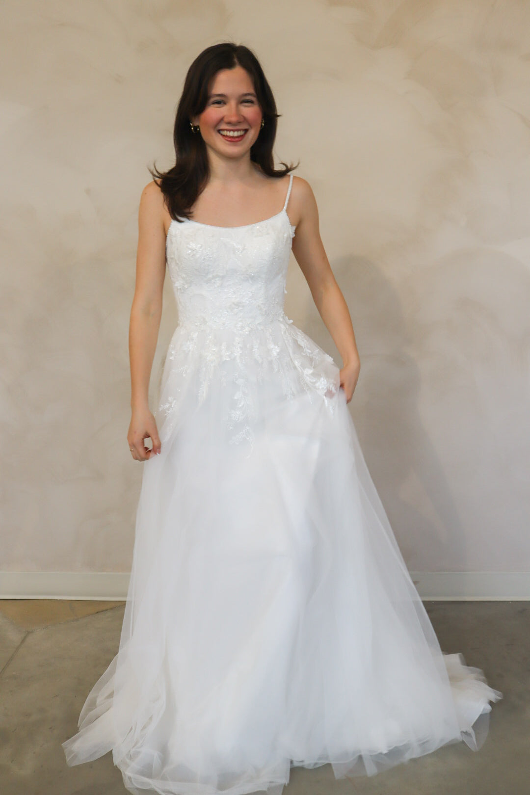 The Margarida is this season's most romantic wedding dress, it boasts beaded lace applique and tulle, exuding effortless elegance. With delicate beaded straps and a scoop neckline adorned with subtle trim. The lace applique, adorned with subtle beading, adds a touch of glamour. Featuring built-in bra cups, boning, and soft fusing for comfort and support, it ensures a flawless fit. Complete with an invisible zip and button closure.