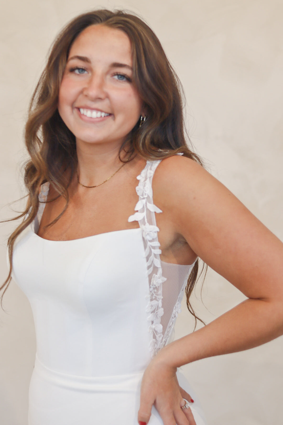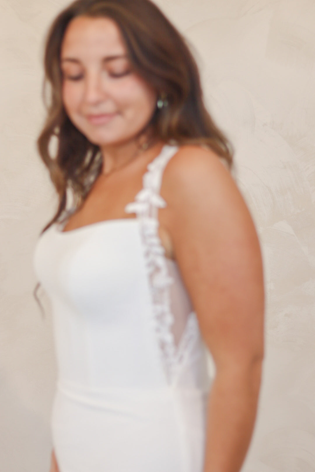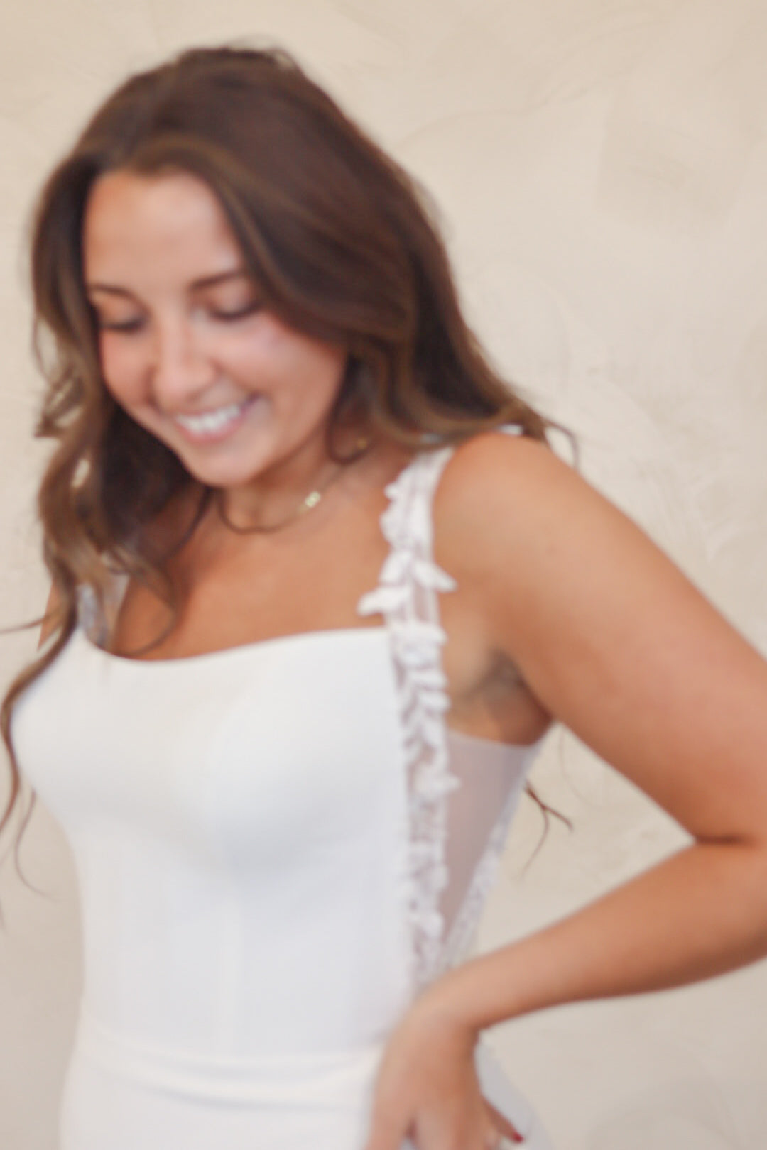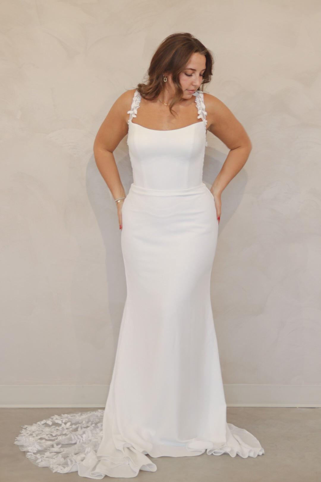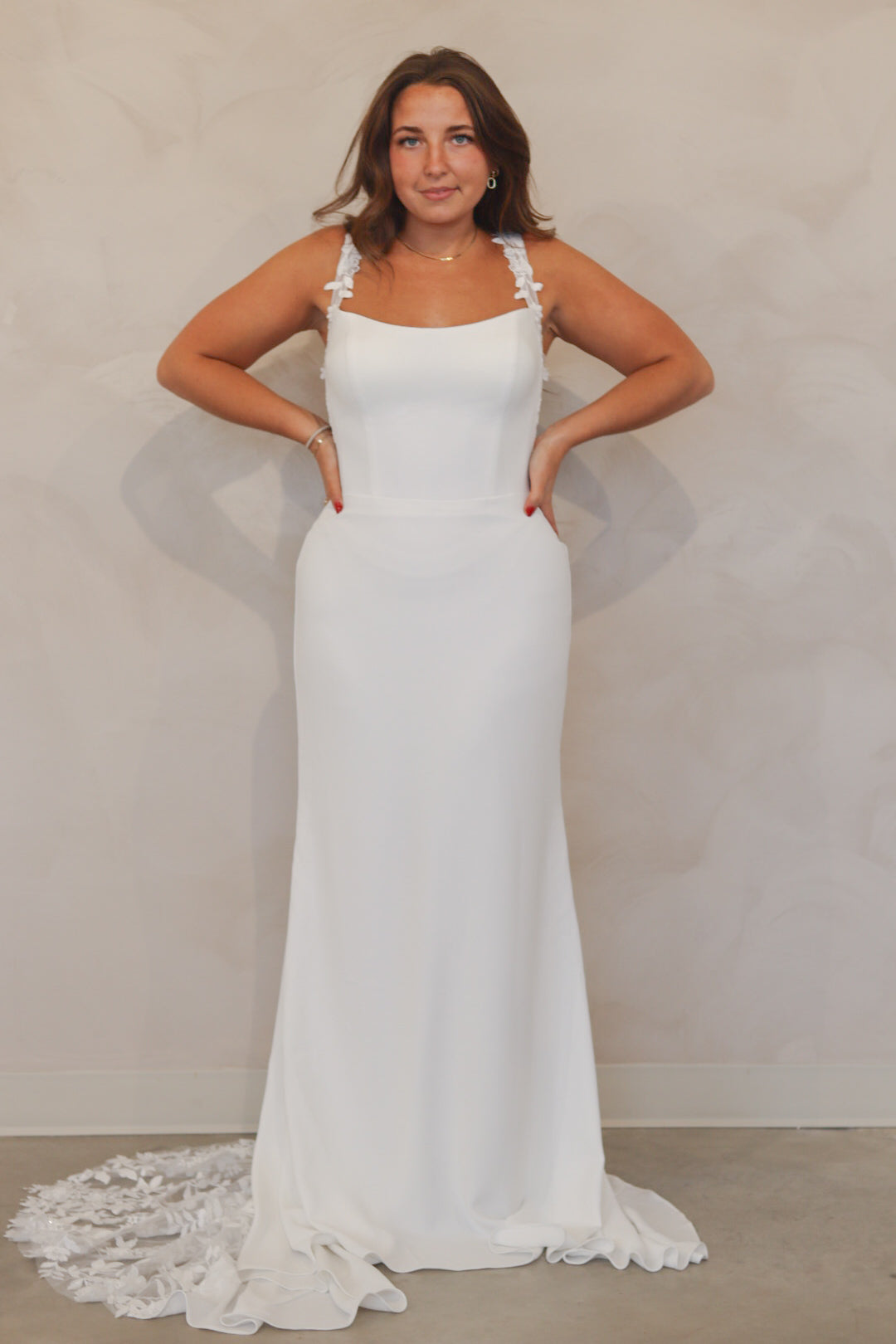Introducing "Miller"- This square neckline, fitted gown is perfect for the iconic bride. The detailed straps, and cutout train make this dress more than just a traditional gown. The silhouette is classic and clean, yet the details make it like none other. Try on Miller for a clean square neckline with a modern twist.