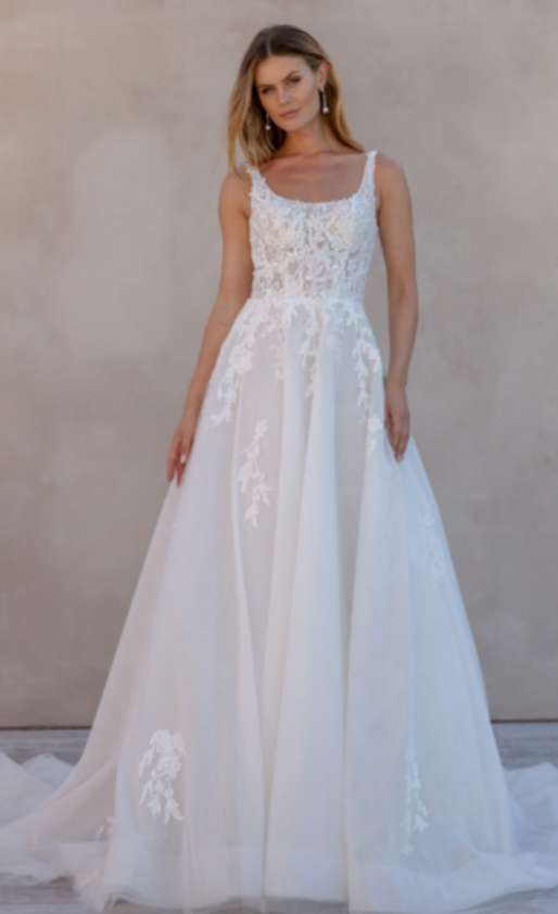 Introducing "Nina" - This sleeveless A-line wedding dress features a delicate lace bodice with a flattering scoop neckline and wide straps for soft support. The structured top flows into a full tulle skirt with scattered lace appliqués, creating a light and romantic silhouette. A subtle illusion panel at the waist adds dimension without compromising coverage. Ideal for garden weddings, chapel ceremonies, or any bride seeking a classic lace wedding dress with modern details and airy movement.