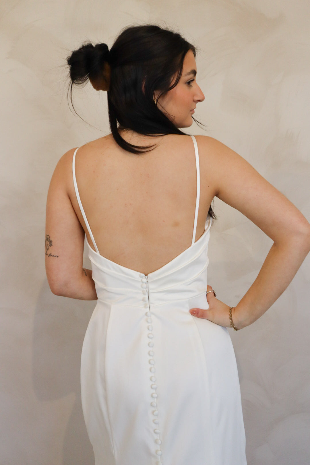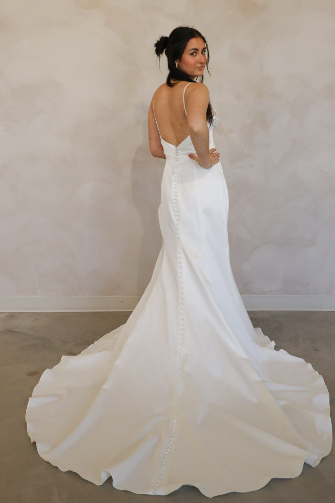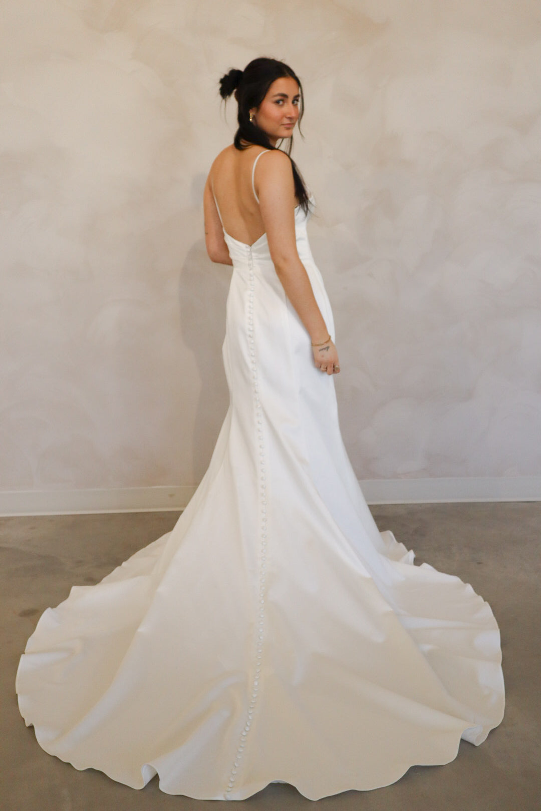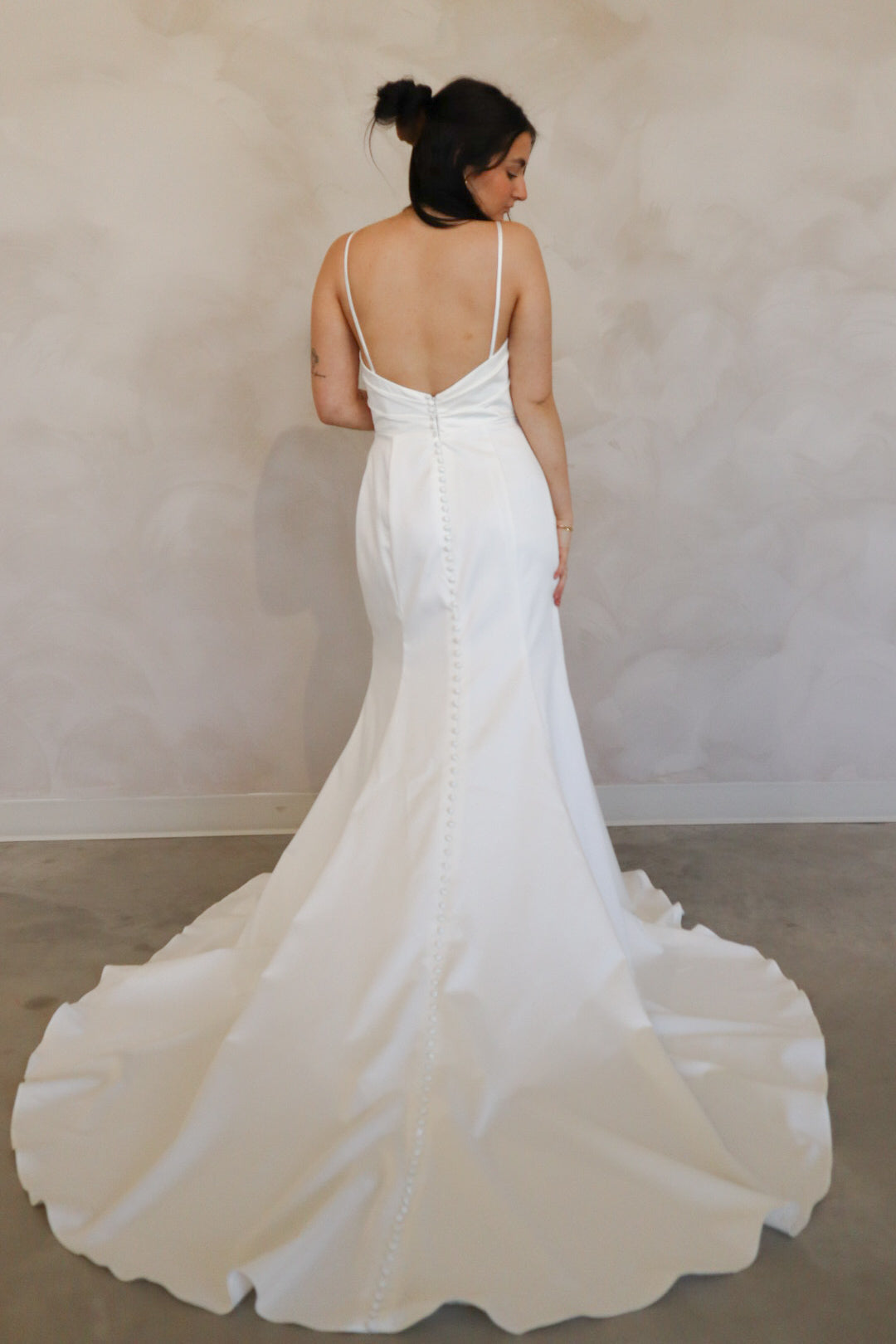 Introducing "Oura" the perfect balance of sleek sophistication and modern allure. Crafted from luxurious satin, this fitted silhouette hugs the body beautifully, enhanced by a flattering ruched bodice and delicate spaghetti straps. A daring slit adds a touch of drama, while a row of elegant buttons cascades down the back, leading to a graceful sweep train. Chic, confident, and effortlessly elegant, Oura is designed for the bride who wants to make a statement.