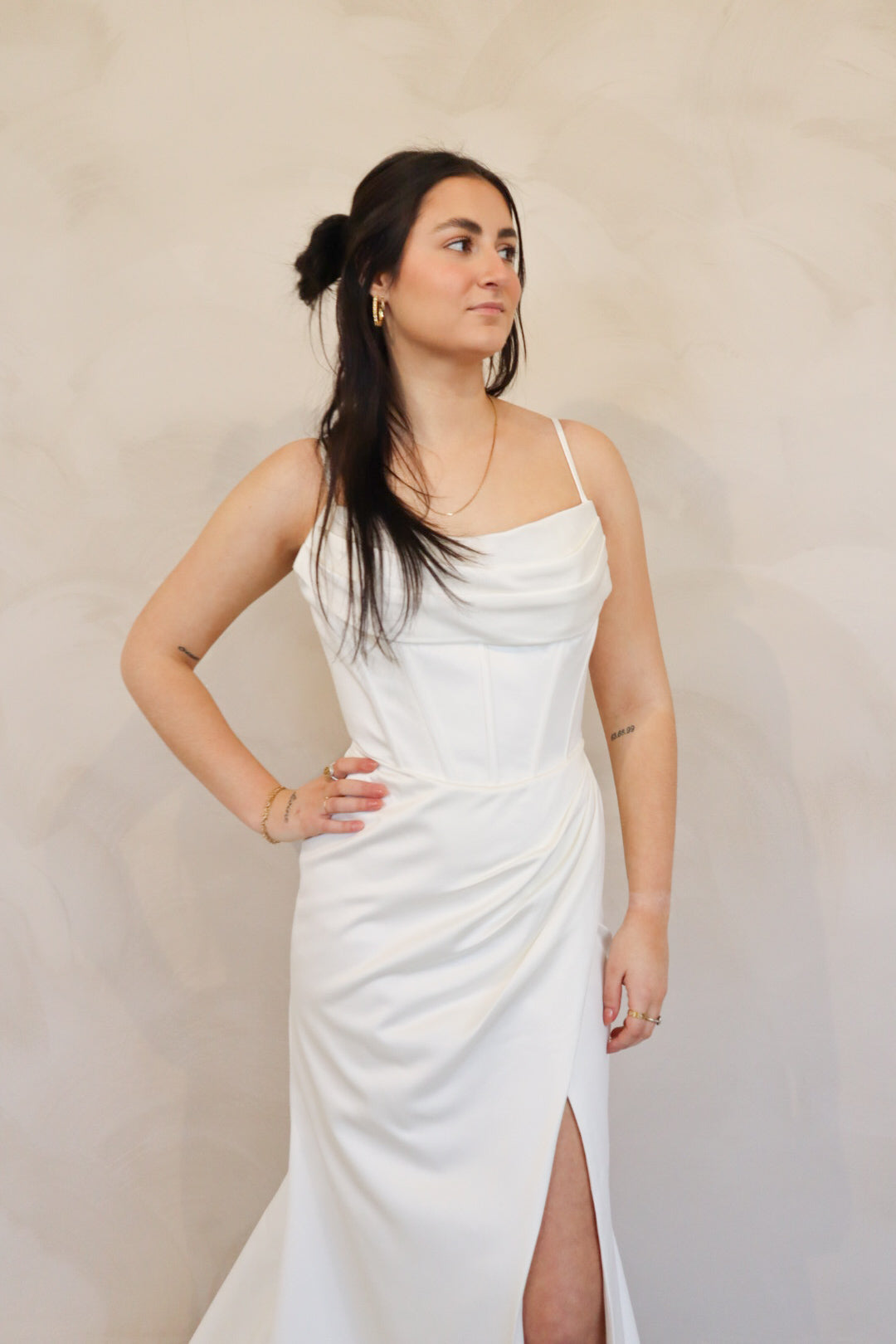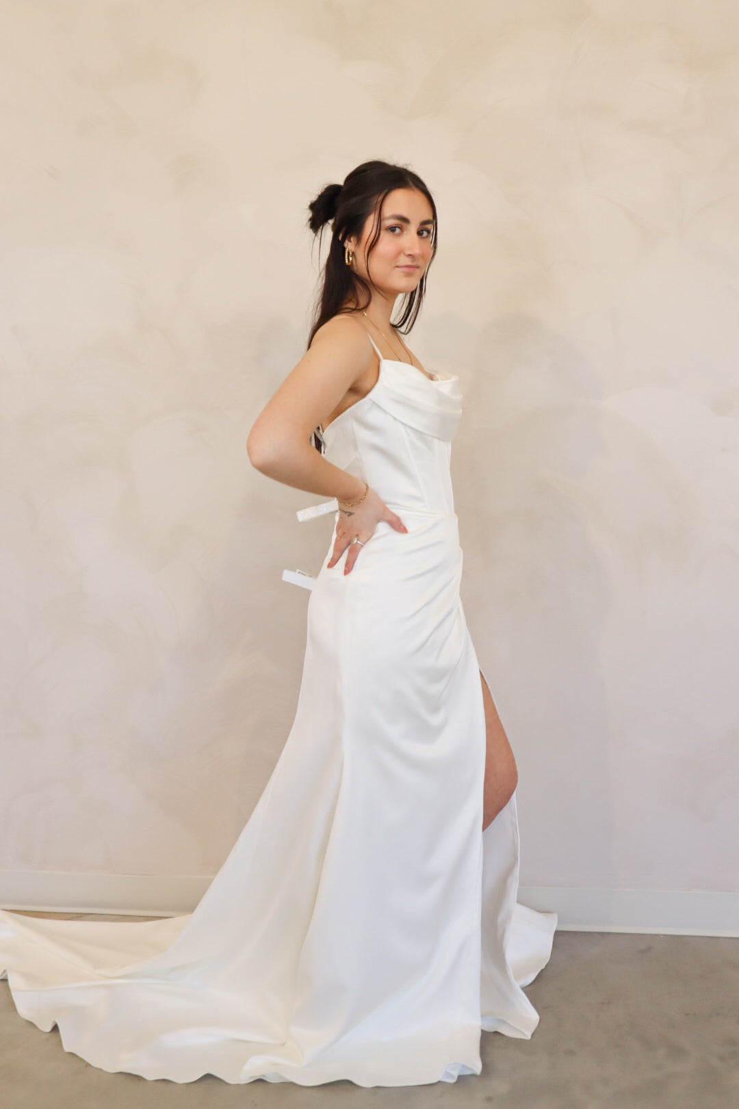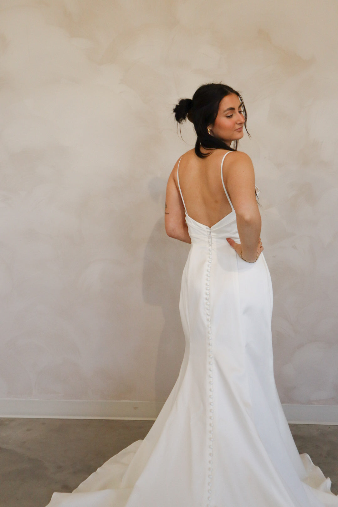Introducing "Oura" the perfect balance of sleek sophistication and modern allure. Crafted from luxurious satin, this fitted silhouette hugs the body beautifully, enhanced by a flattering ruched bodice and delicate spaghetti straps. A daring slit adds a touch of drama, while a row of elegant buttons cascades down the back, leading to a graceful sweep train. Chic, confident, and effortlessly elegant, Oura is designed for the bride who wants to make a statement.