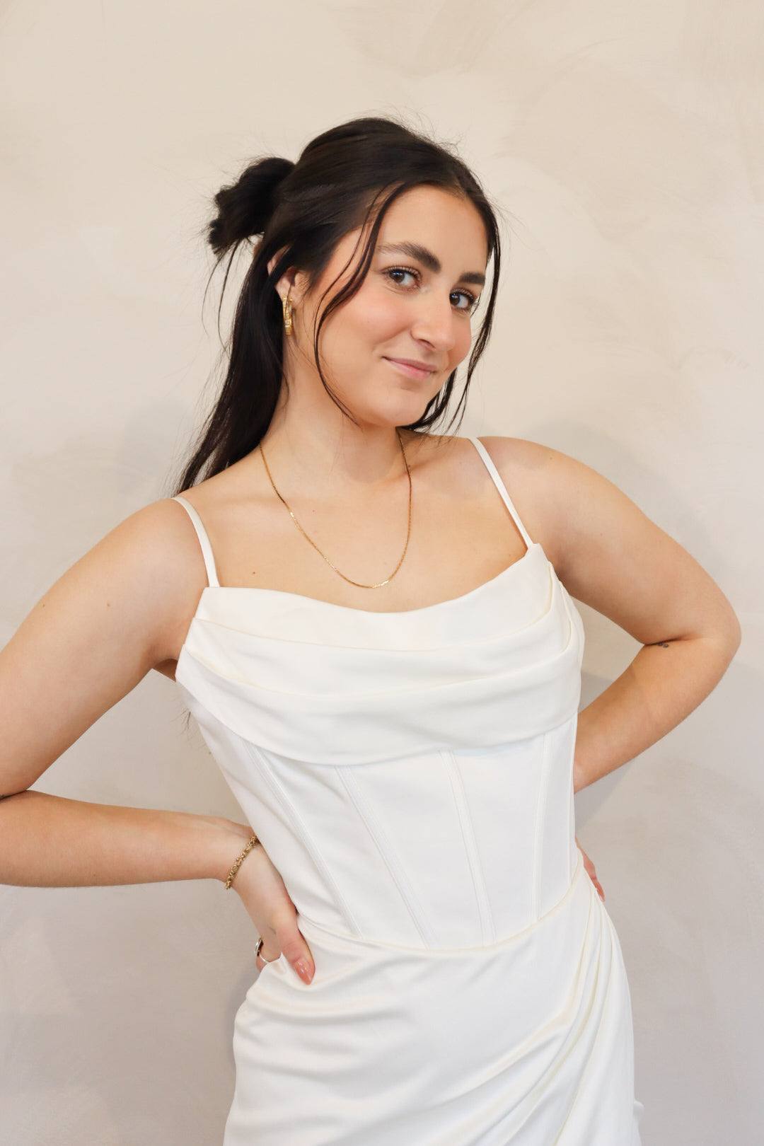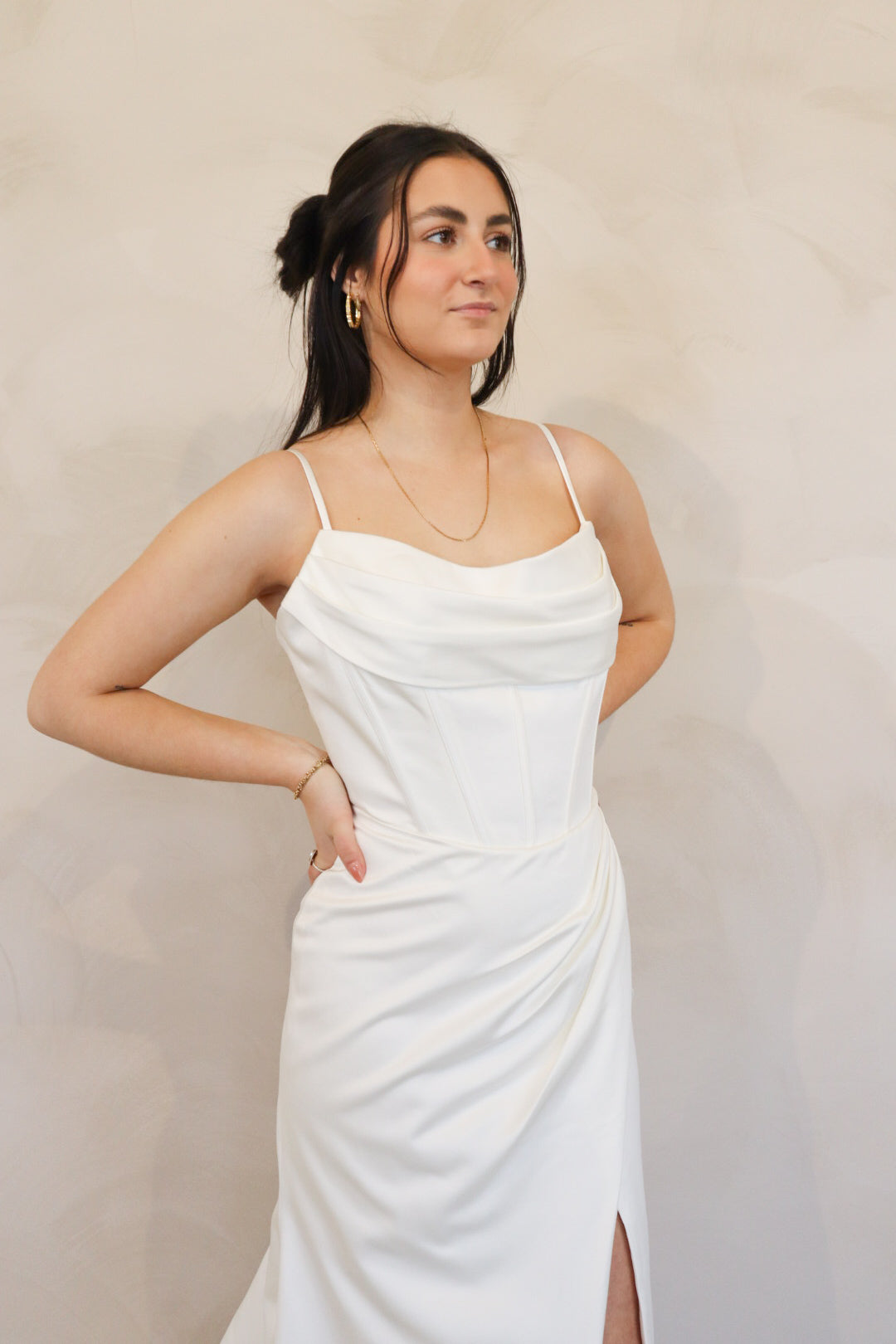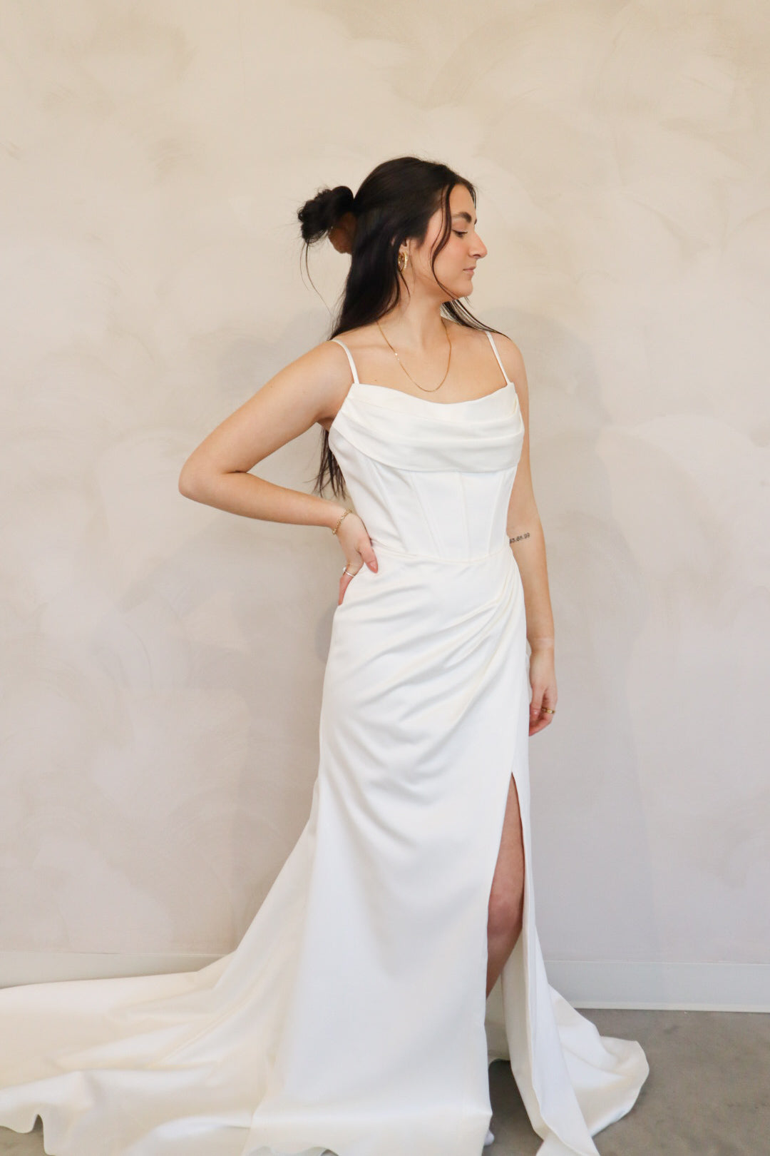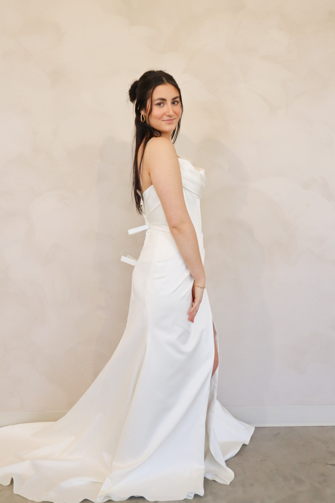 Introducing "Oura" the perfect balance of sleek sophistication and modern allure. Crafted from luxurious satin, this fitted silhouette hugs the body beautifully, enhanced by a flattering ruched bodice and delicate spaghetti straps. A daring slit adds a touch of drama, while a row of elegant buttons cascades down the back, leading to a graceful sweep train. Chic, confident, and effortlessly elegant, Oura is designed for the bride who wants to make a statement.