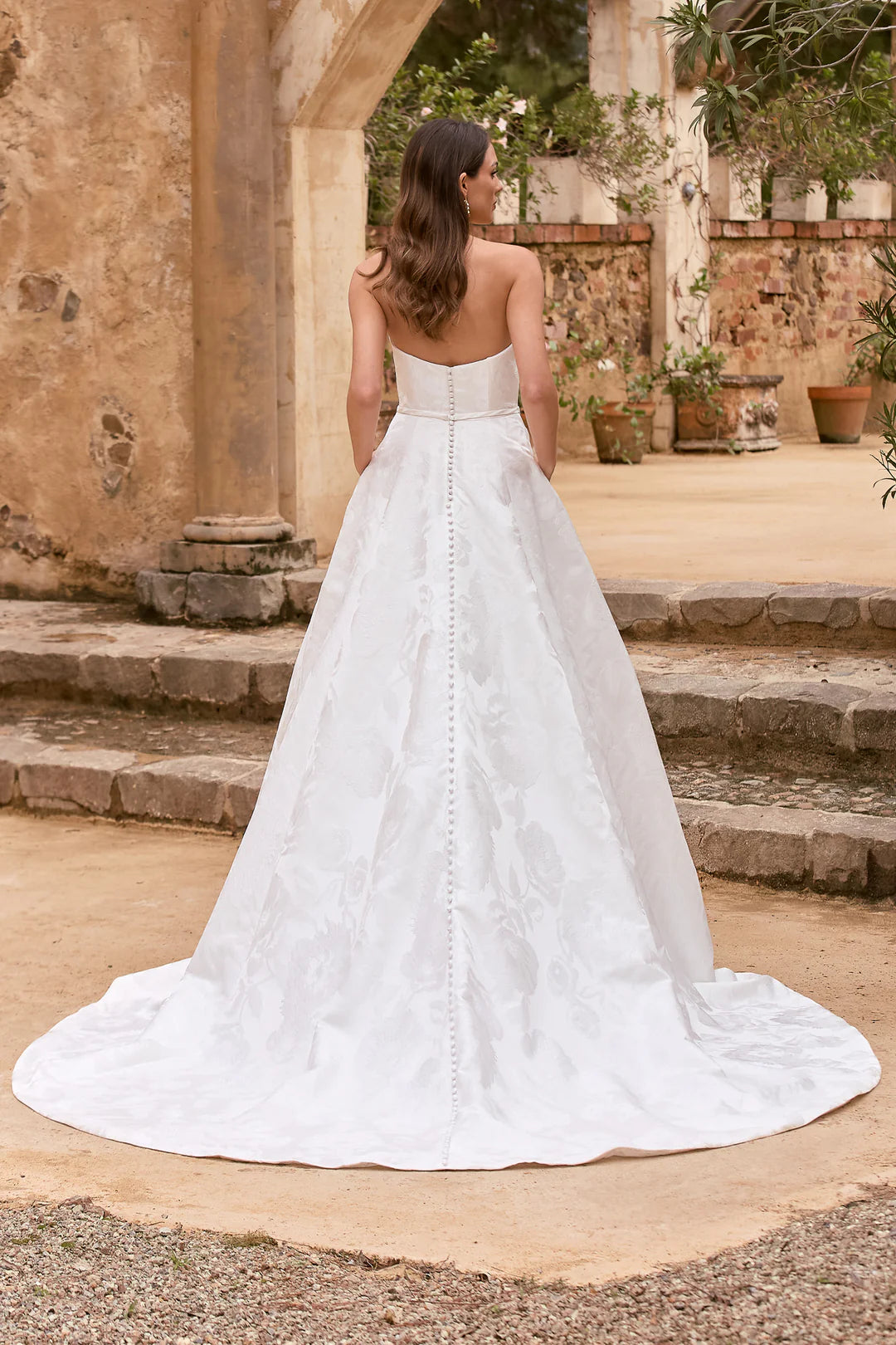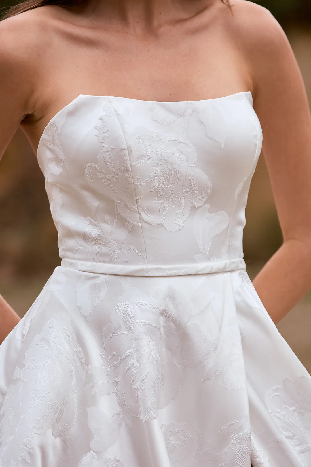 The Renee Wedding Dress is a sophisticated A-line design crafted from luxurious jacquard fabric. Featuring a strapless bodice with a slight scoop front, it offers a flattering fit that accentuates the natural waist.