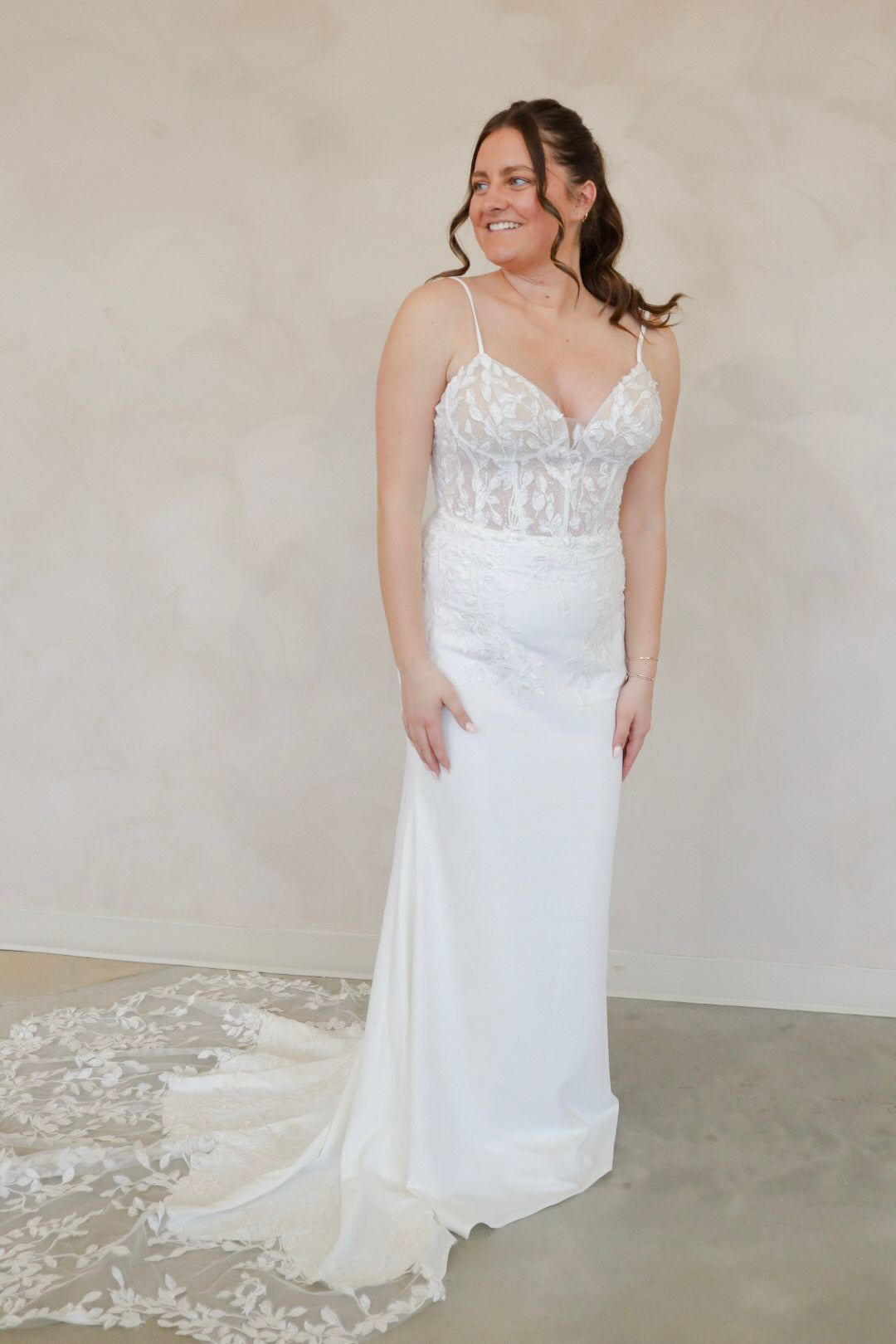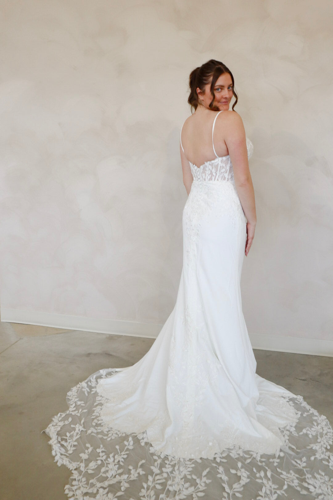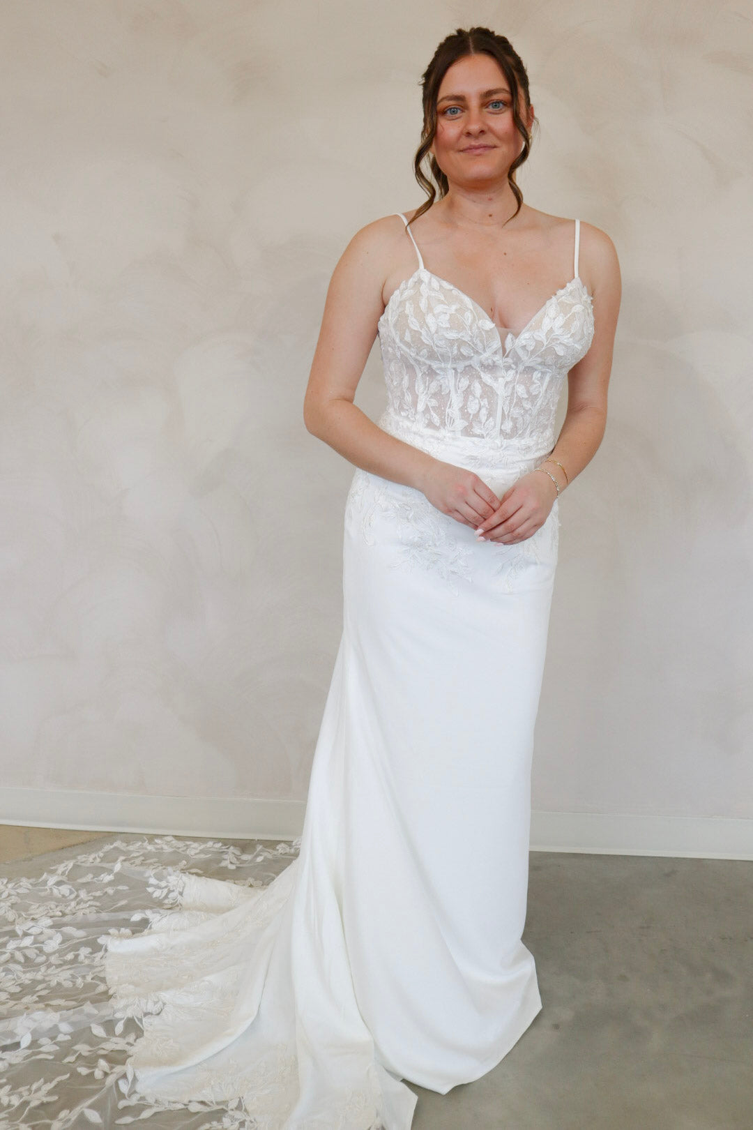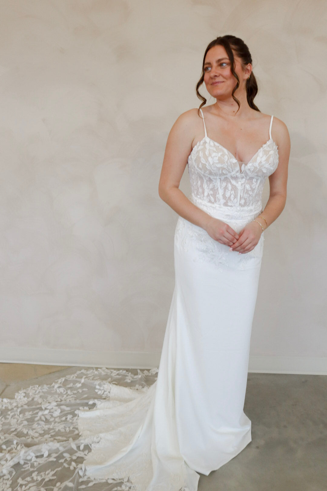 Introducing "Rosa"- a fitted wedding gown crafted from luxurious crepe. This gown features a flattering plunging V-neckline and backline on a corset bodice, adorned with delicate vine lace for a touch of timeless elegance. The gown's highlight is its leafy scalloped lace train, adding a romantic and graceful finish to Rosa's silhouette.