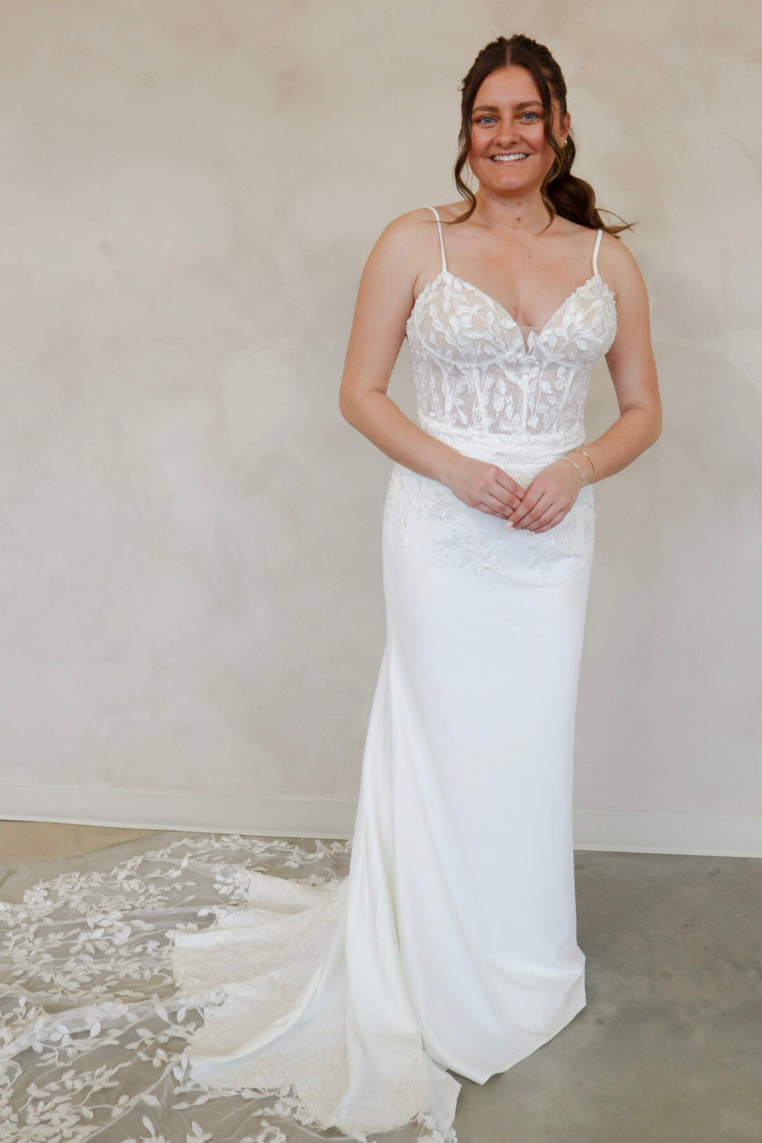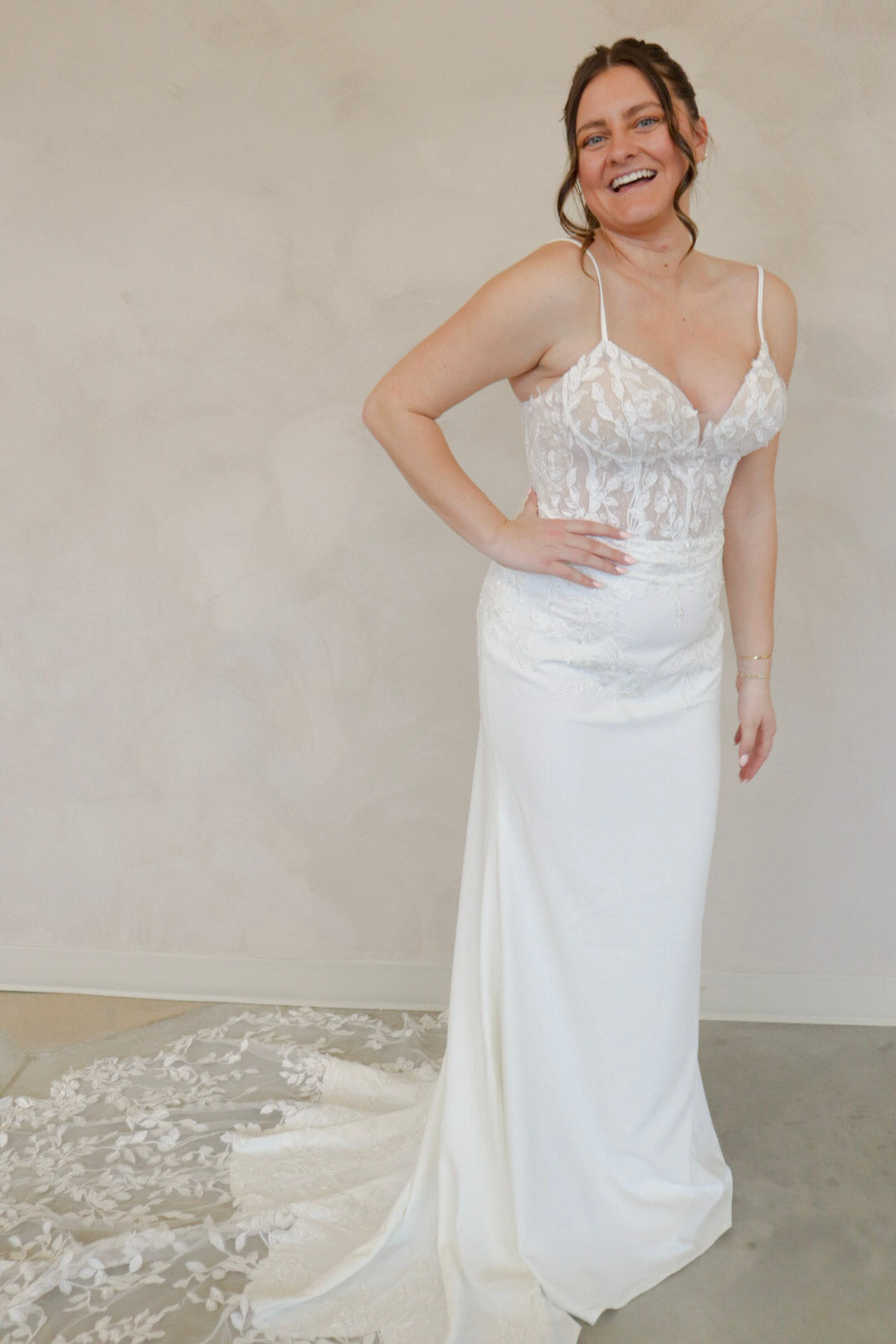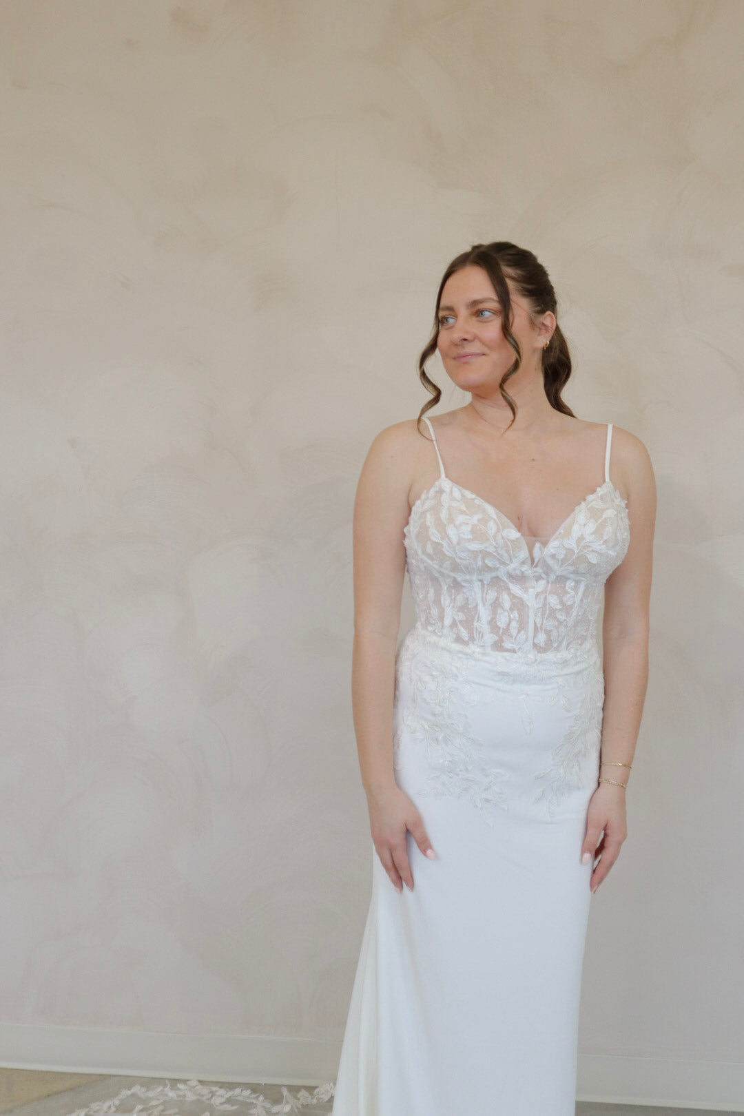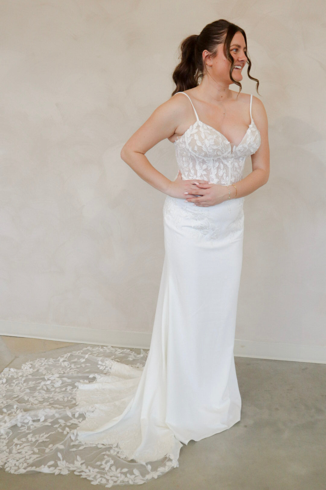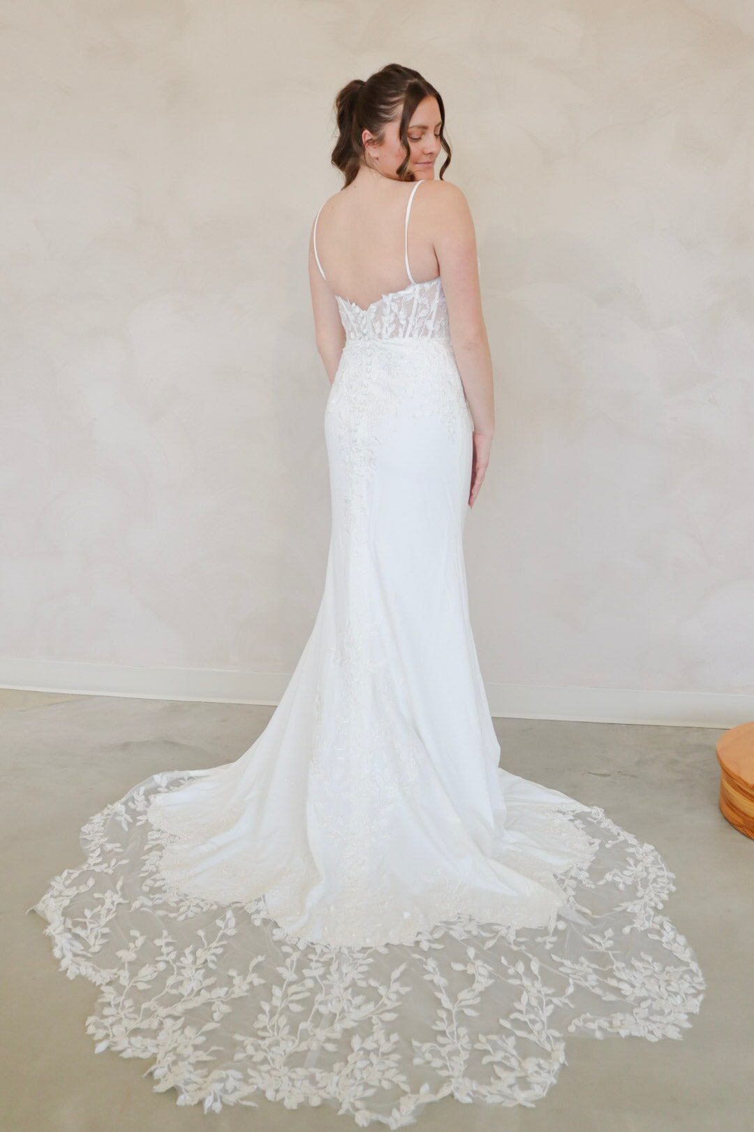 Introducing "Rosa"- a fitted wedding gown crafted from luxurious crepe. This gown features a flattering plunging V-neckline and backline on a corset bodice, adorned with delicate vine lace for a touch of timeless elegance. The gown's highlight is its leafy scalloped lace train, adding a romantic and graceful finish to Rosa's silhouette.