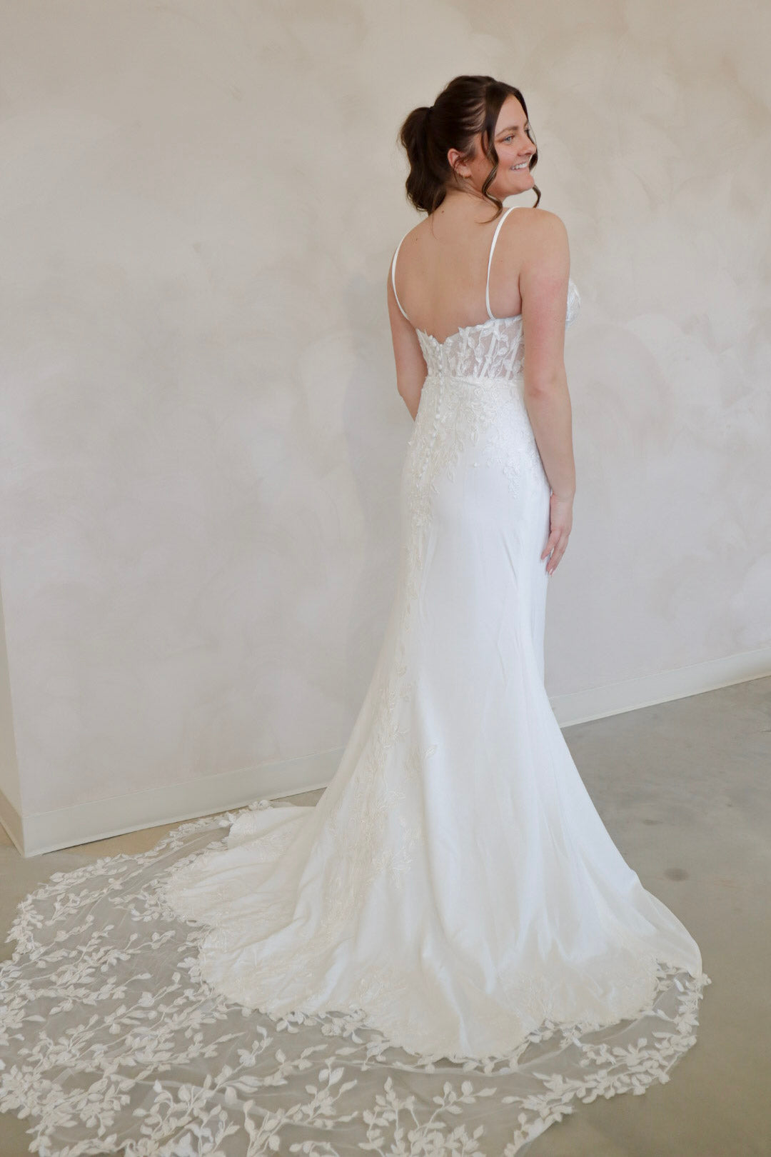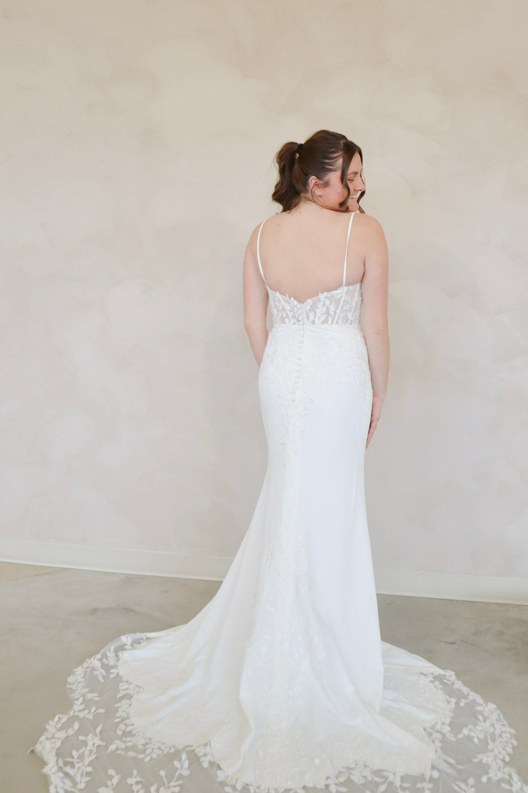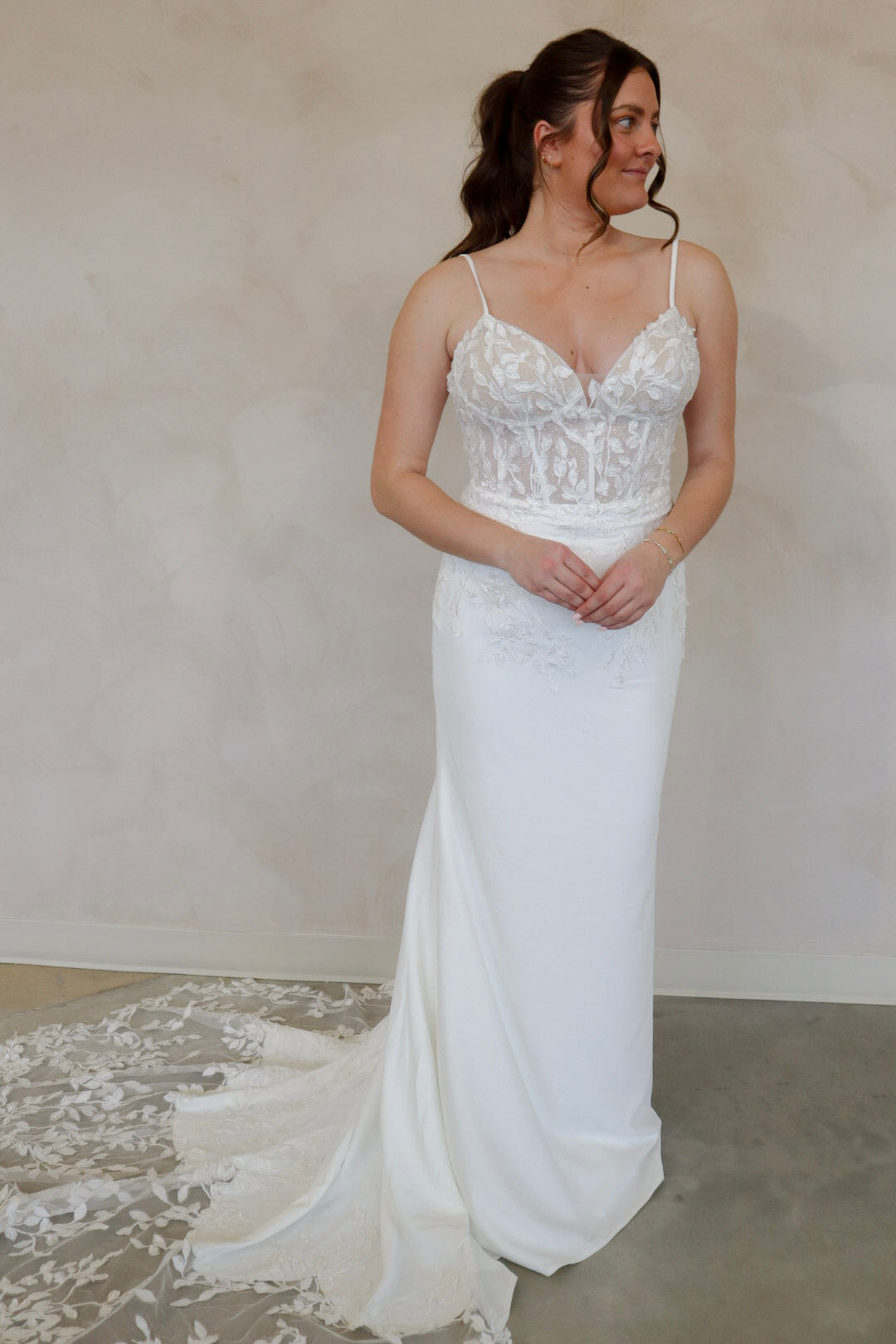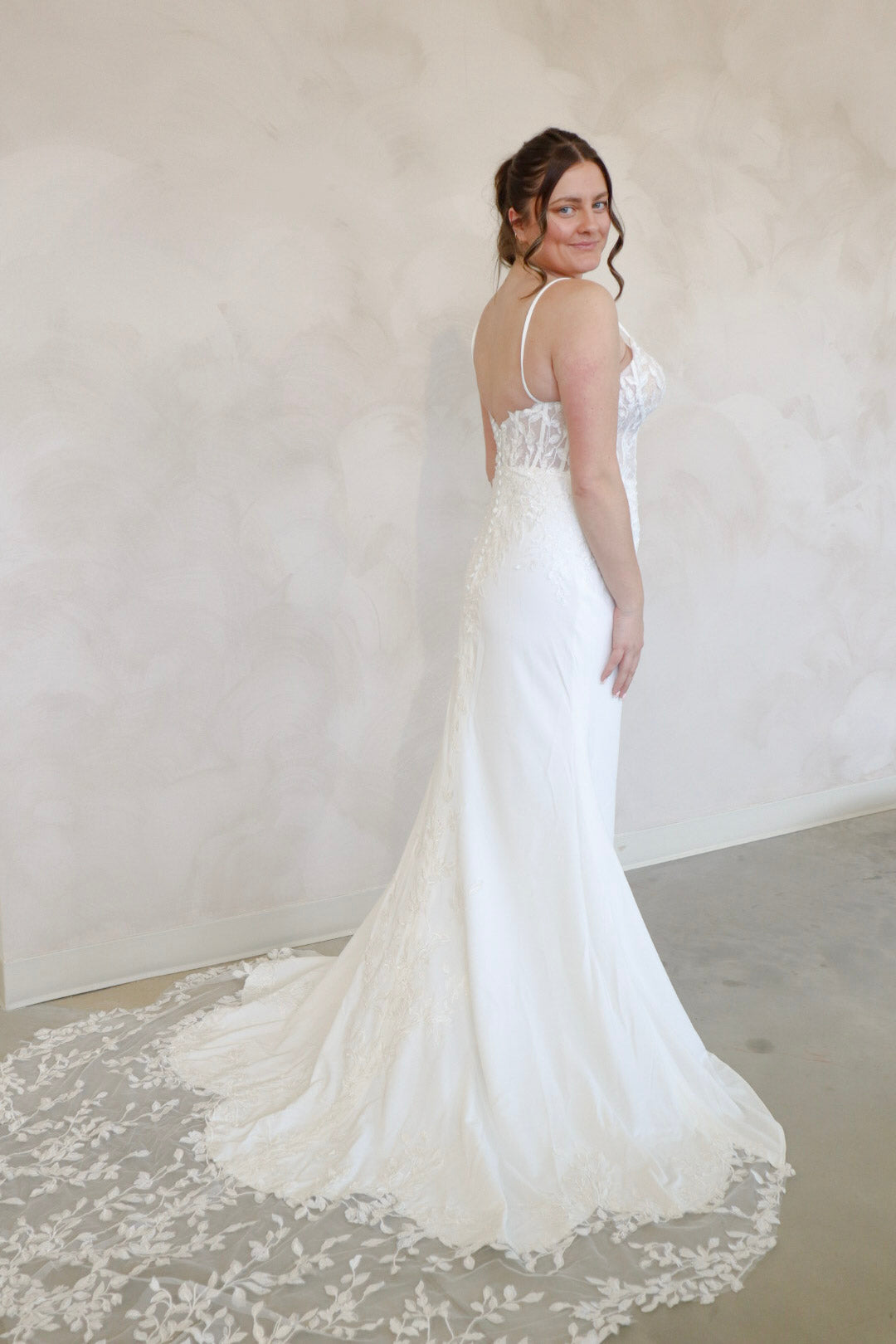 Introducing "Rosa"- a fitted wedding gown crafted from luxurious crepe. This gown features a flattering plunging V-neckline and backline on a corset bodice, adorned with delicate vine lace for a touch of timeless elegance. The gown's highlight is its leafy scalloped lace train, adding a romantic and graceful finish to Rosa's silhouette.