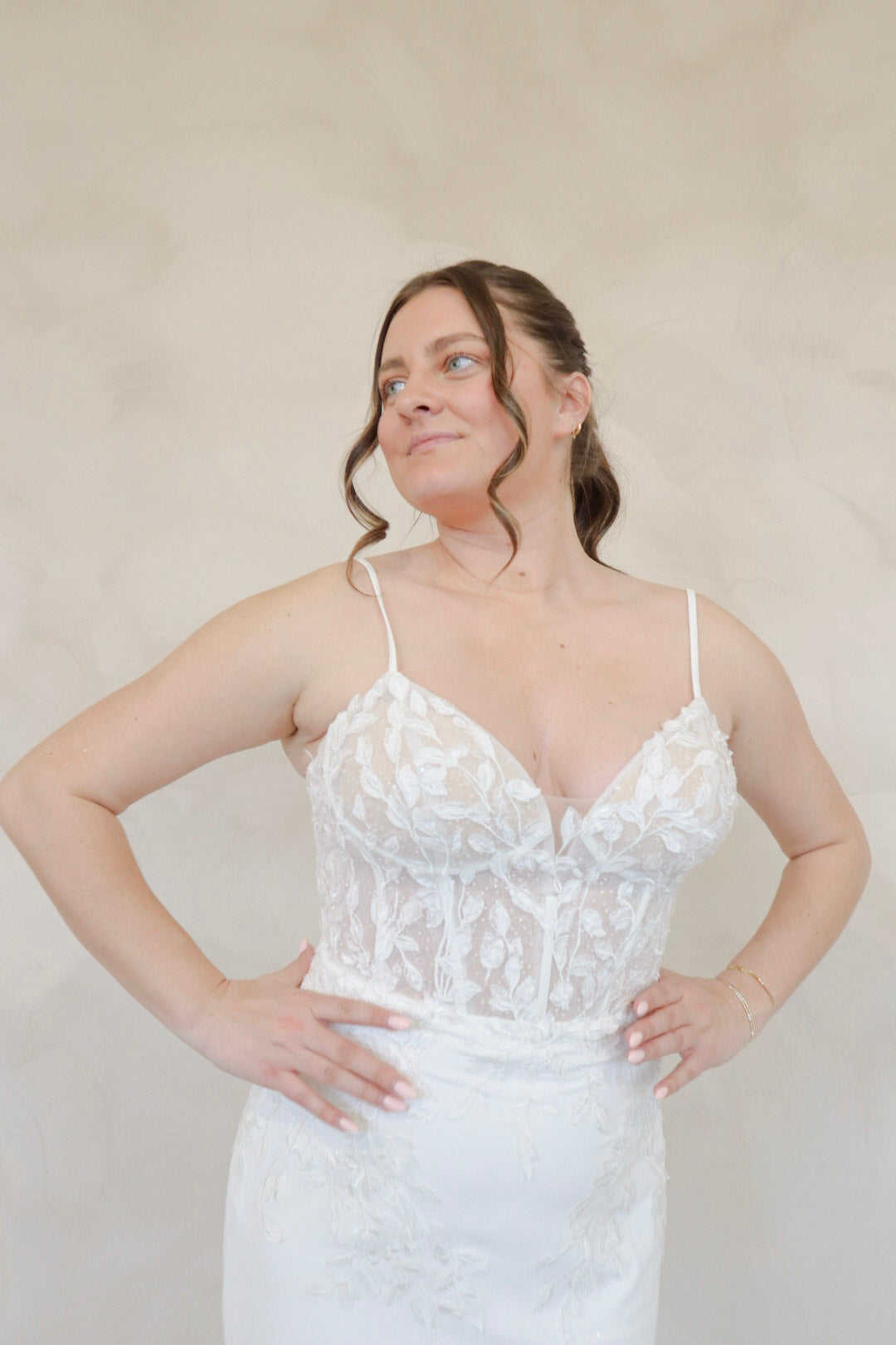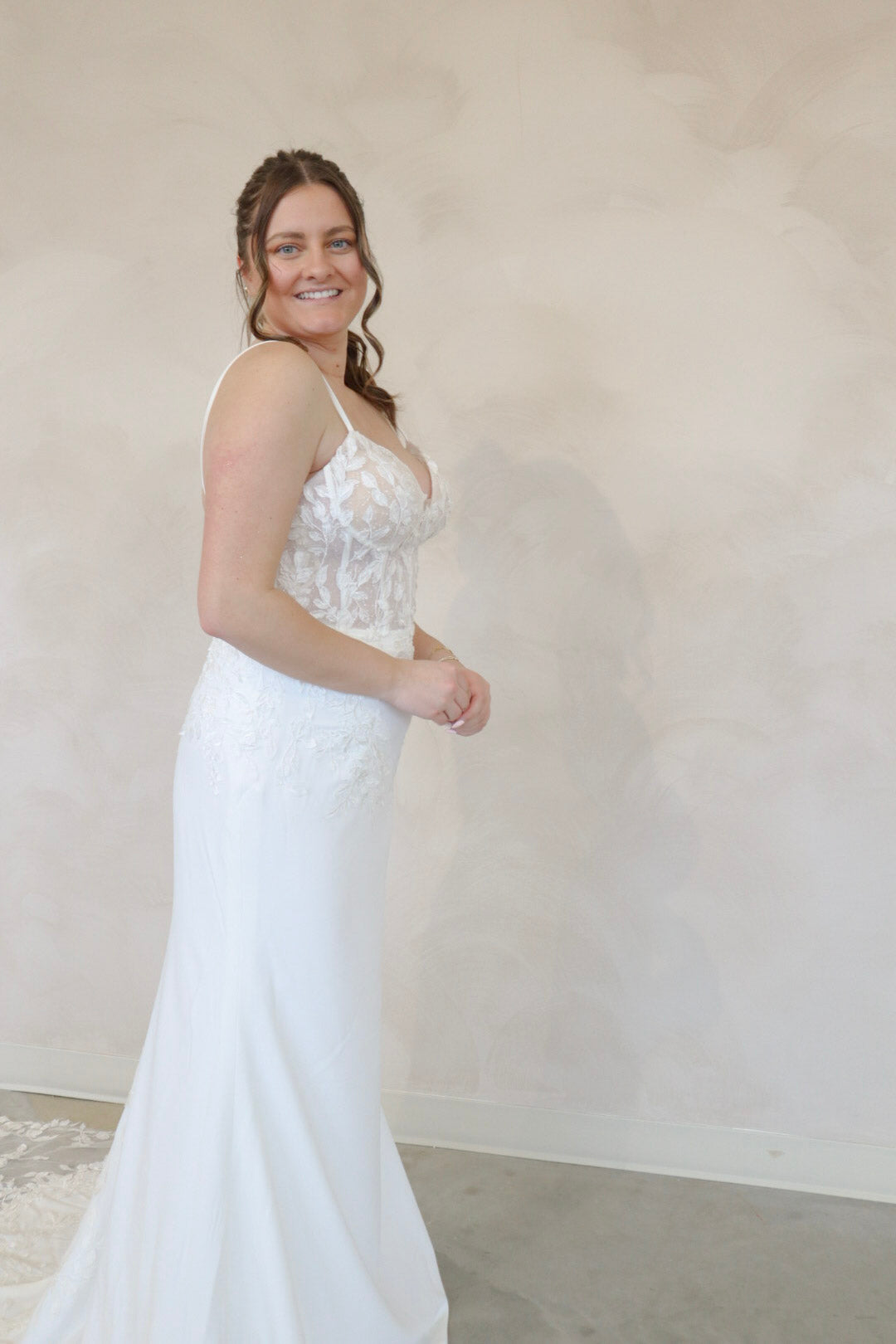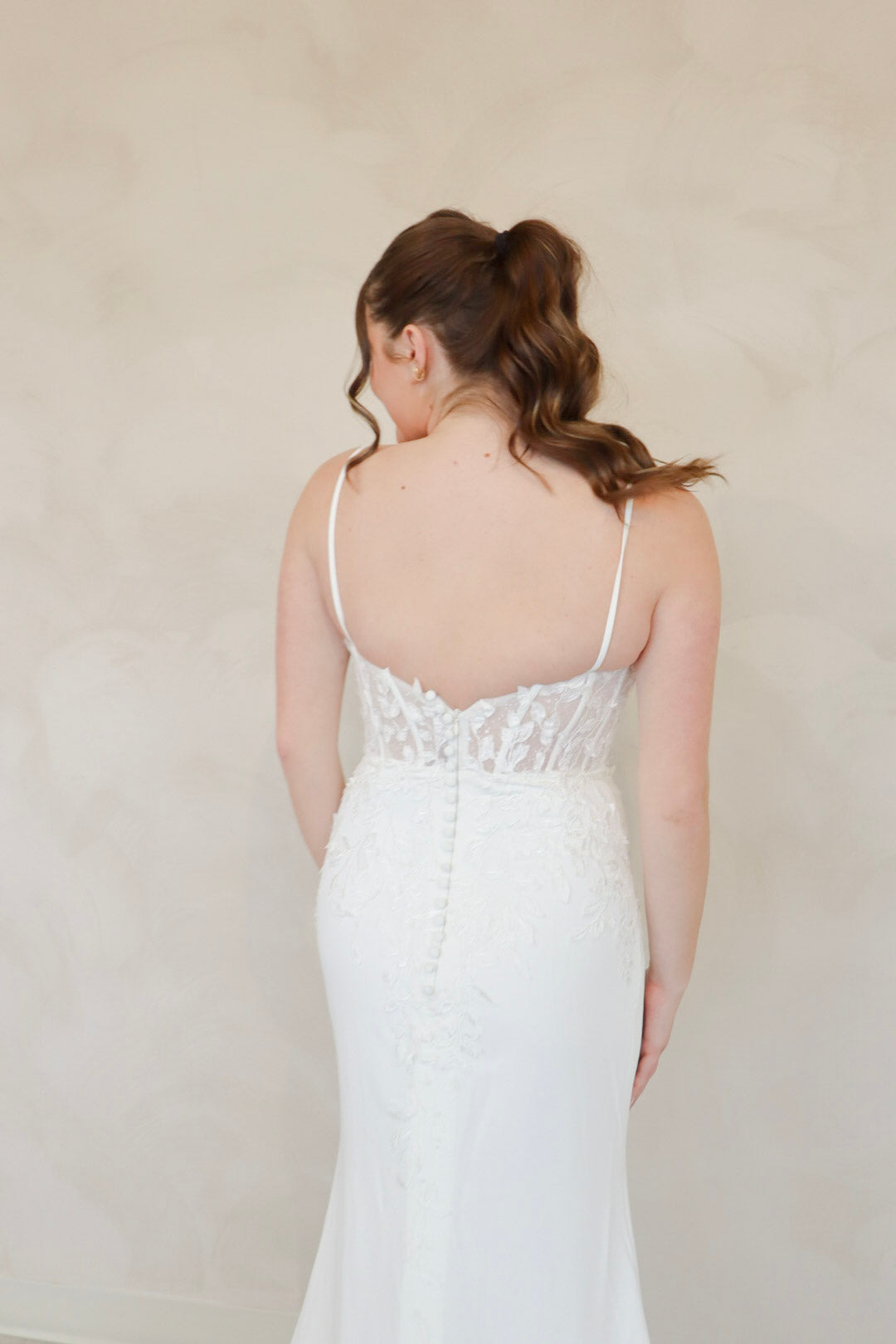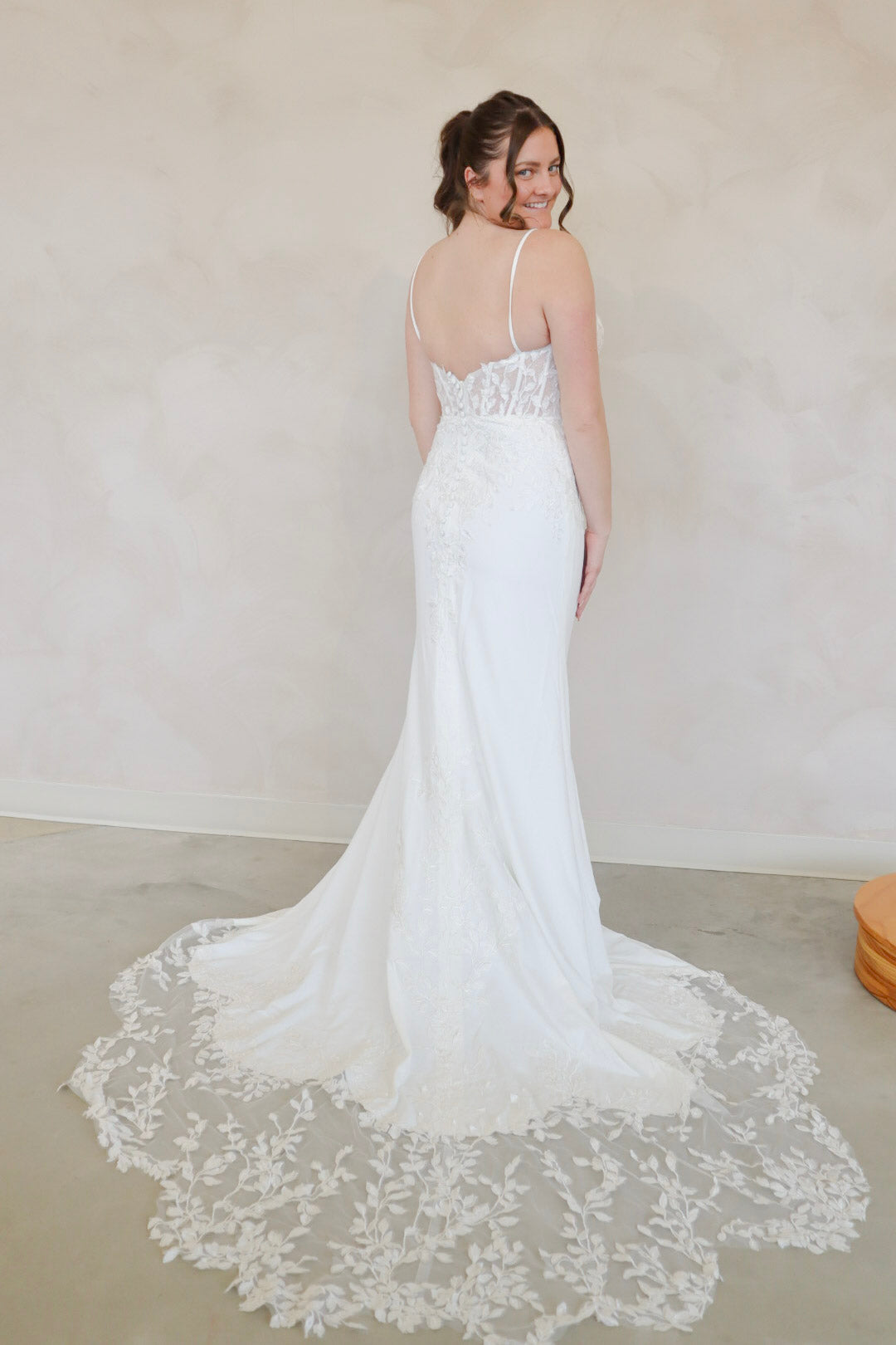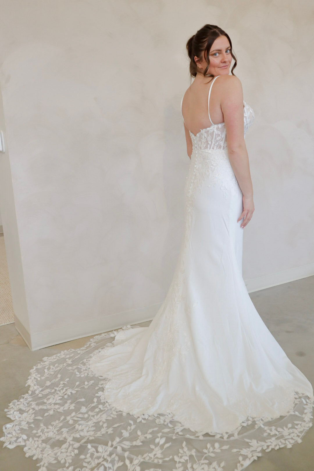 Introducing "Rosa"- a fitted wedding gown crafted from luxurious crepe. This gown features a flattering plunging V-neckline and backline on a corset bodice, adorned with delicate vine lace for a touch of timeless elegance. The gown's highlight is its leafy scalloped lace train, adding a romantic and graceful finish to Rosa's silhouette.