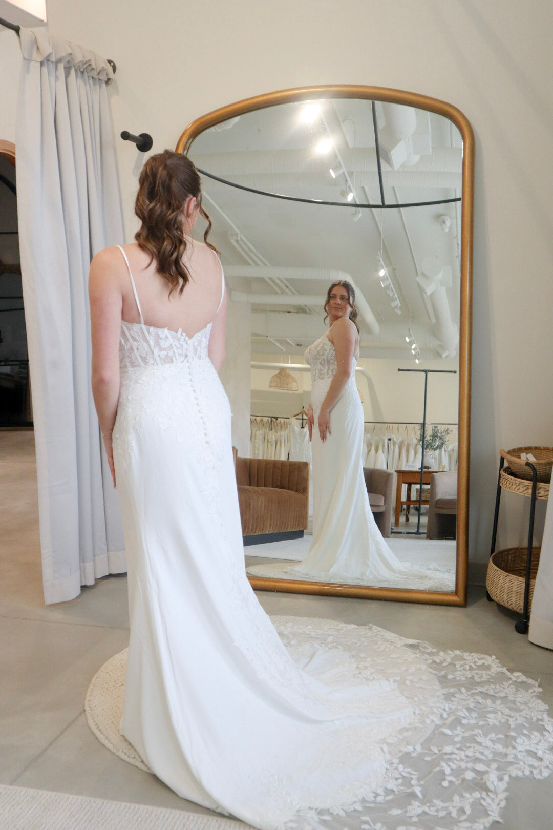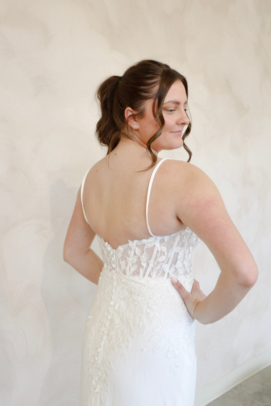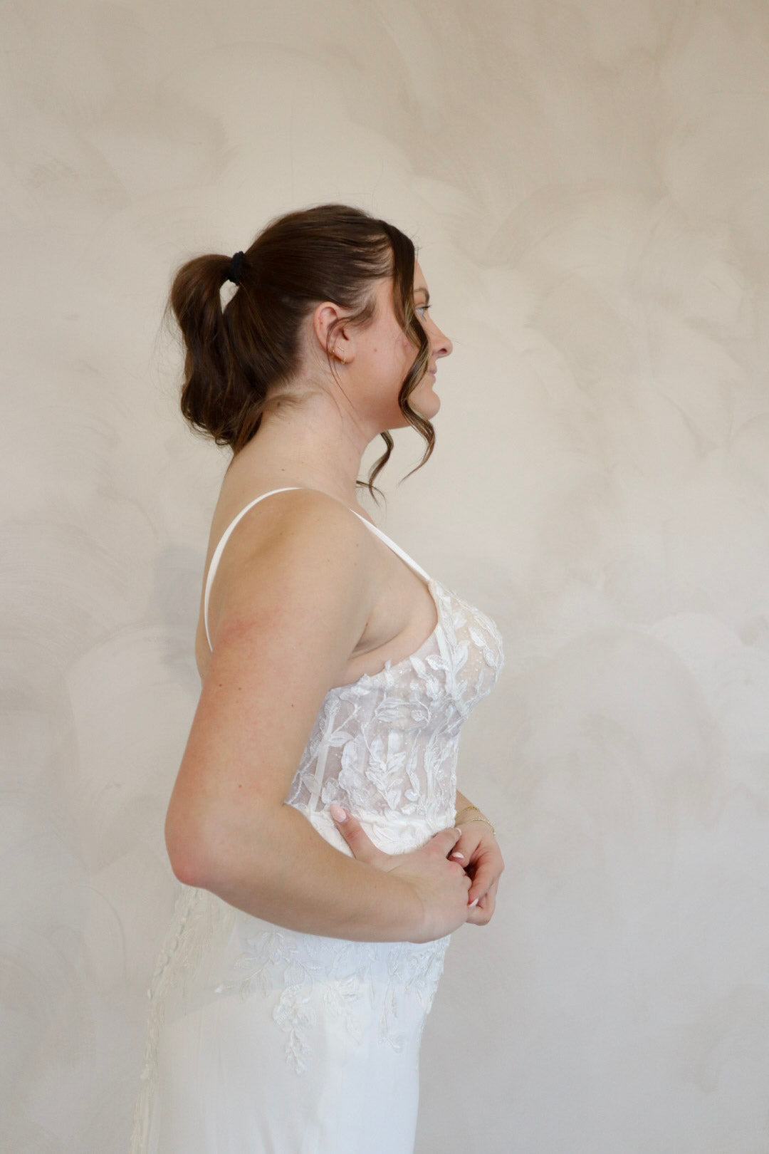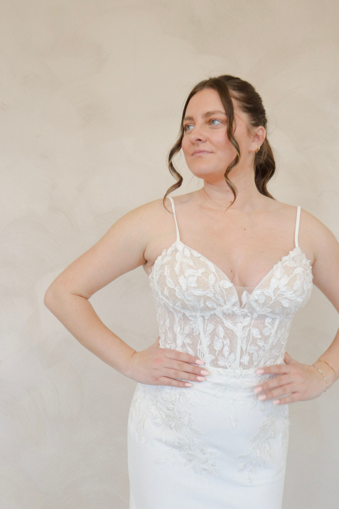 Introducing "Rosa"- a fitted wedding gown crafted from luxurious crepe. This gown features a flattering plunging V-neckline and backline on a corset bodice, adorned with delicate vine lace for a touch of timeless elegance. The gown's highlight is its leafy scalloped lace train, adding a romantic and graceful finish to Rosa's silhouette.