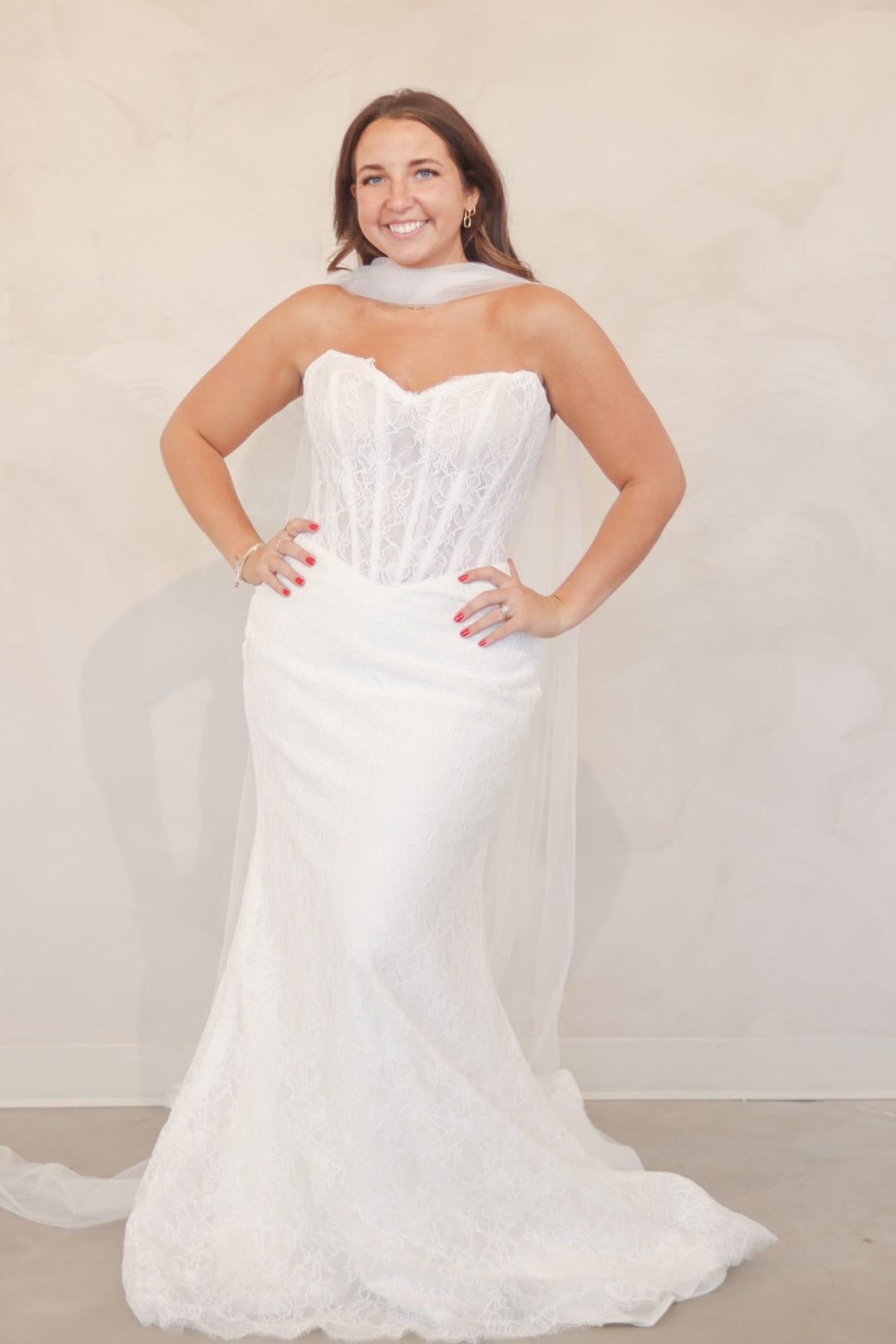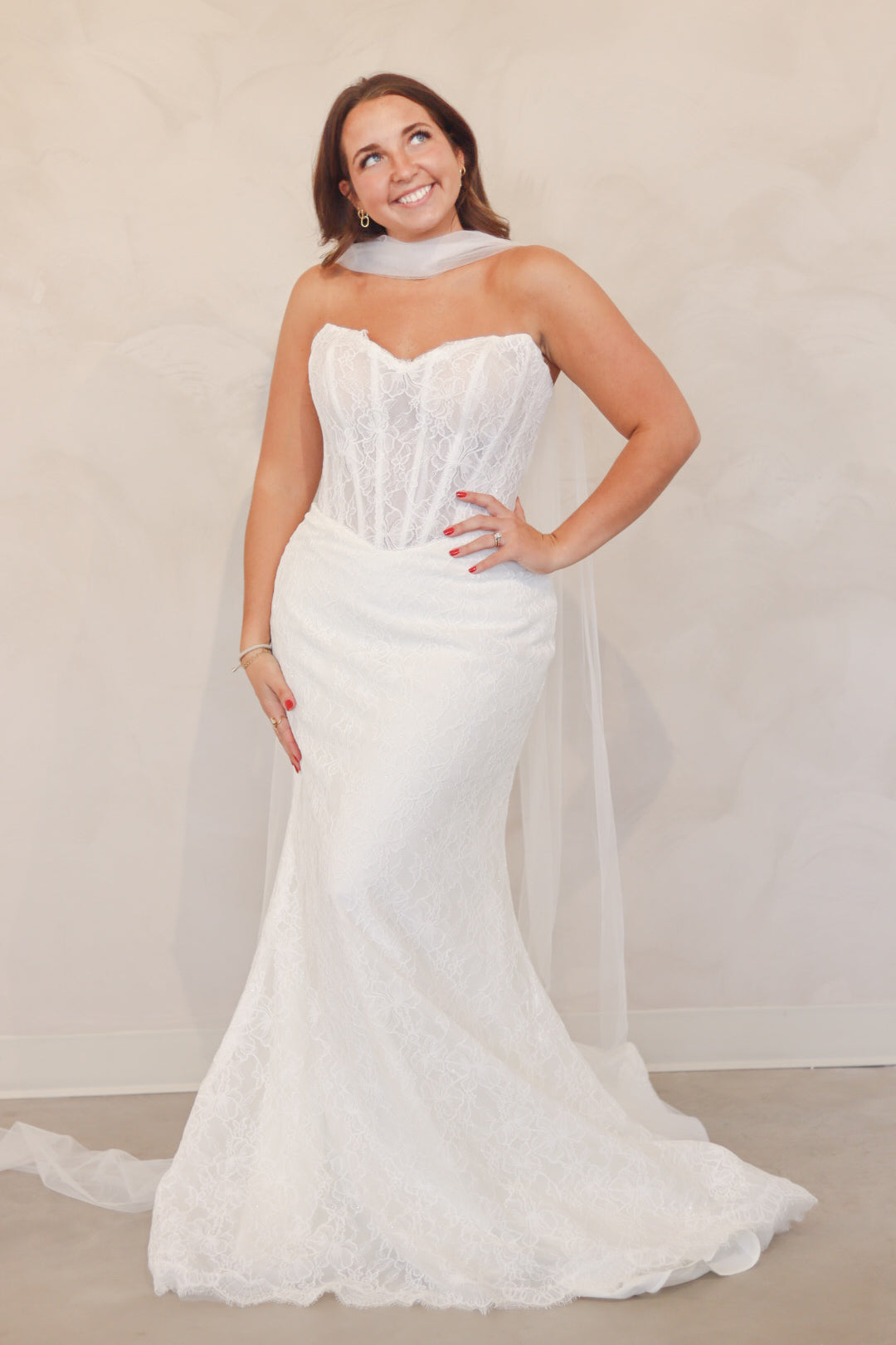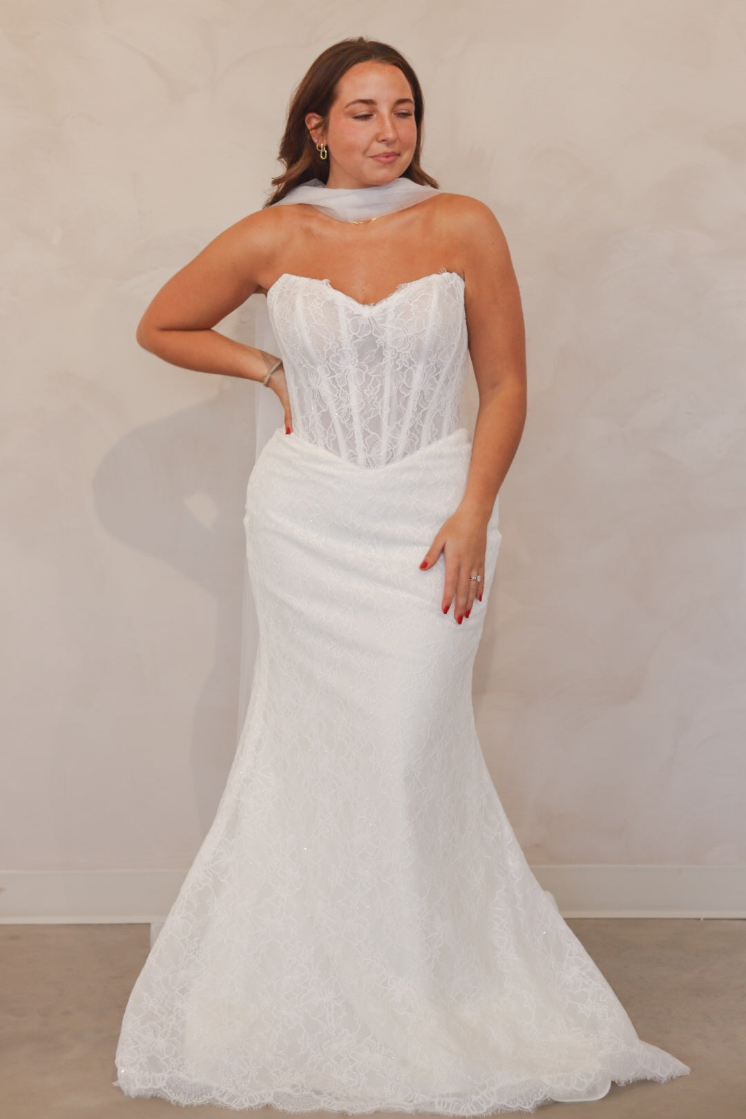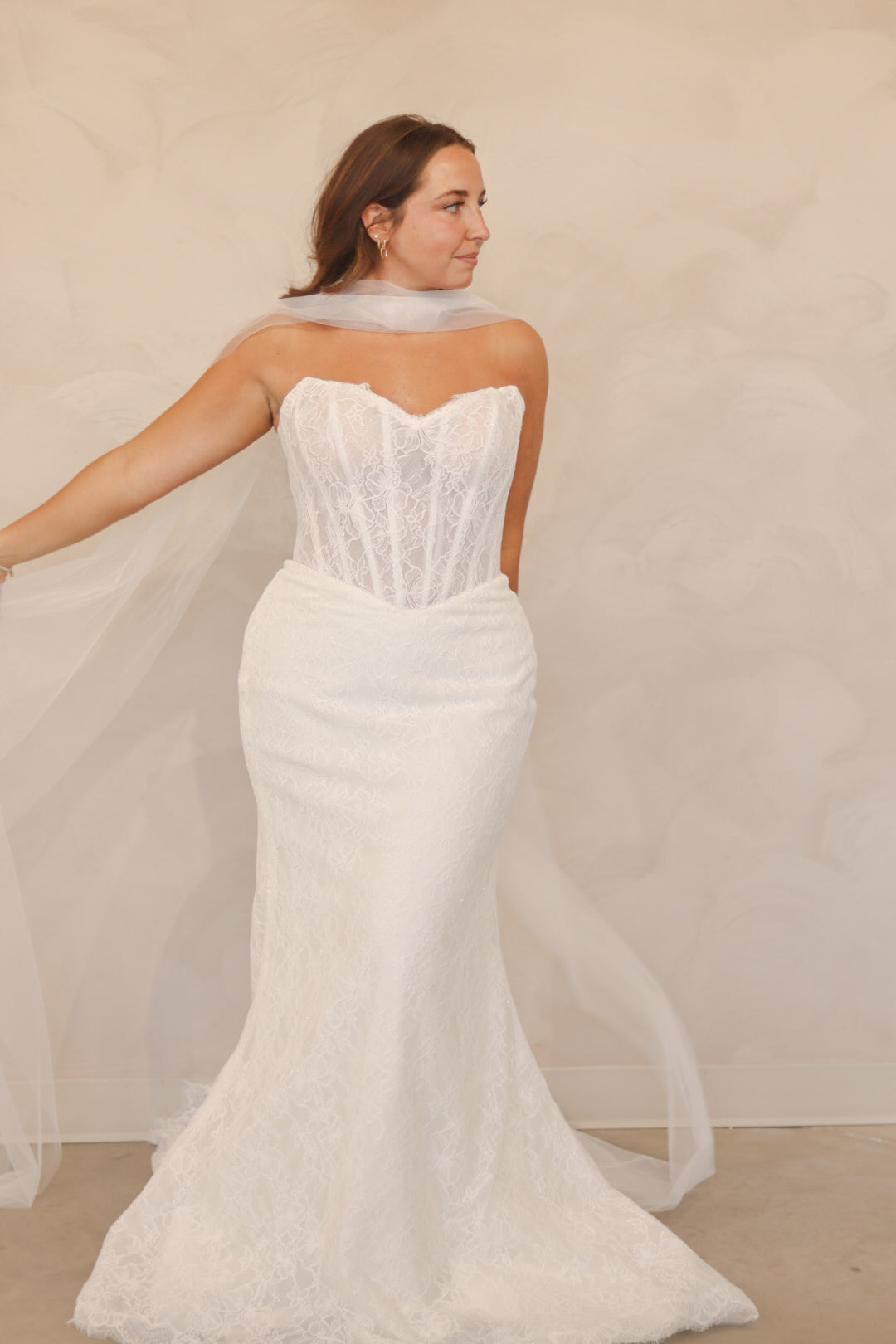 Rosemary features a fitted lace silhouette that drapes beautifully over the body, blending structure and softness in the most effortless way. The corset bodice showcases exposed boning and a delicately sculpted neckline, adding dimension and shape while keeping the look ethereal.
