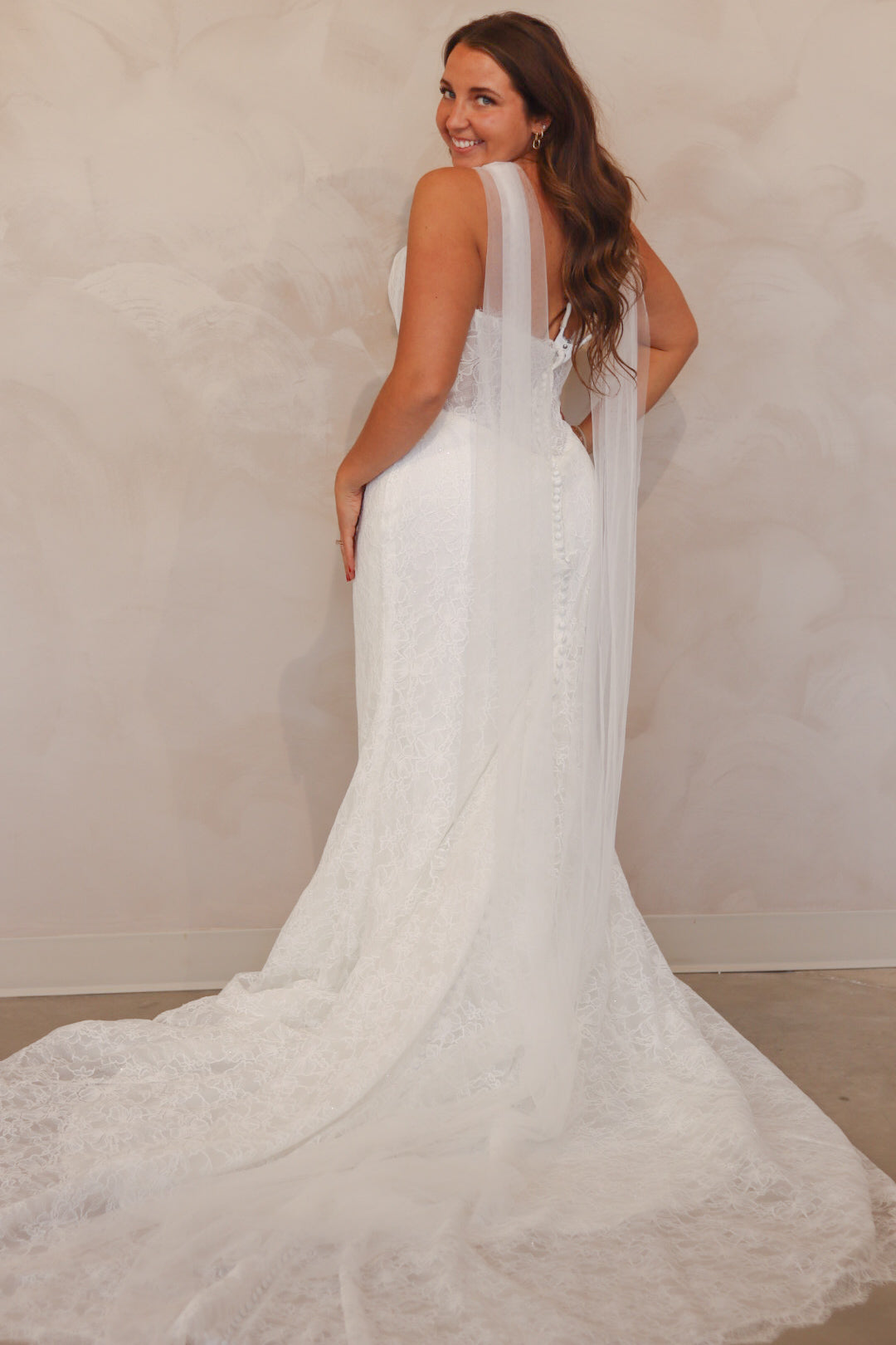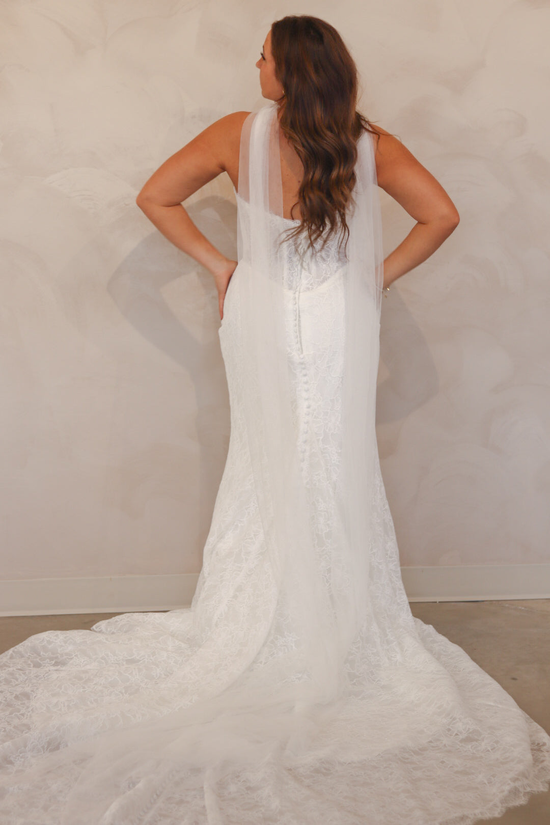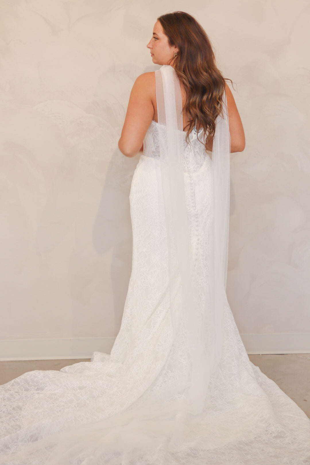 A layer of trailing floral lace extends from bodice to hem, creating a seamless, organic texture. The detachable tulle cape adds instant drama — floating behind in a cathedral-length sweep that feels angelic and unforgettable. Whether worn with or without the cape, Rosemary exudes quiet luxury and timeless romantic energy.