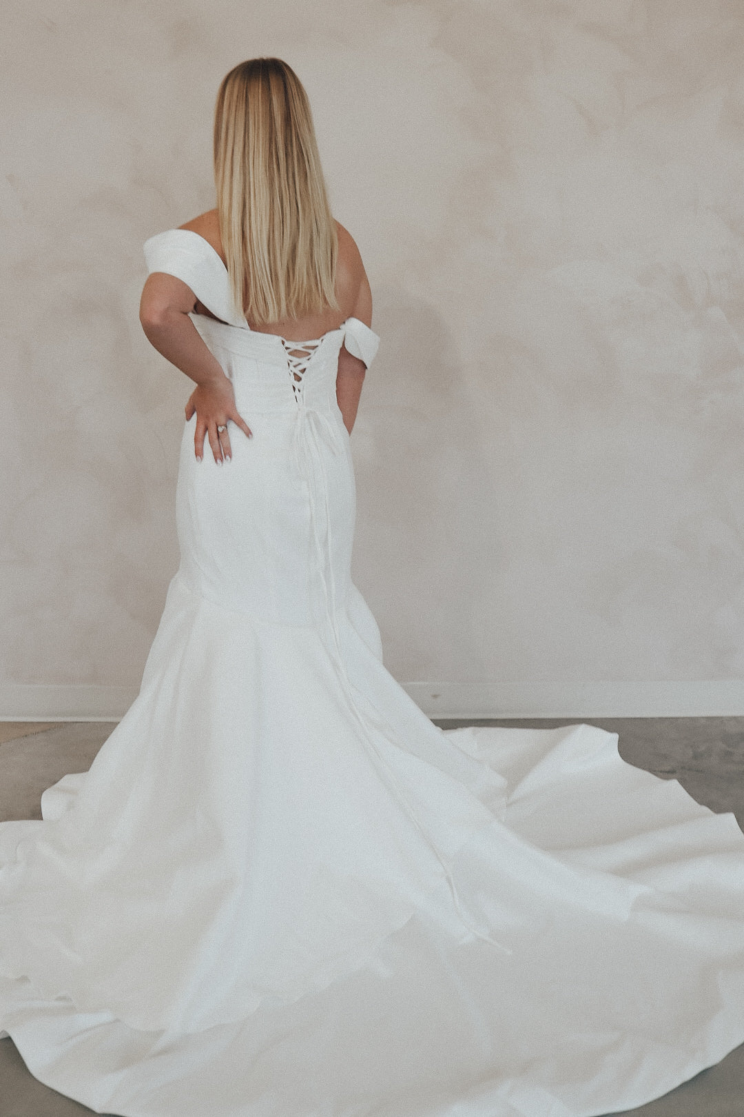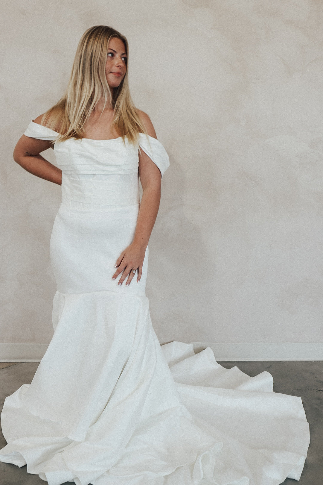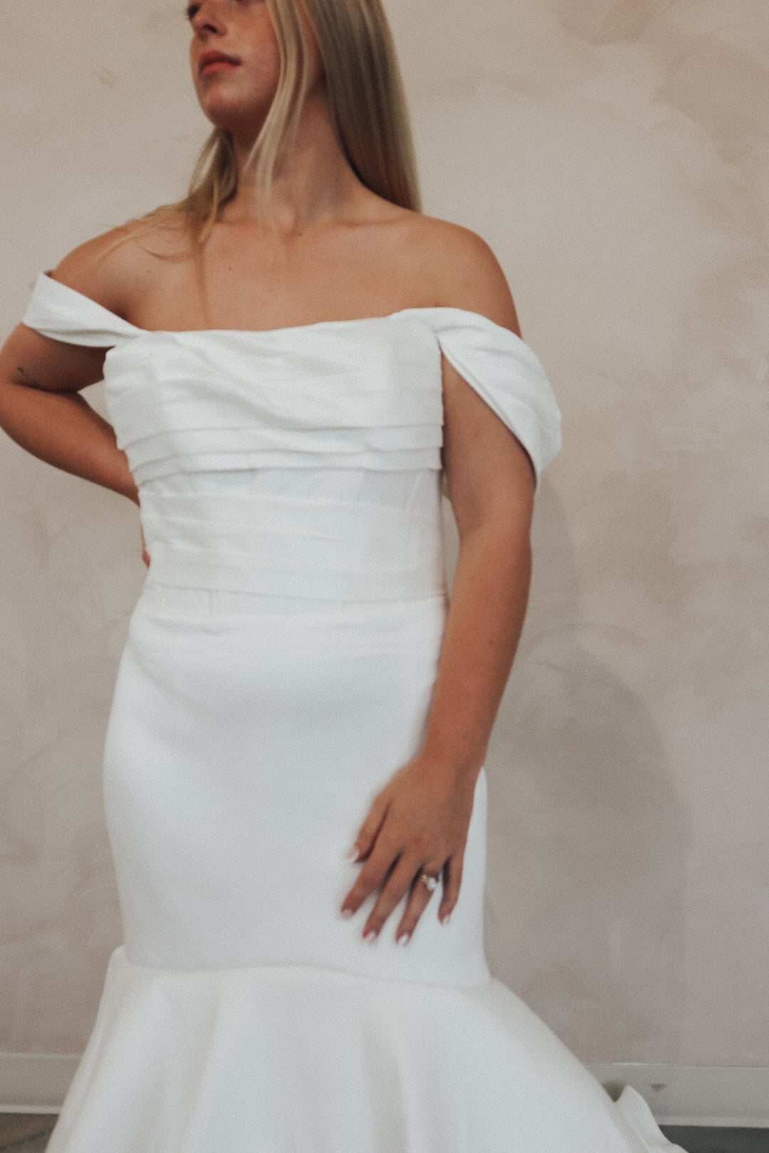 Sunday is a modern classic with a touch of romance — a clean, structured satin gown designed with effortless elegance in mind. The off-the-shoulder neckline drapes softly across the arms, creating a timeless portrait shape while still feeling fresh and current. Strategic pleating through the bodice adds dimension and flatters the waist, leading into a fitted silhouette that flares into a dramatic, sweeping train.